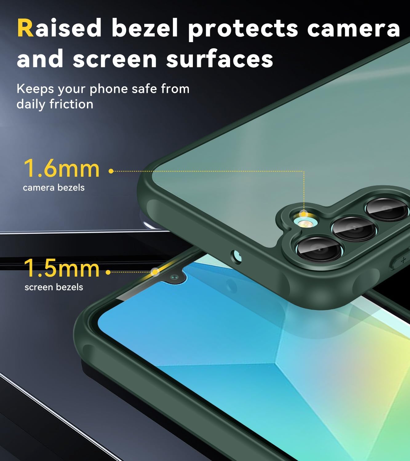 • 【Защита от военен клас】С повдигнати ръбове, достатъчно големи, за да повдигнат екрана и камерата от равна повърхност, за да предпазят предния екран и задната камера от счупване или напукване. Вътрешният микрофибърен омекотяващ слой може да смекчи външните сили и драскотините от гърба по време на употреба.