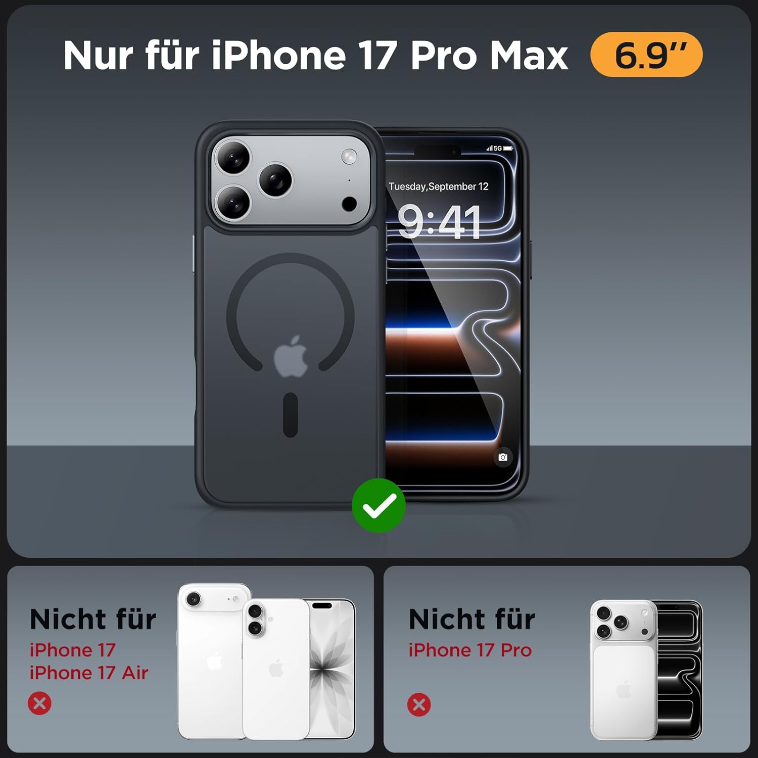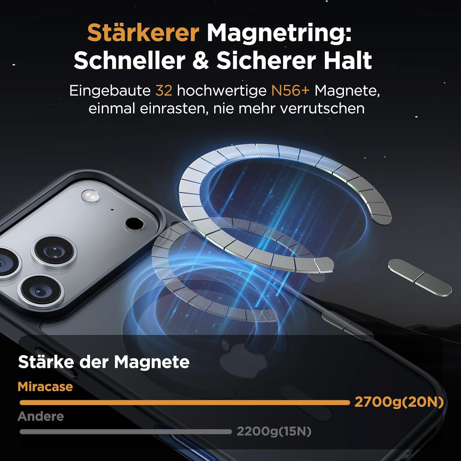 Кейс Miracase за iPhone 17 Pro Max с Magsafe [със закалено стъкло] [Най-добра военна защита и магнитна сила] Удароустойчив, устойчив на надраскване, с кадифено усещане, калъф за мобилен телефон за iPhone 17 Pro Max