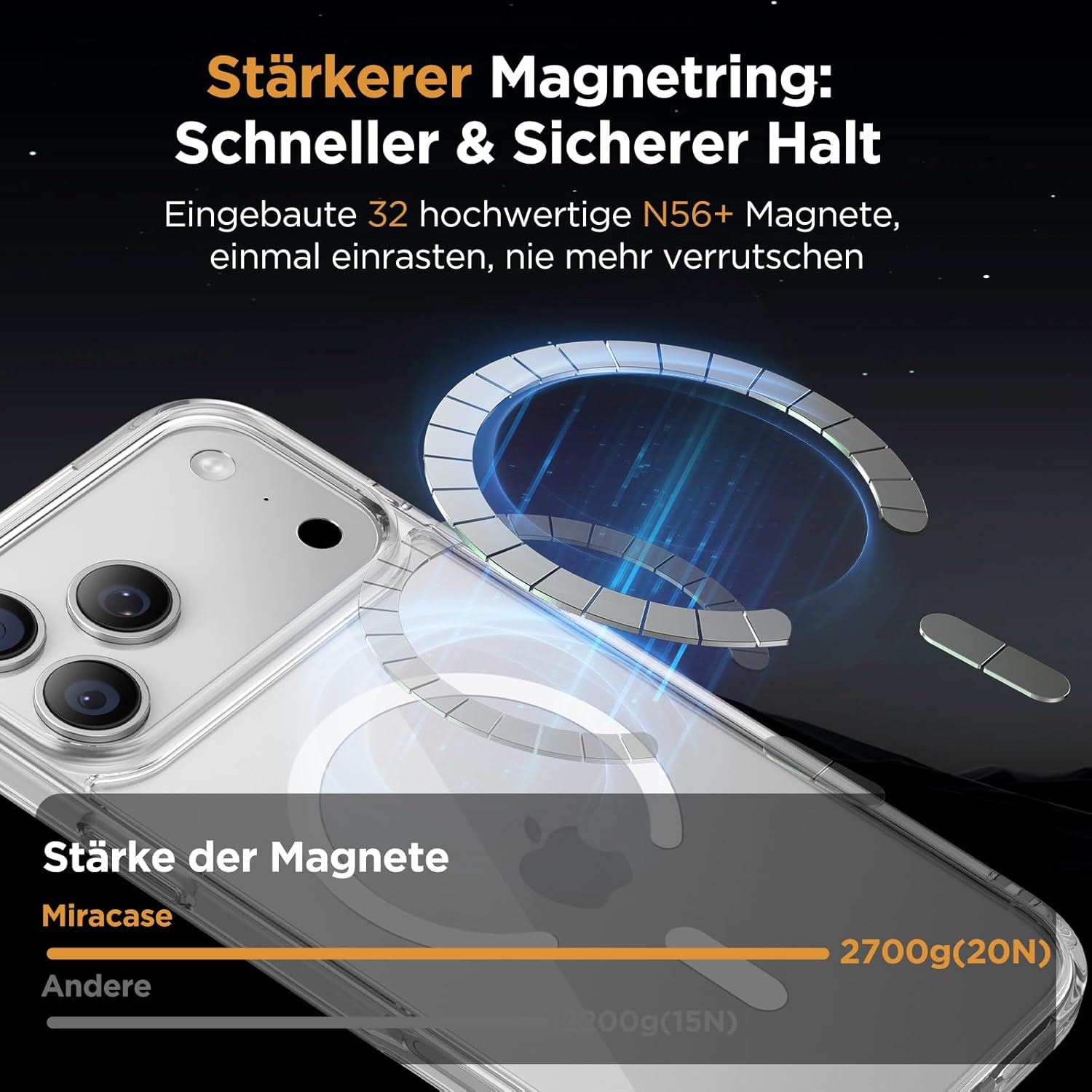 • Подобрена съвместимост с MagSafe: Специално проектиран калъф за iPhone 17 (6,3 инча): Интегрирана магнитна система 38 × N56+ с иновативен фокусен пръстен – 55% по-силно залепване от стандартните калъфи. Безпроблемно подравняване със зарядни устройства MagSafe за сигурно бързо зареждане от 25 W+, както и стабилно задържане на всички устройства MagSafe.