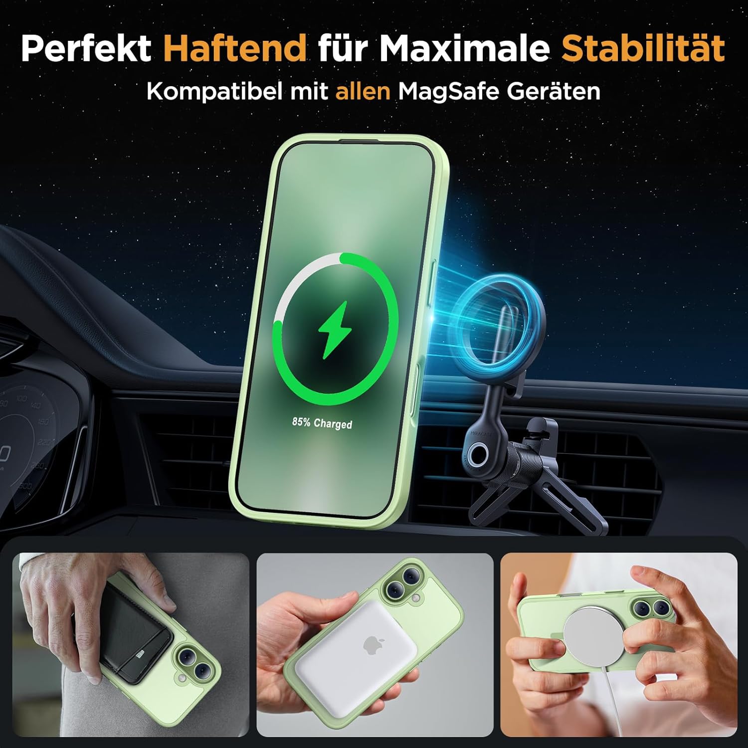 • Подобрена съвместимост с MagSafe: Специално проектиран калъф за iPhone 17 (6,3 инча): Интегрирана магнитна система 38 × N56+ с иновативен фокусен пръстен – 55% по-силно залепване от стандартните калъфи. Безпроблемно подравняване със зарядни устройства MagSafe за сигурно бързо зареждане от 25 W+, както и стабилно задържане на всички устройства MagSafe.