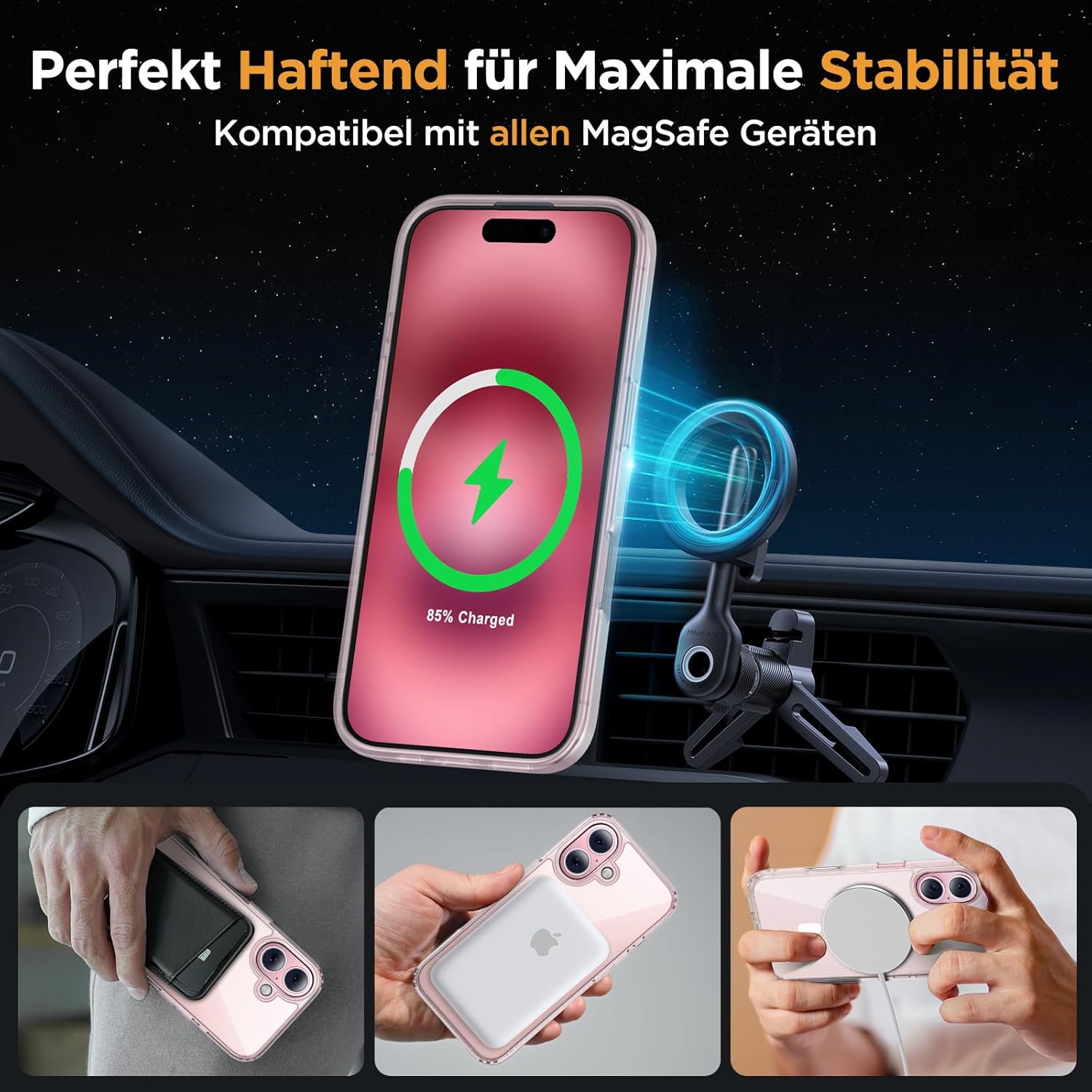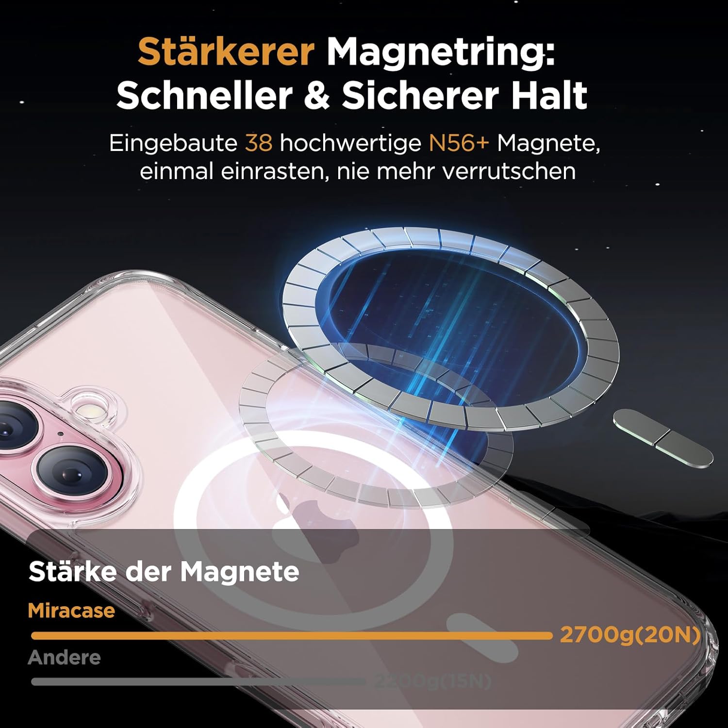 • Подобрена съвместимост с MagSafe: Специално проектиран калъф за iPhone 17 (6,3 инча): Интегрирана магнитна система 38 × N56+ с иновативен фокусен пръстен – 55% по-силно залепване от стандартните калъфи. Безпроблемно подравняване със зарядни устройства MagSafe за сигурно бързо зареждане от 25 W+, както и стабилно задържане на всички устройства MagSafe.