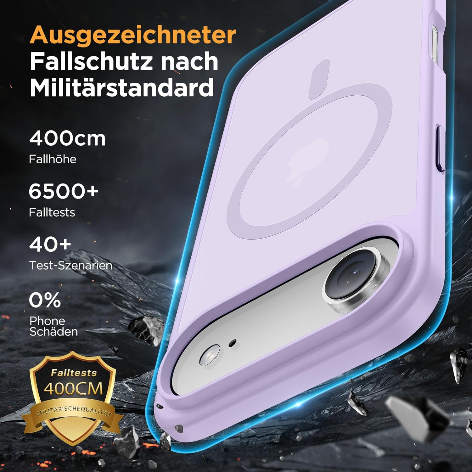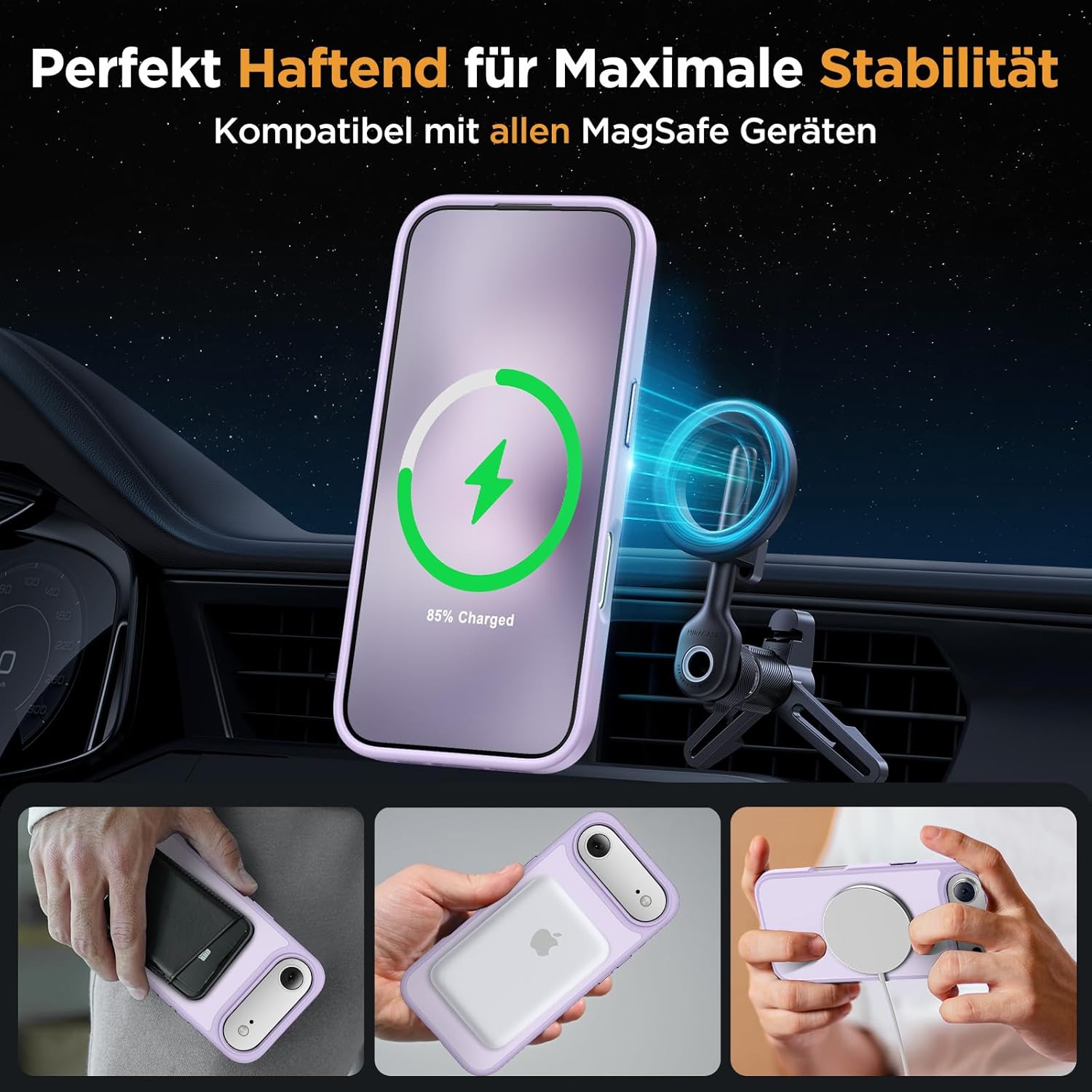 • Подобрена съвместимост с MagSafe: Специално проектиран калъф за iPhone 17 (6,3 инча): Интегрирана магнитна система 38 × N56+ с иновативен фокусен пръстен – 55% по-силно залепване от стандартните калъфи. Безпроблемно подравняване със зарядни устройства MagSafe за сигурно бързо зареждане от 25 W+, както и стабилно задържане на всички устройства MagSafe.