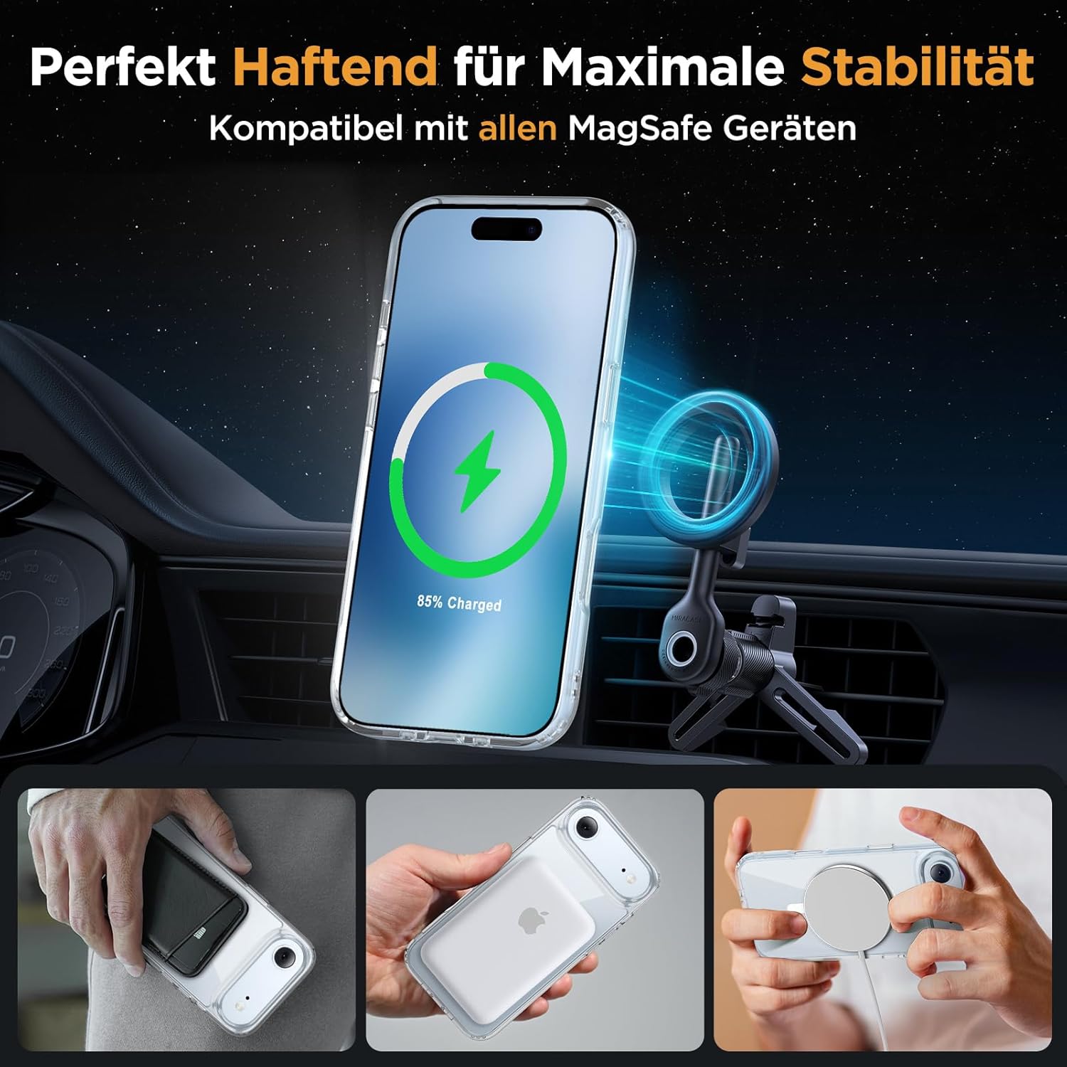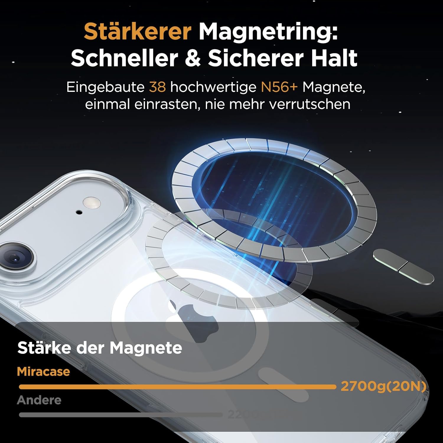 • Подобрена съвместимост с MagSafe: Специално проектиран калъф за iPhone 17 (6,3 инча): Интегрирана магнитна система 38 × N56+ с иновативен фокусен пръстен – 55% по-силно залепване от стандартните калъфи. Безпроблемно подравняване със зарядни устройства MagSafe за сигурно бързо зареждане от 25 W+, както и стабилно задържане на всички устройства MagSafe.