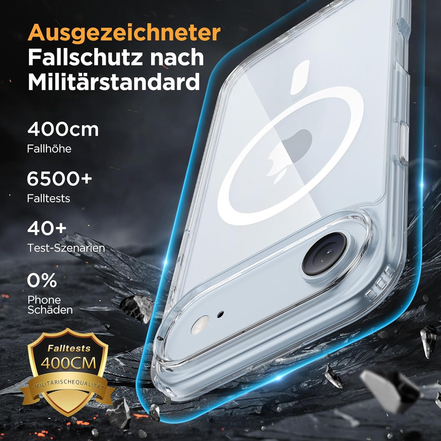 • Защита от падане от военен клас: Превишава военните стандарти MIL-STD-810G: Усъвършенствана технология за устойчивост на удари в четирите ъгъла, комбинирана с 360° въздушна възглавница отвътре и 3-слойна термопластична полиуретанова (TPU) подплата. Осигурява отлична защита срещу падания от височина до 4 метра – потвърдено от над 6500+ теста за падане в над 40 тестови среди.
