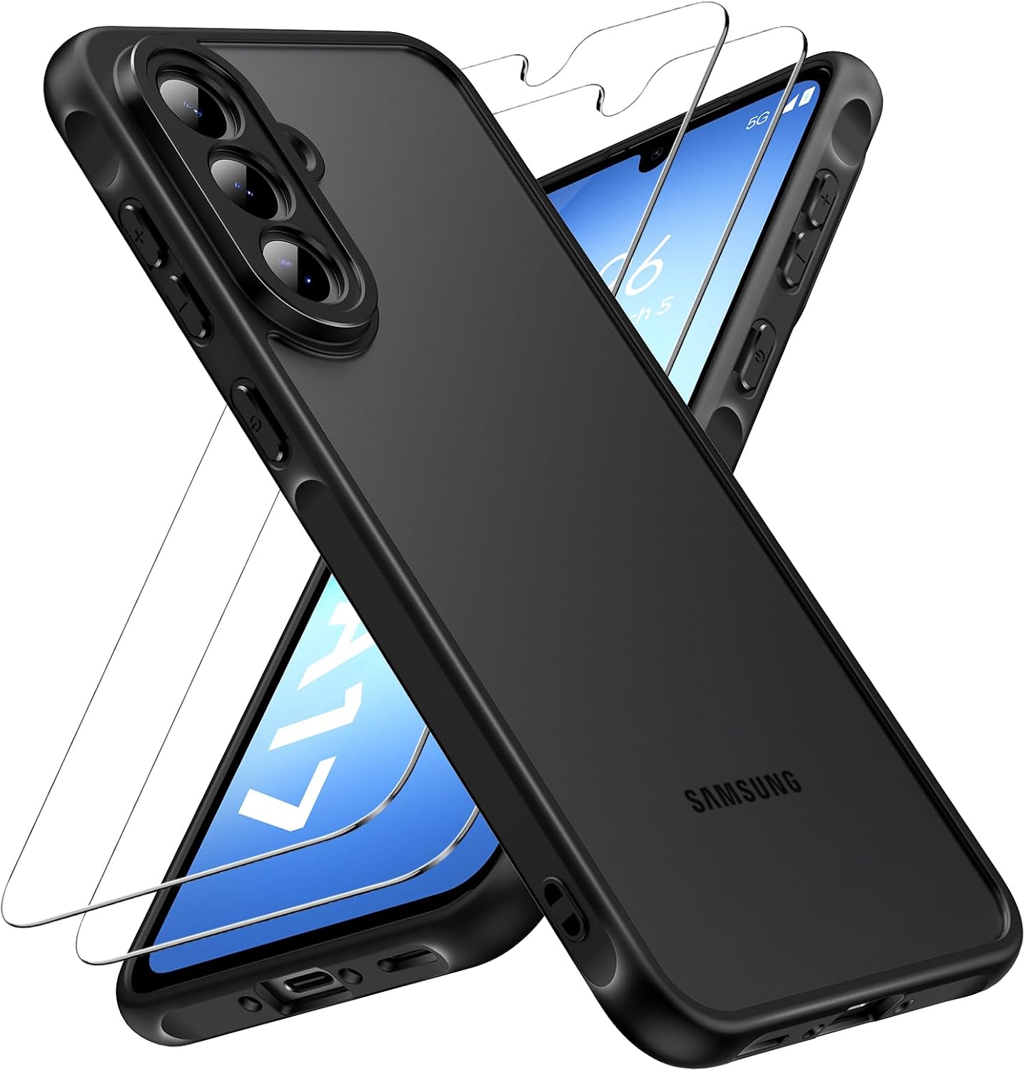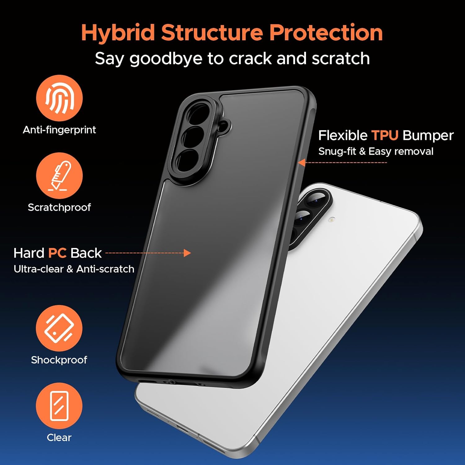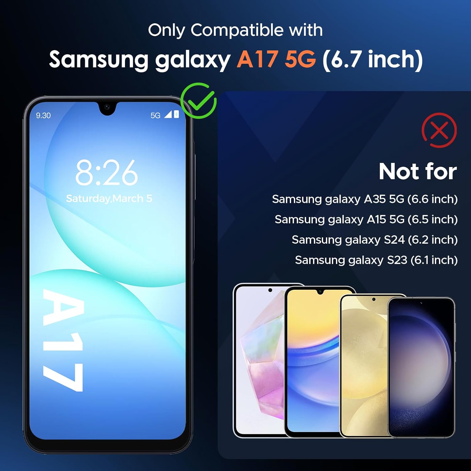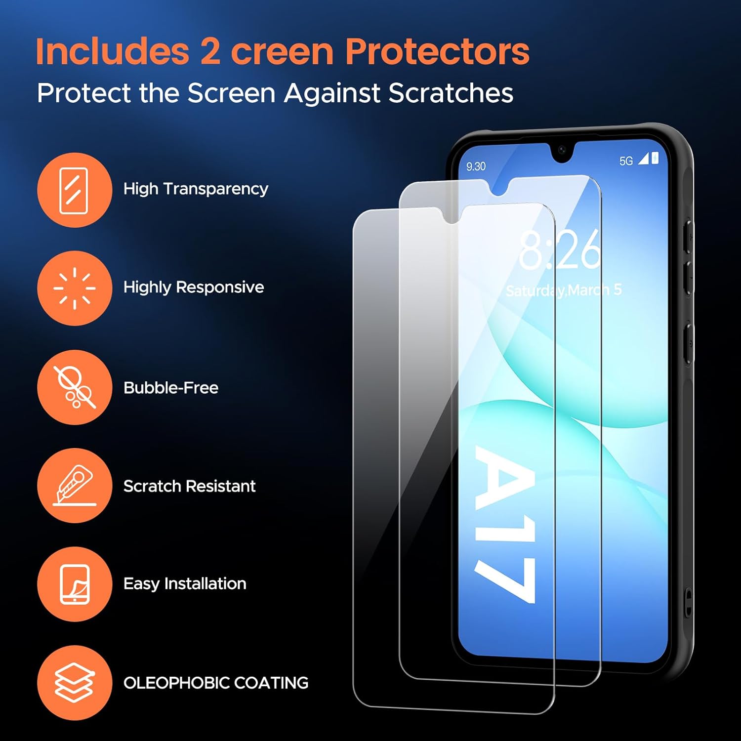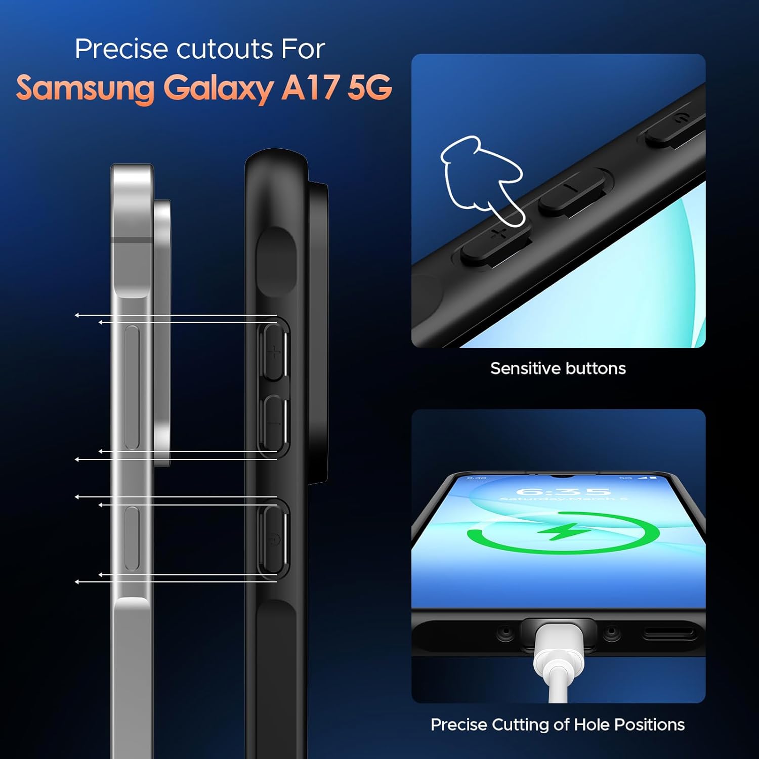 Кейс, съвместим с Samsung Galaxy A17 5G с 2 части закалено стъкло [Защита на камерата] [Удароустойчив] Кейс за мобилен телефон, матов прозрачен гръб, защитен калъф против пръстови отпечатъци