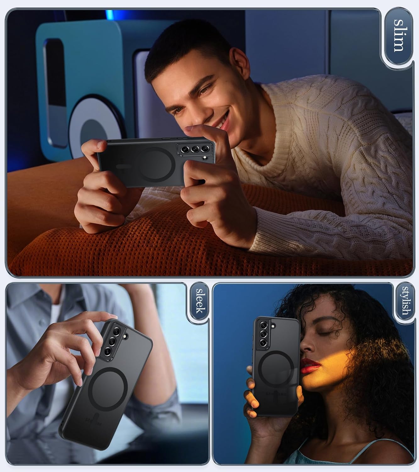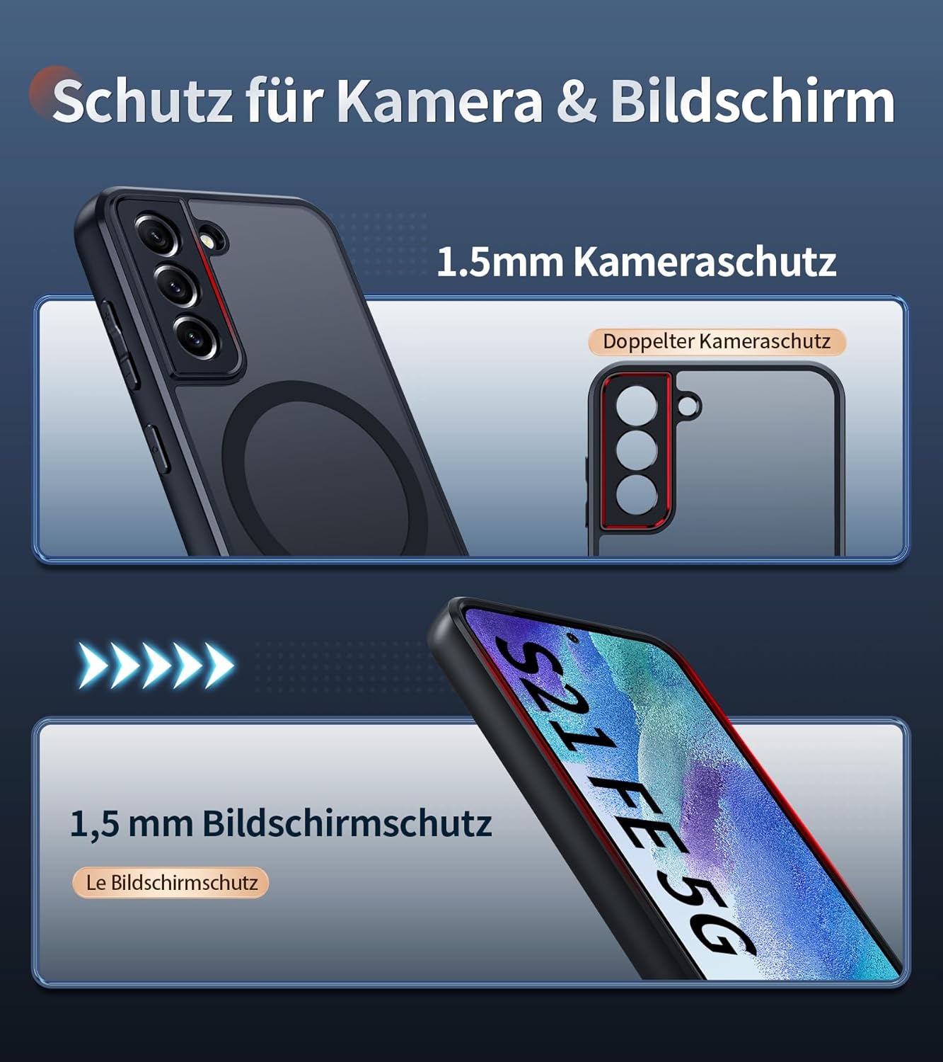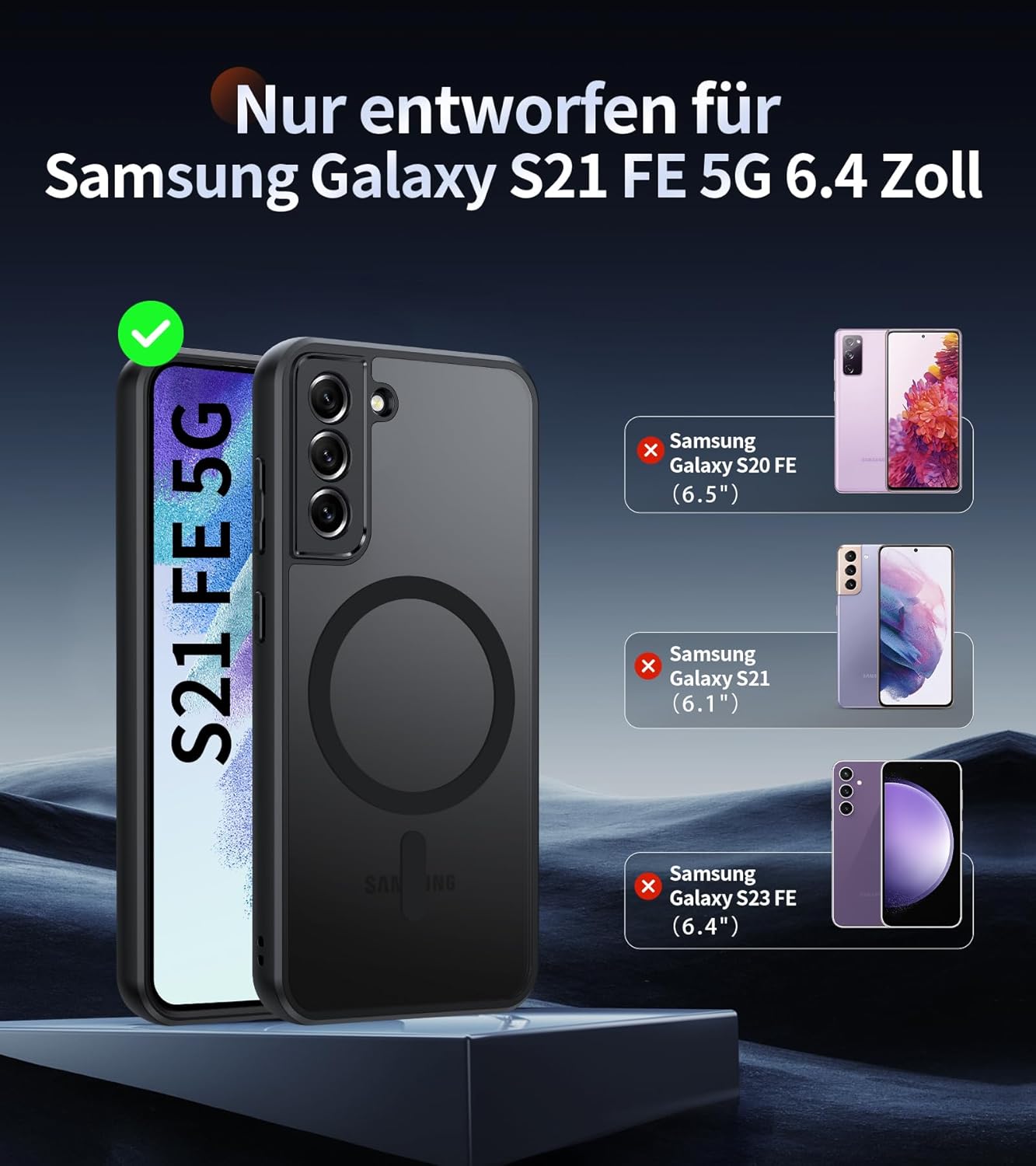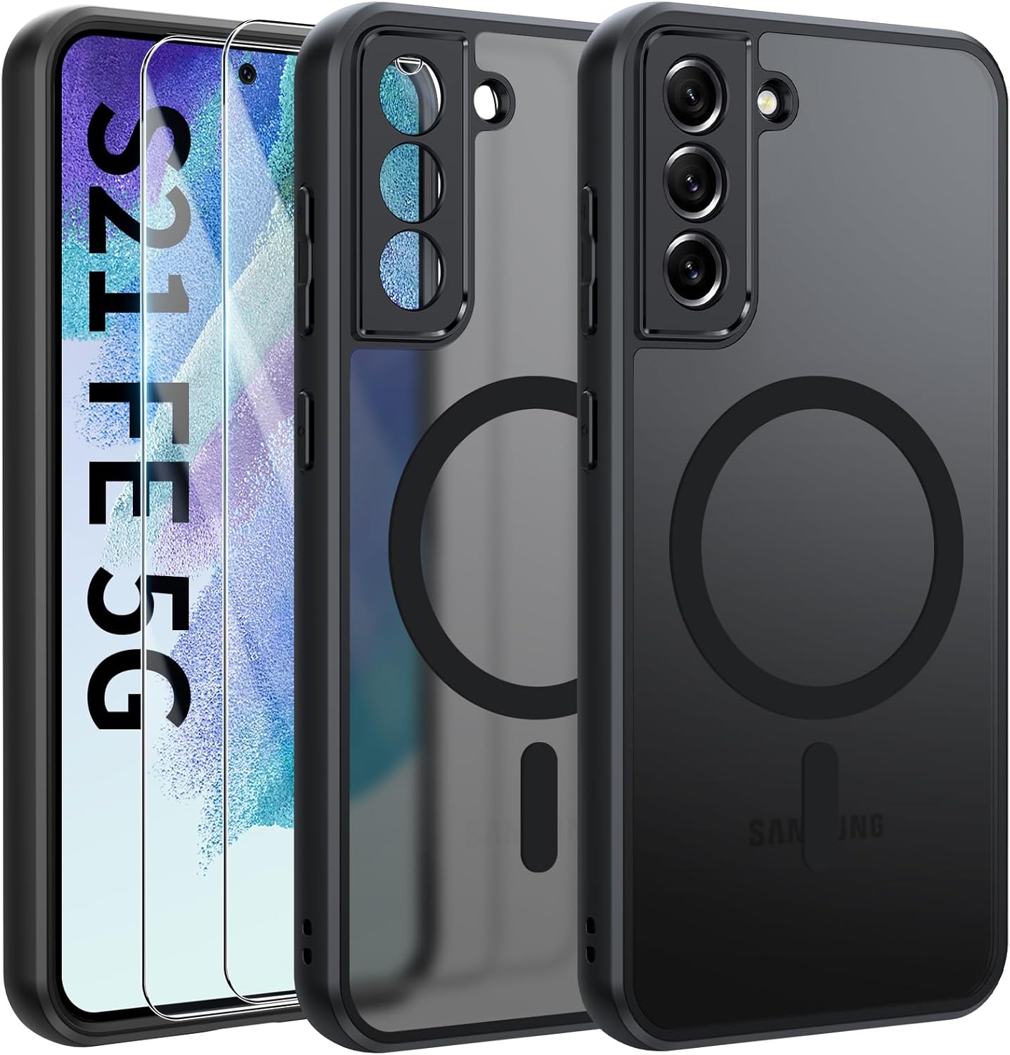 Кейс, съвместим с Samsung Galaxy S21 FE, съвместим с MagSafe с 2 защитни филма, пълна защита на камерата, удароустойчив, тънък, прозрачен матов защитен кейс, черен