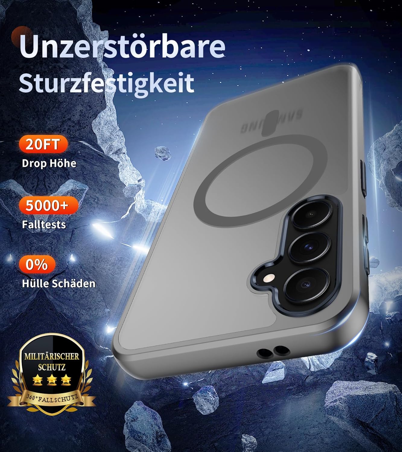 • Стандартна военна защита от падане: корпусът е стриктно тестван, здравият PC гръб и гъвкавият мек TPU броня са устойчиви на удари и повреди при падане отпред или отзад. За да се осигури пълна защита от всички страни, има специално разработени въздушни предпазни ъгли, които абсорбират ударите, повдигнати ръбове на дисплея и рамка на обектива на камерата, за да се осигури подобрена защита от надраскване там, където е наистина важно.