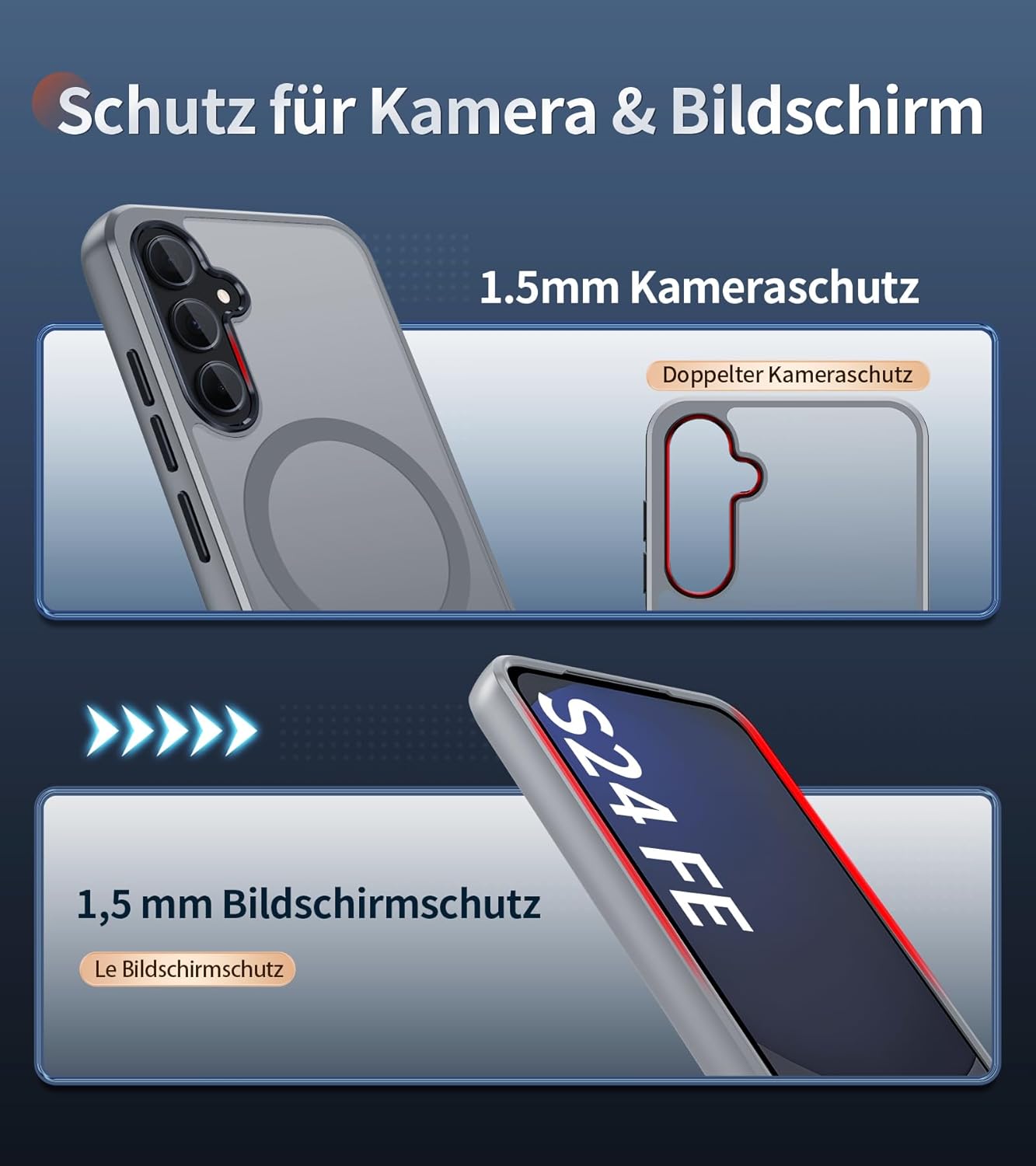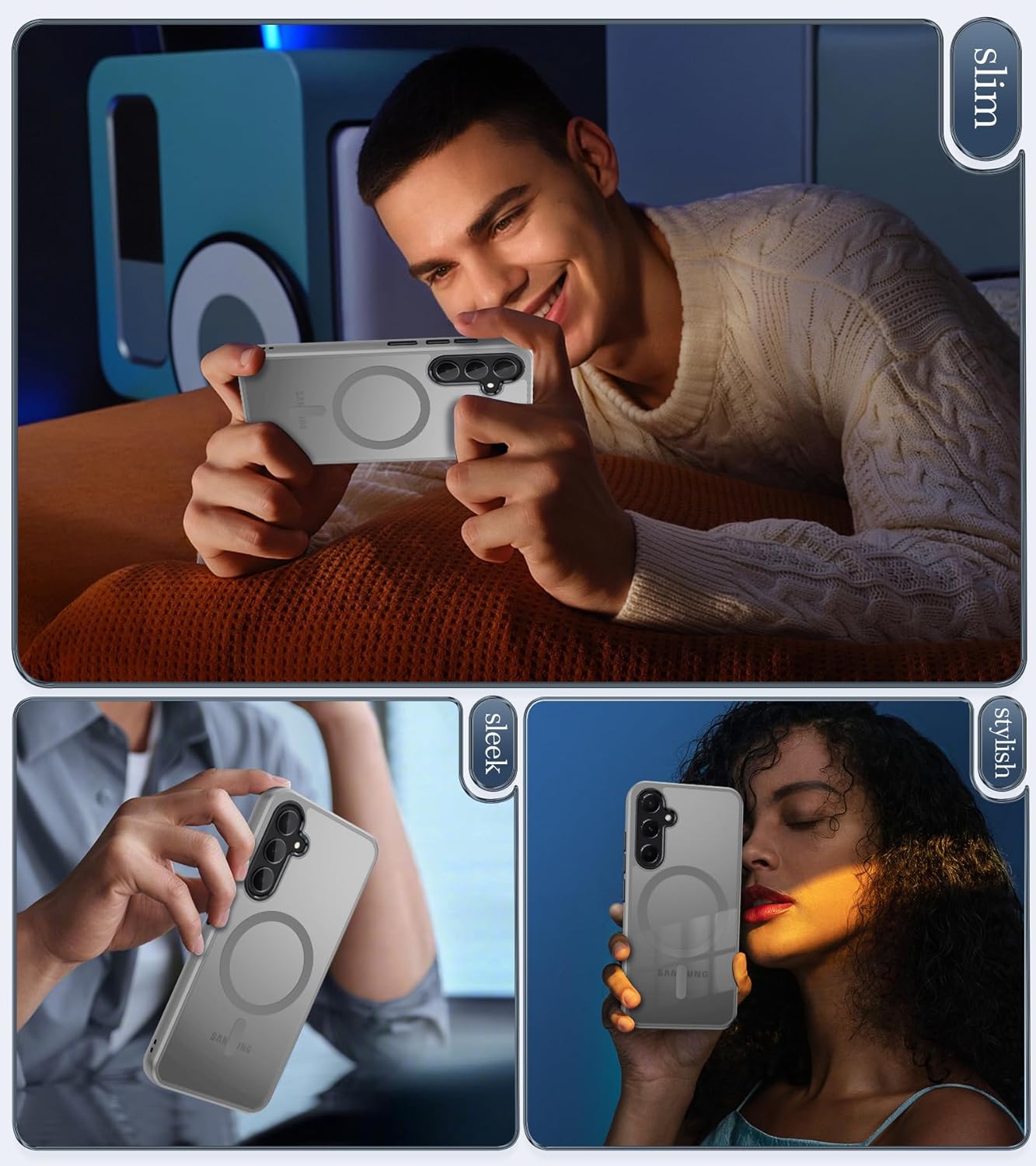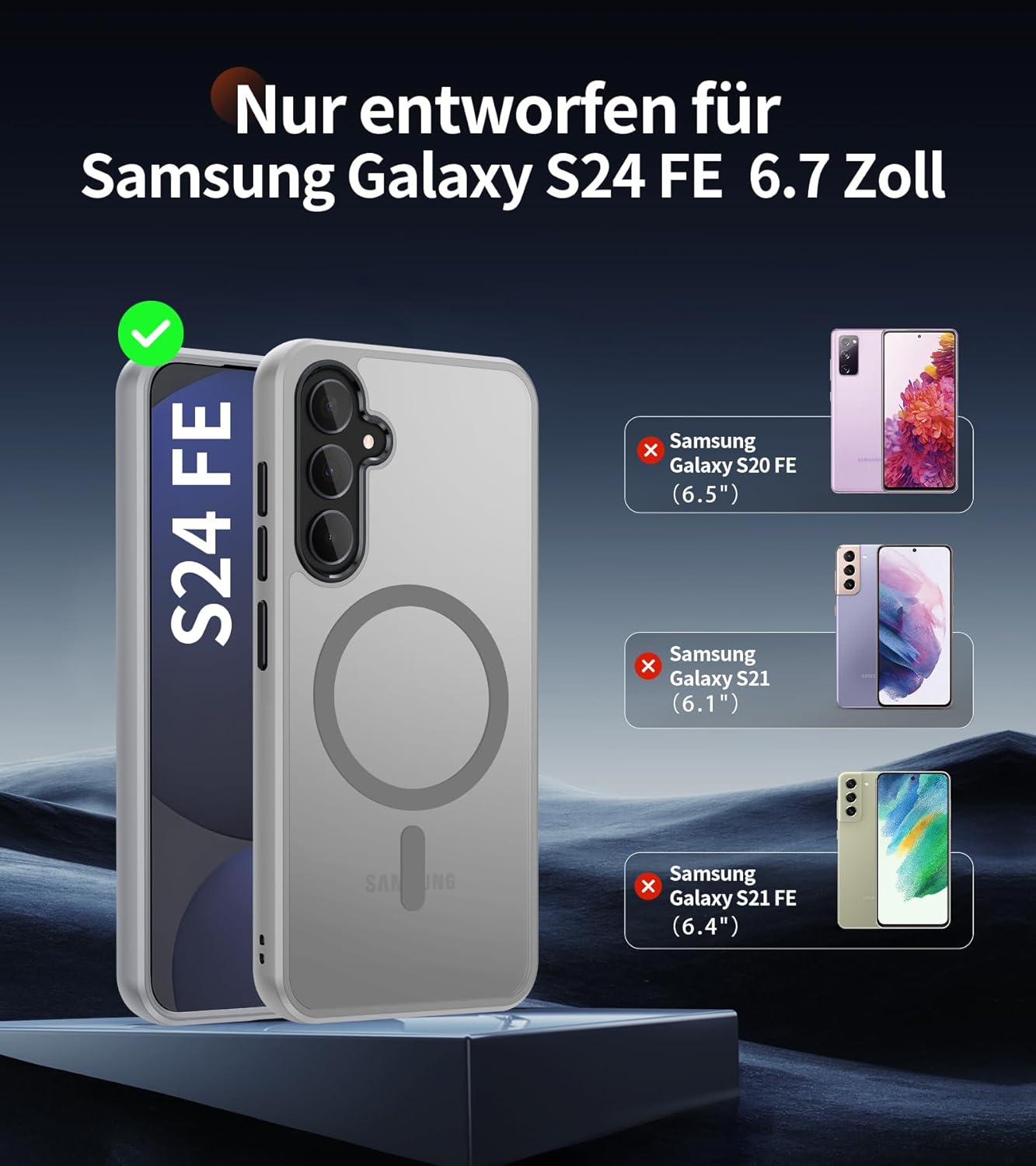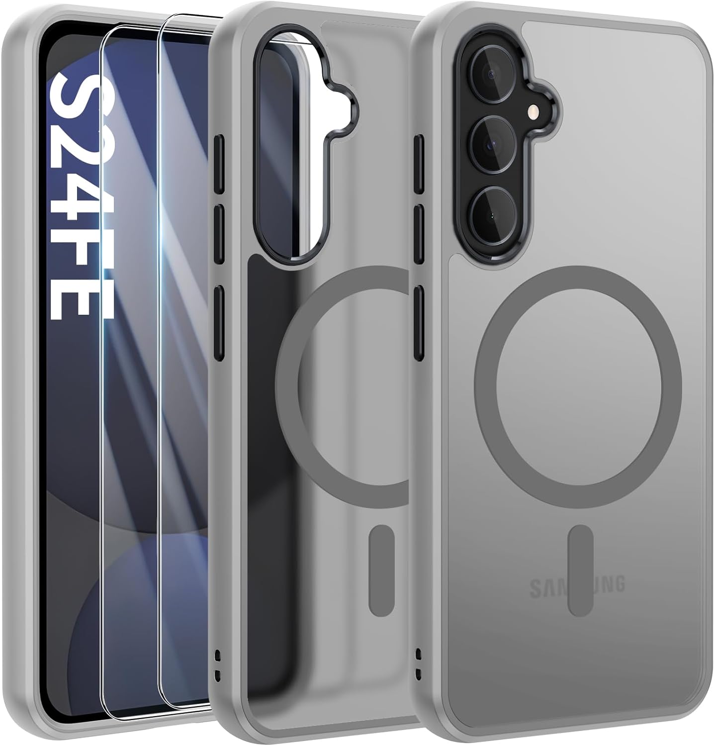 Кейс, съвместим с Samsung Galaxy S24 FE, съвместим с MagSafe с 2 защитни филма, пълна защита на камерата, удароустойчив, тънък, полупрозрачен матов защитен кейс, сив