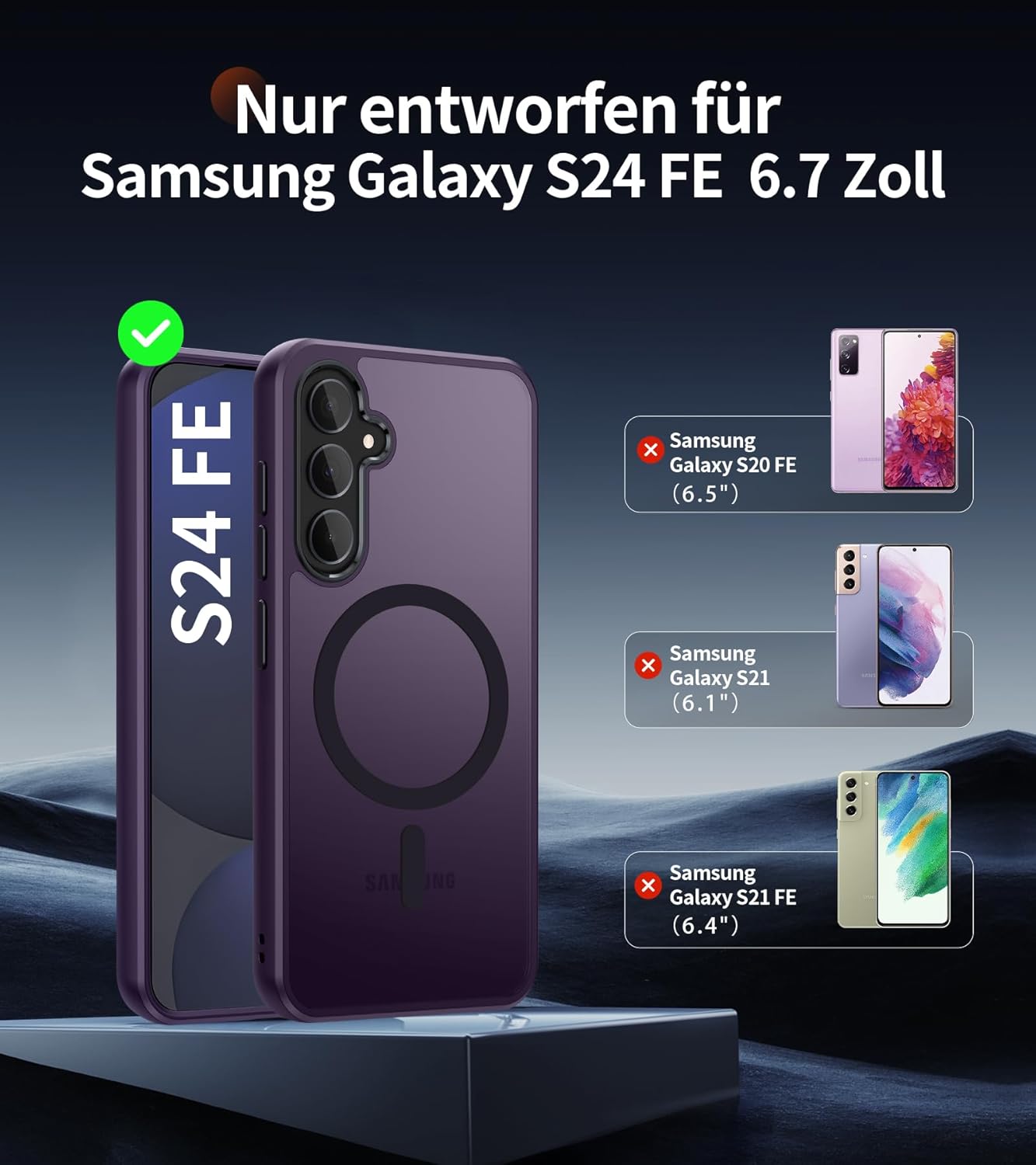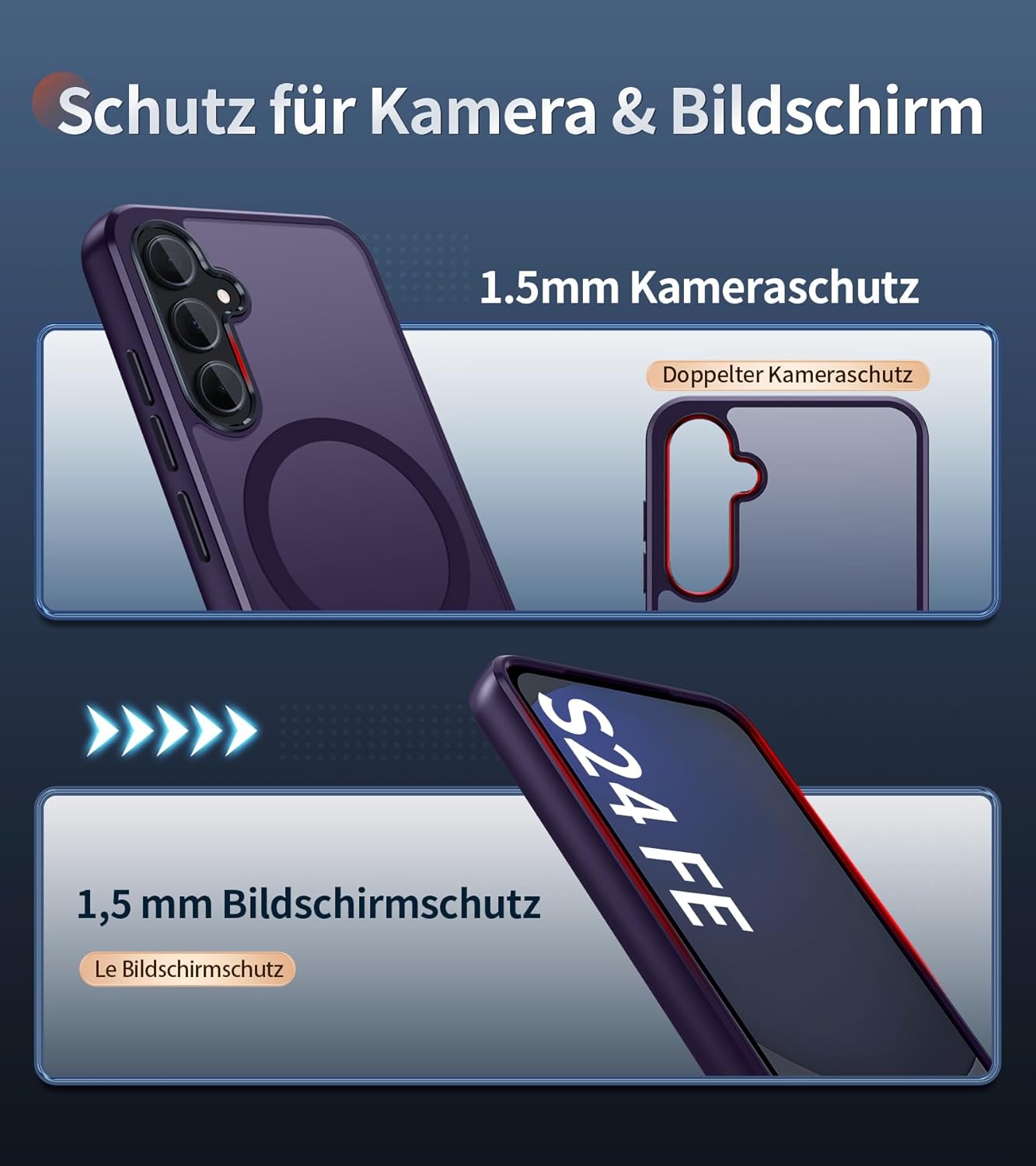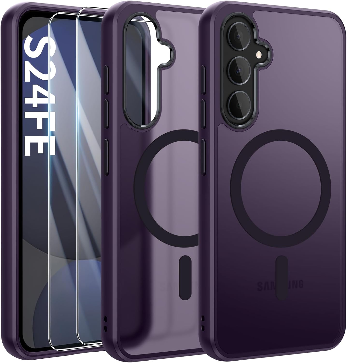 Кейс, съвместим с Samsung Galaxy S24 FE, съвместим с MagSafe с 2 защитни филма, пълна защита на камерата, удароустойчив, тънък, полупрозрачен матов защитен кейс, тъмно лилав