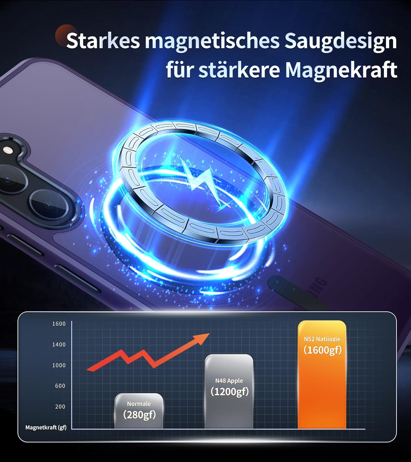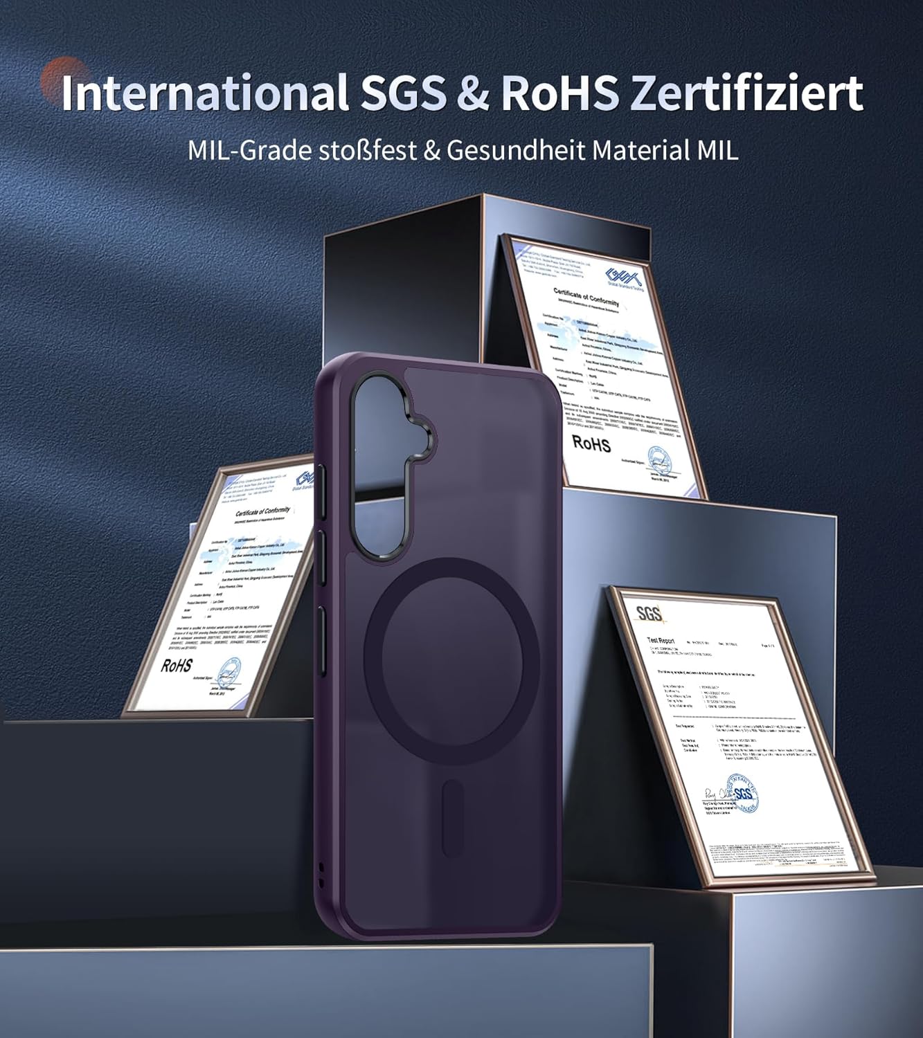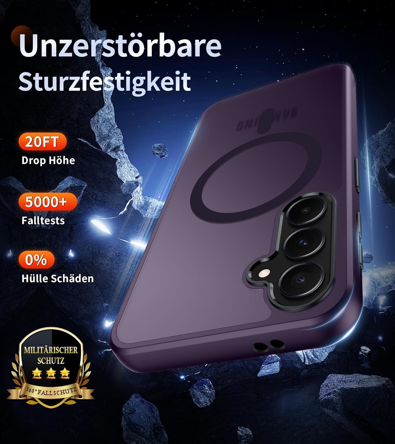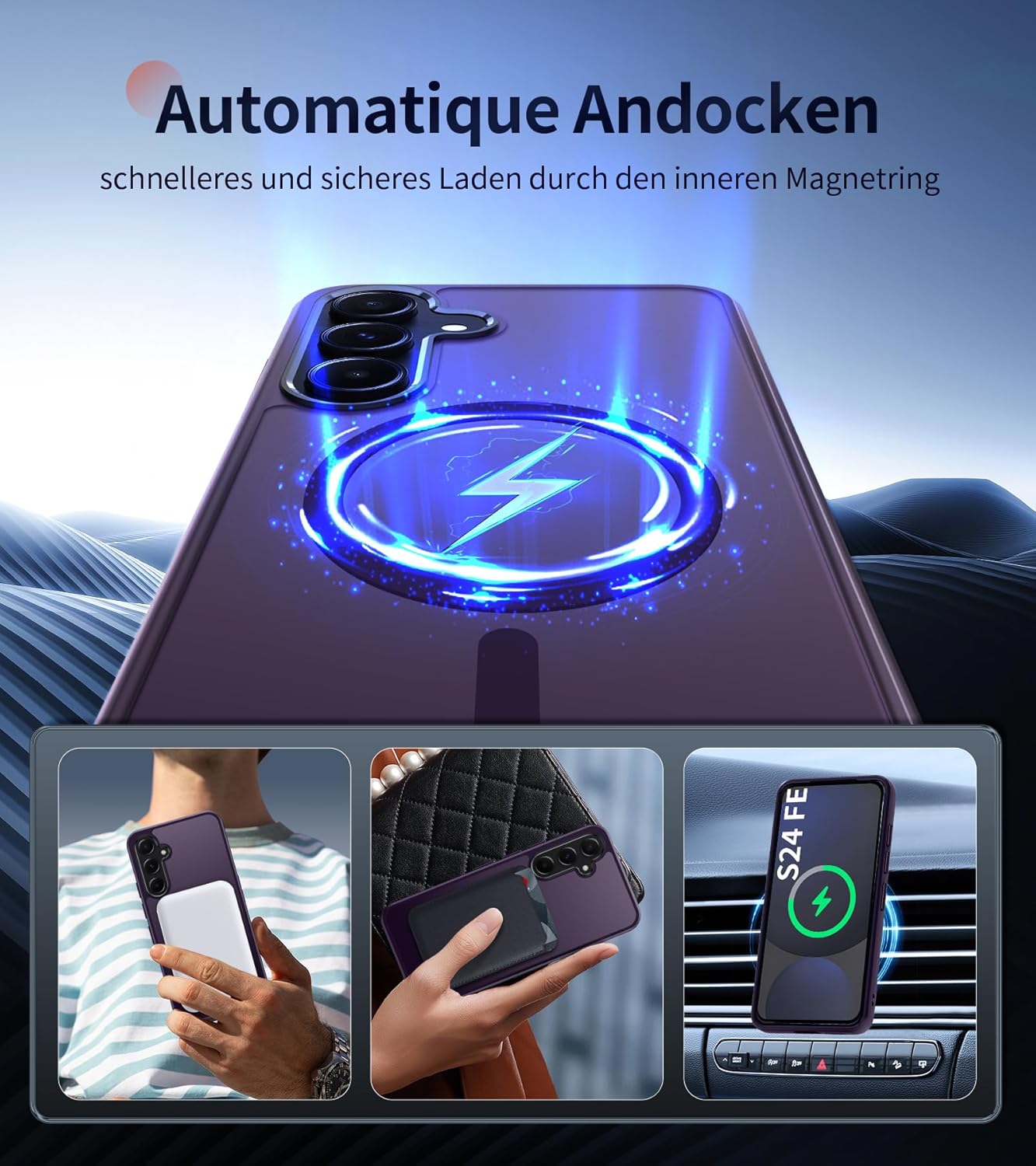 Кейс, съвместим с Samsung Galaxy S24 FE, съвместим с MagSafe с 2 защитни филма, пълна защита на камерата, удароустойчив, тънък, полупрозрачен матов защитен кейс, тъмно лилав