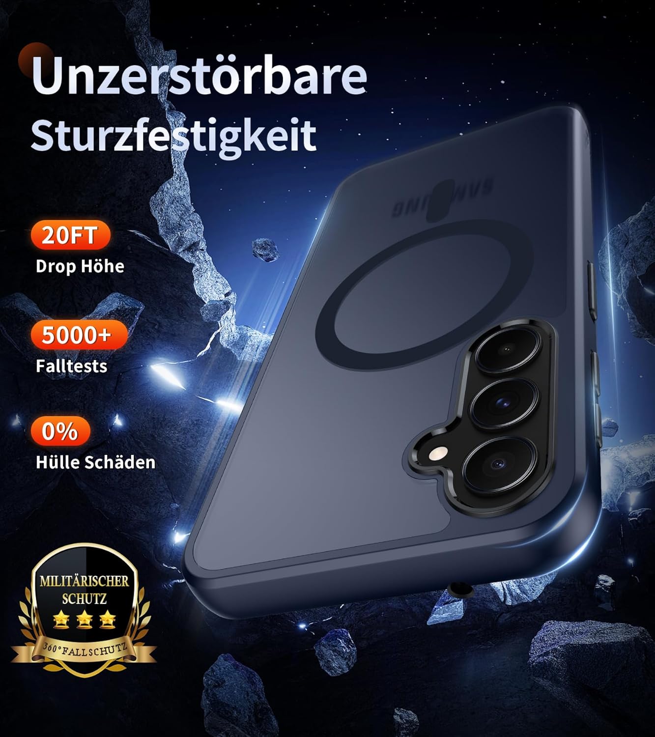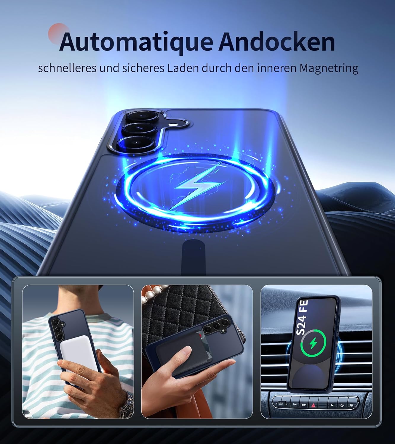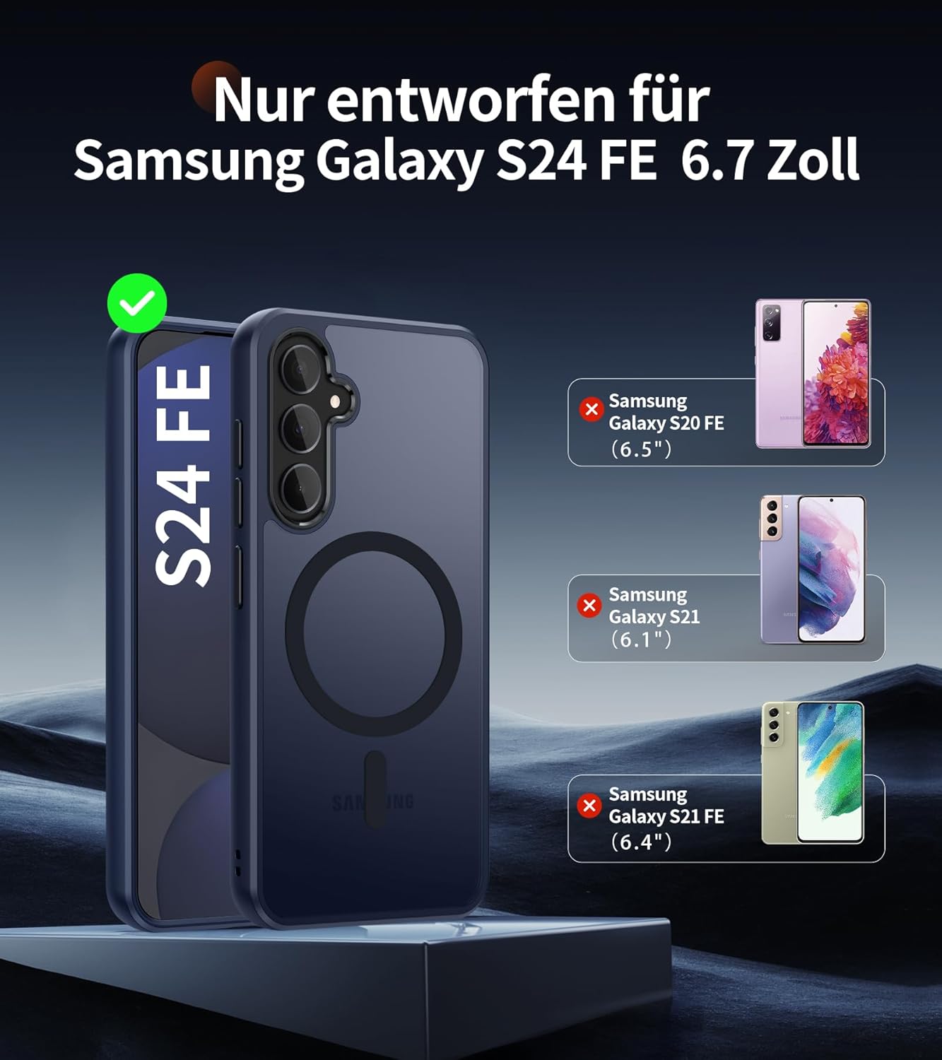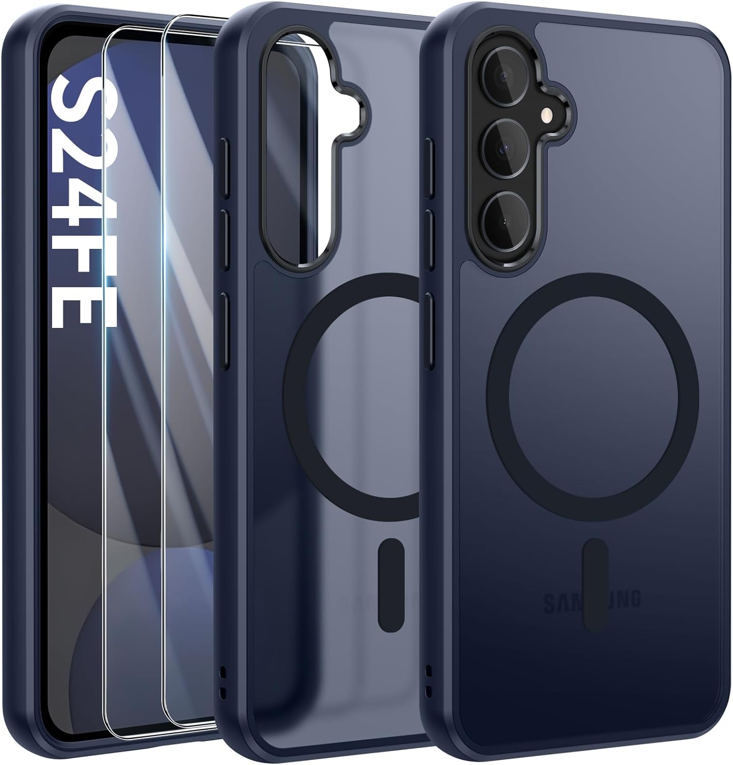 Кейс, съвместим с Samsung Galaxy S24 FE, съвместим с MagSafe с 2 защитни филма, пълна защита на камерата, удароустойчив, тънък, прозрачен матов защитен кейс, тъмносин