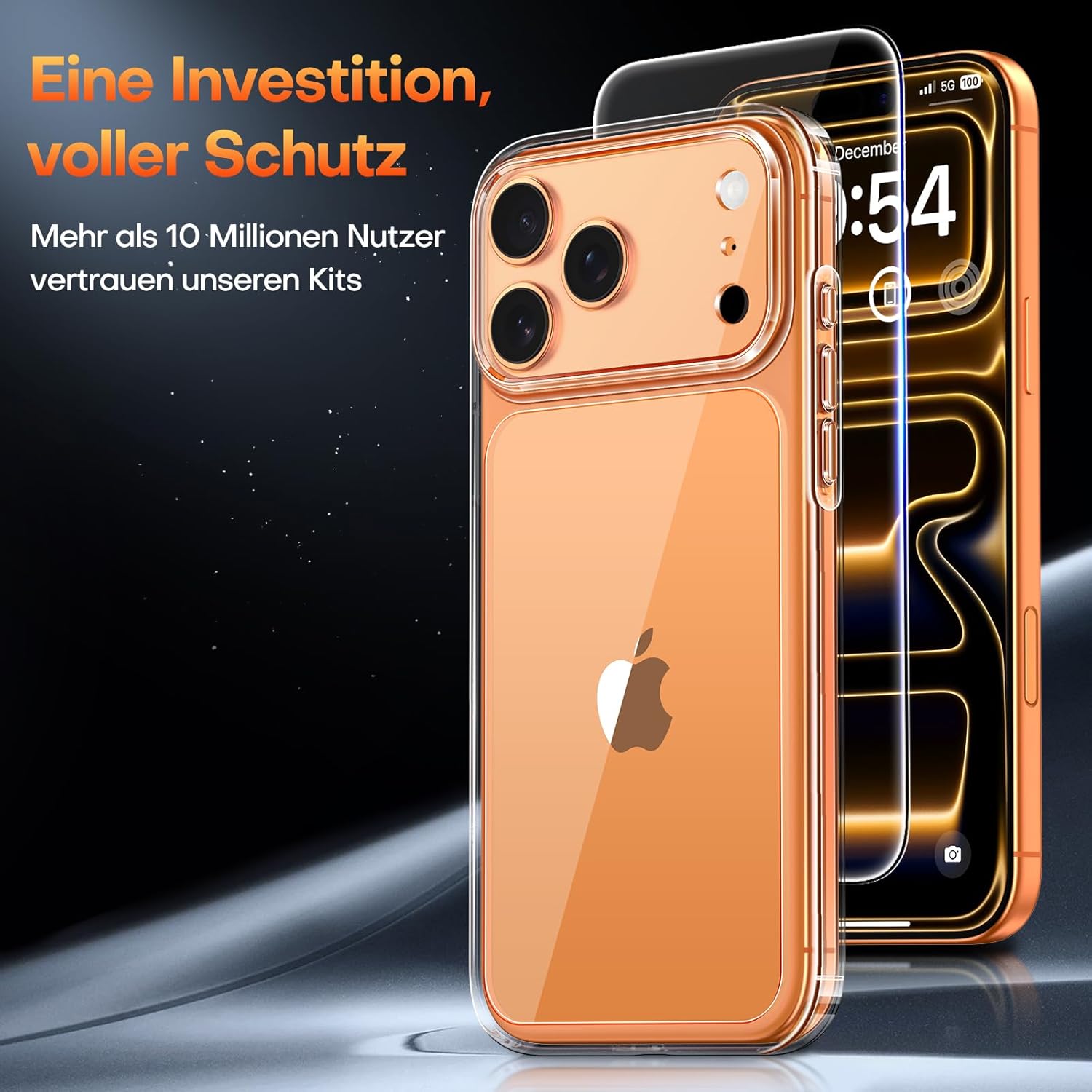 • 2 в 1, 360° цялостна защита: Този удароустойчив комплект за iPhone 17 Pro, включващ висококачествено закалено стъкло 9H, предпазва екрана на телефона ви от надрасквания и счупване, като същевременно остава ултратънък и предлага приятно и чувствително усещане при допир, сякаш няма защита.
