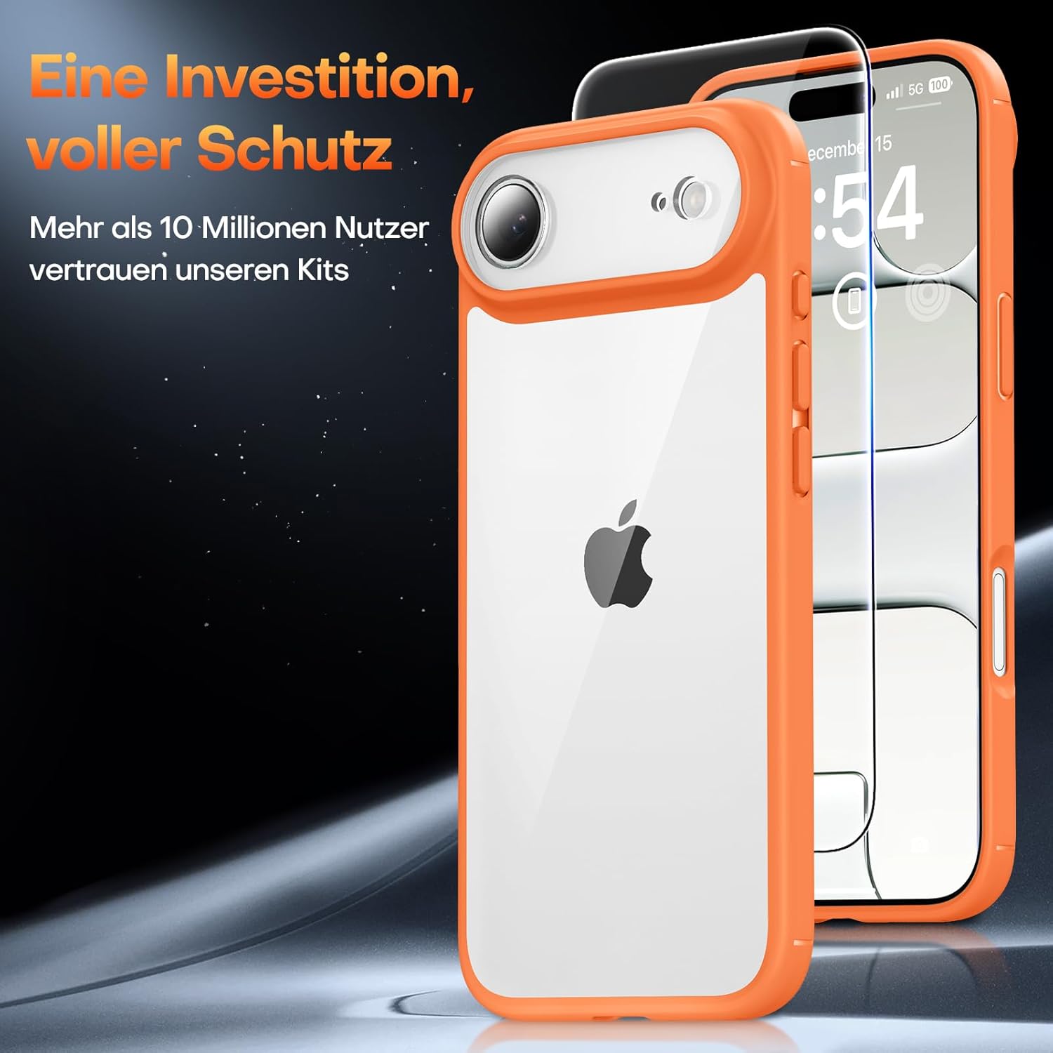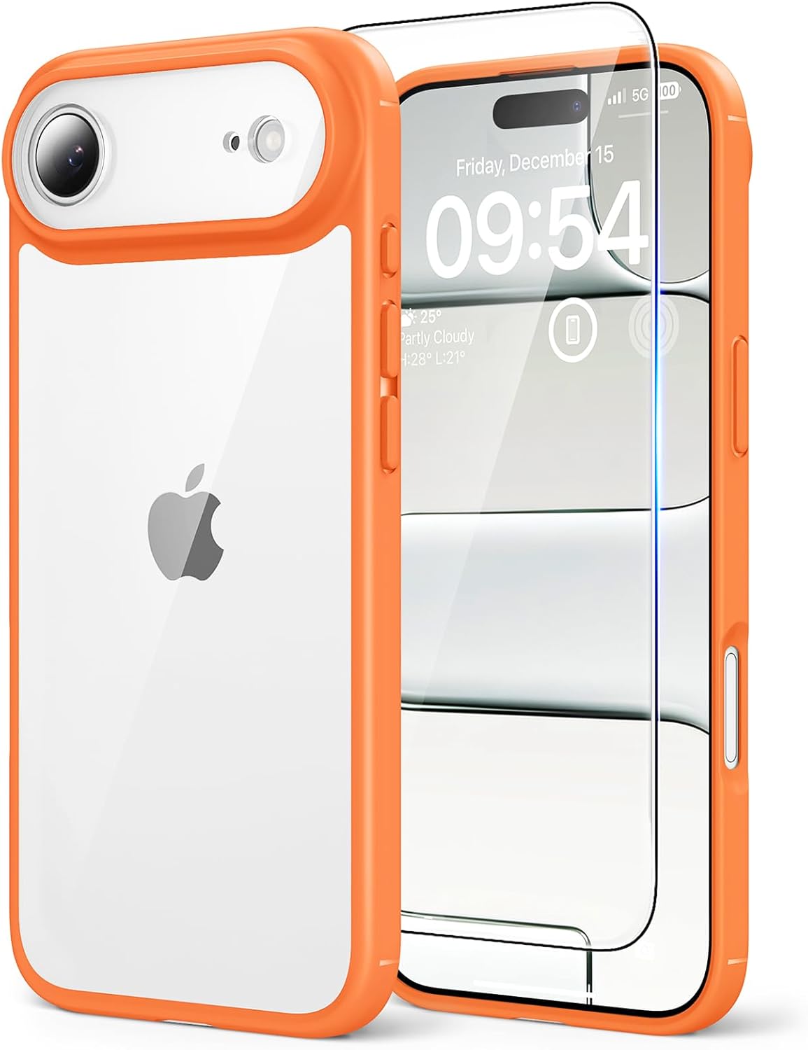 Кейс TAURI за Air 2025 6.6 инча със закалено стъклено фолио, пълна защита на камерата, [против пожълтяване] удароустойчив прозрачен калъф за мобилен телефон, военен стандарт - оранжев