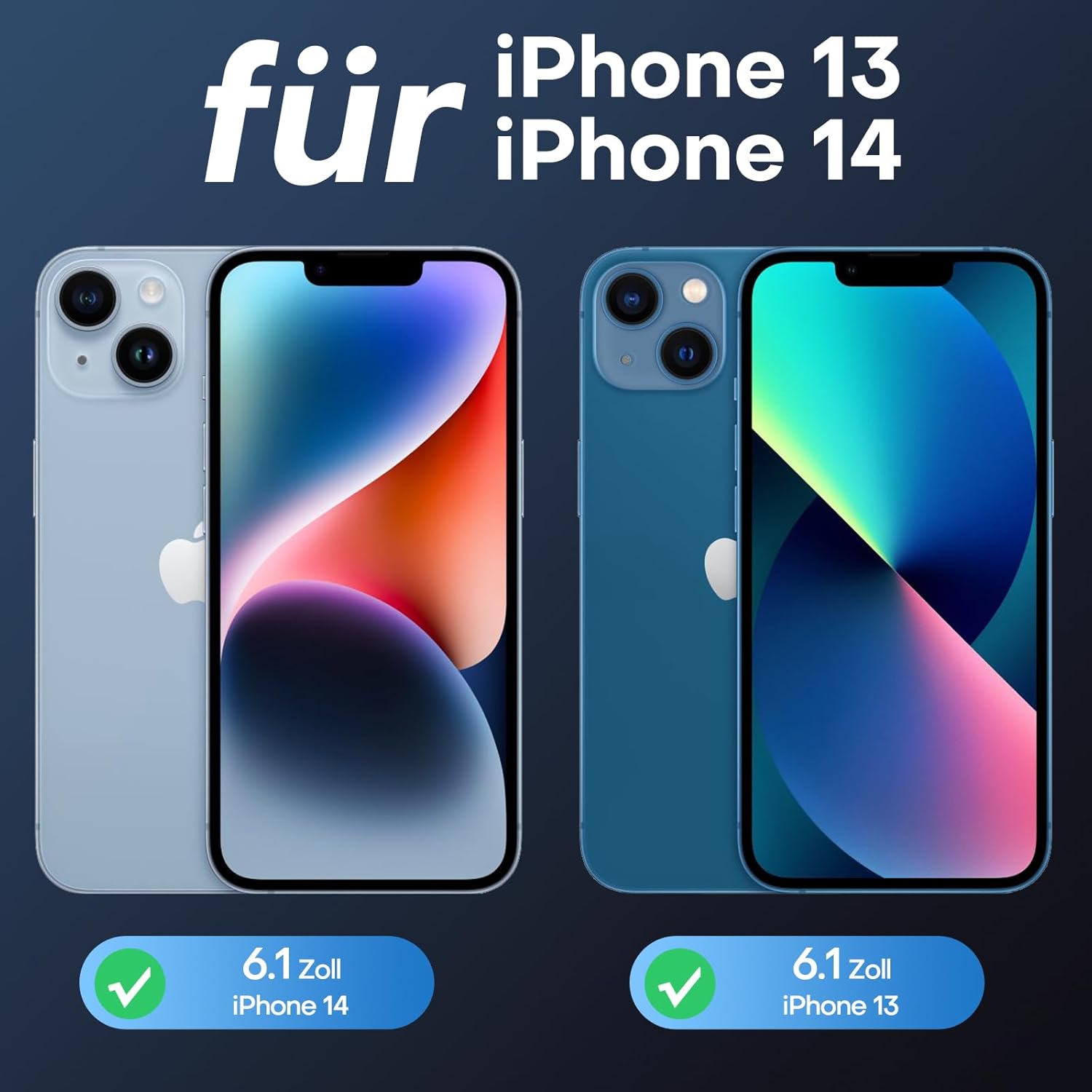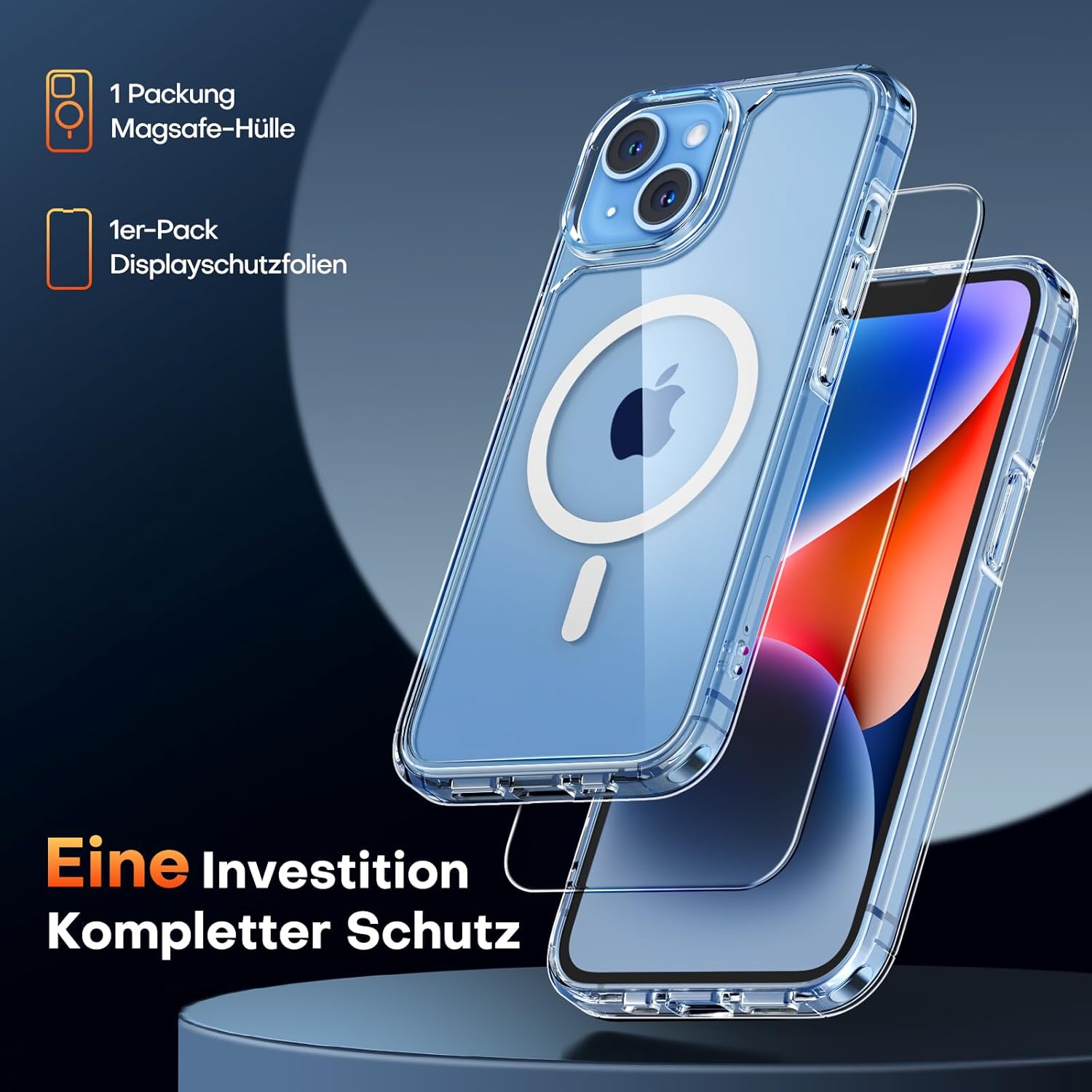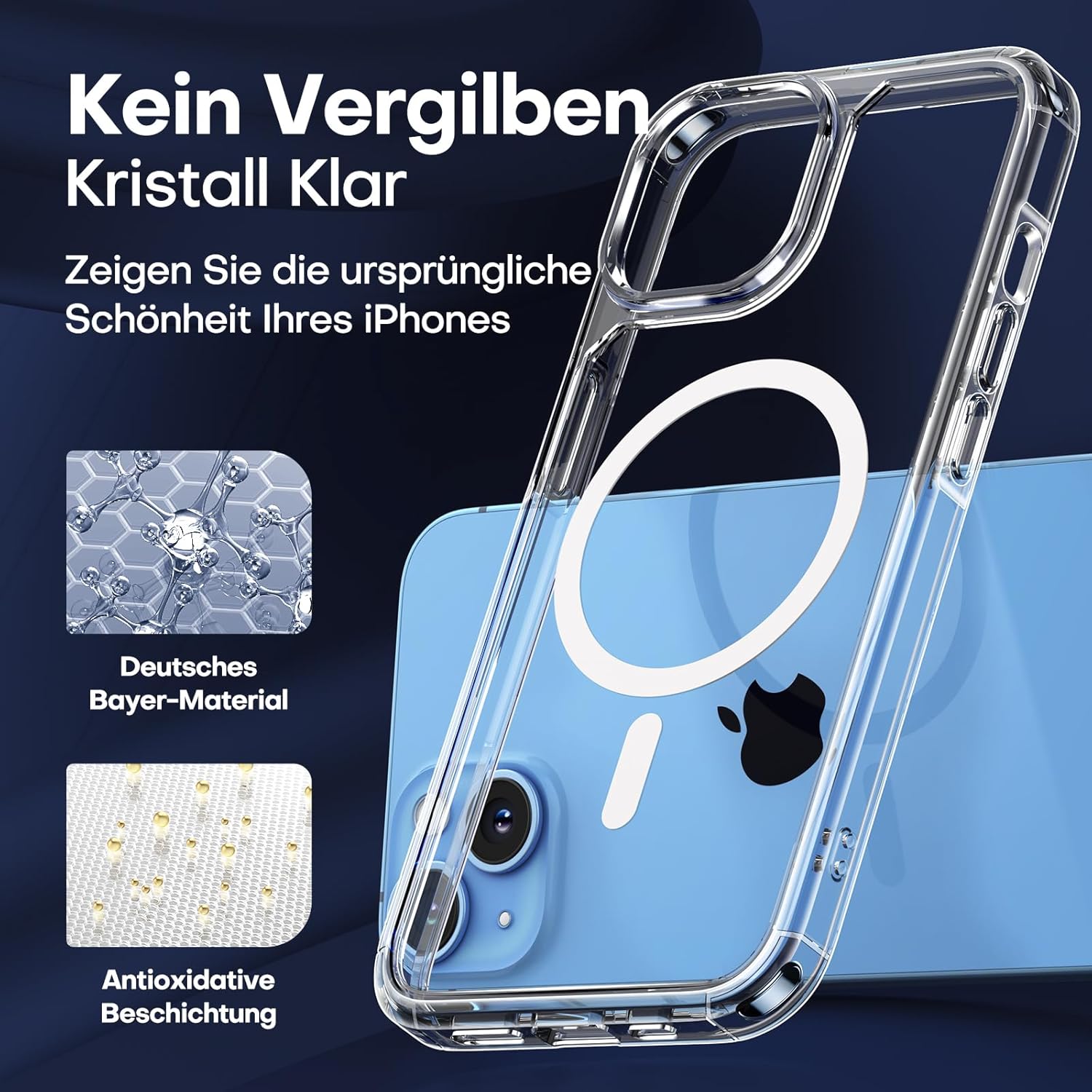 Кейс TAURI за iPhone 13 6.1 инча със закалено стъклено фолио, съвместим с MagSafe, военна стандартна защита, [против пожълтяване] удароустойчив магнитен кейс за мобилен телефон - прозрачен