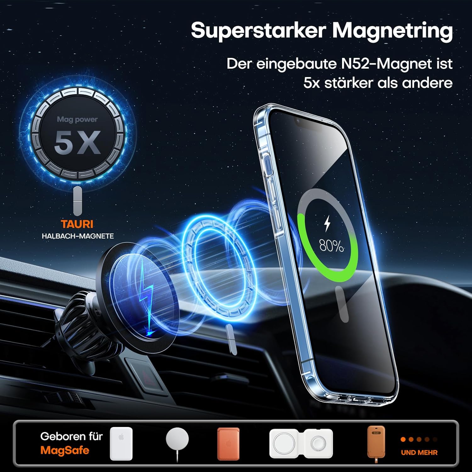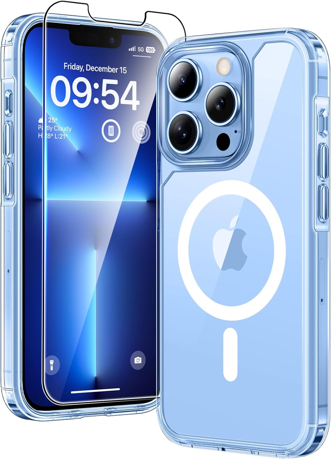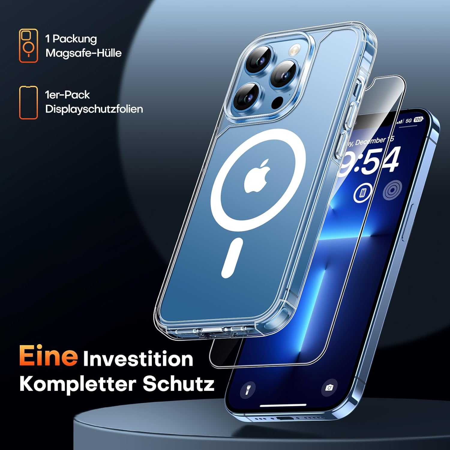 Кейс TAURI за iPhone 13 Pro 6.1 инча със закалено стъклено фолио, съвместим с MagSafe, военна стандартна защита, [против пожълтяване] удароустойчив магнитен кейс за мобилен телефон - прозрачен