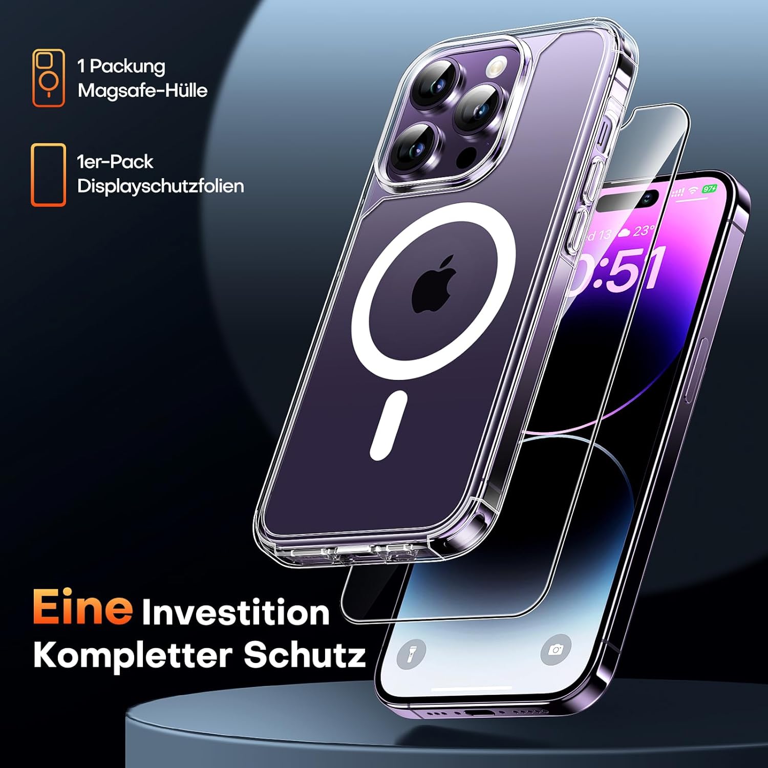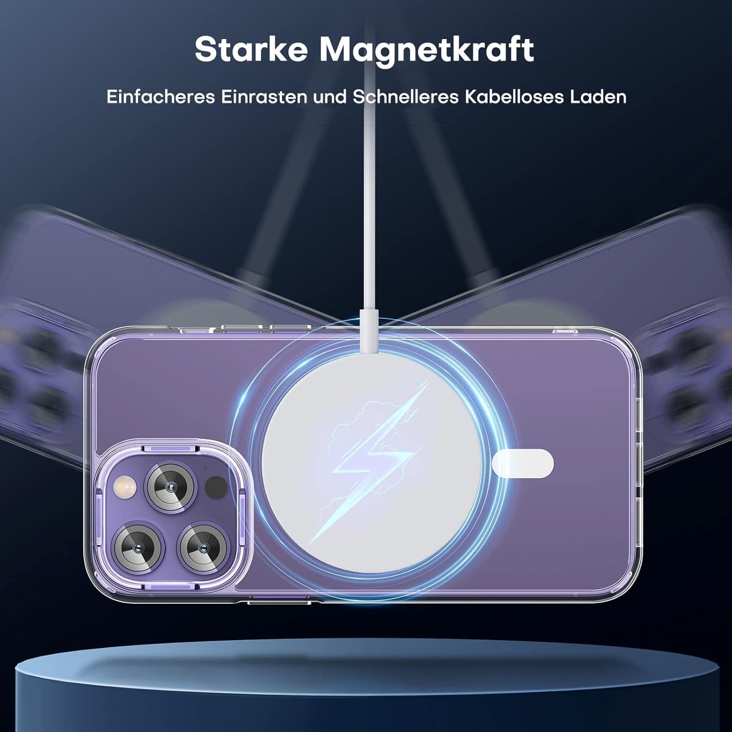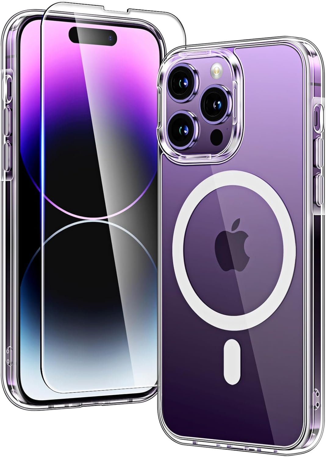 Кейс TAURI за iPhone 14 Pro Max 6.7 инча със закалено стъклено фолио и защита на камерата, съвместим с MagSafe, [против пожълтяване] удароустойчив магнитен кейс за мобилен телефон - прозрачен
