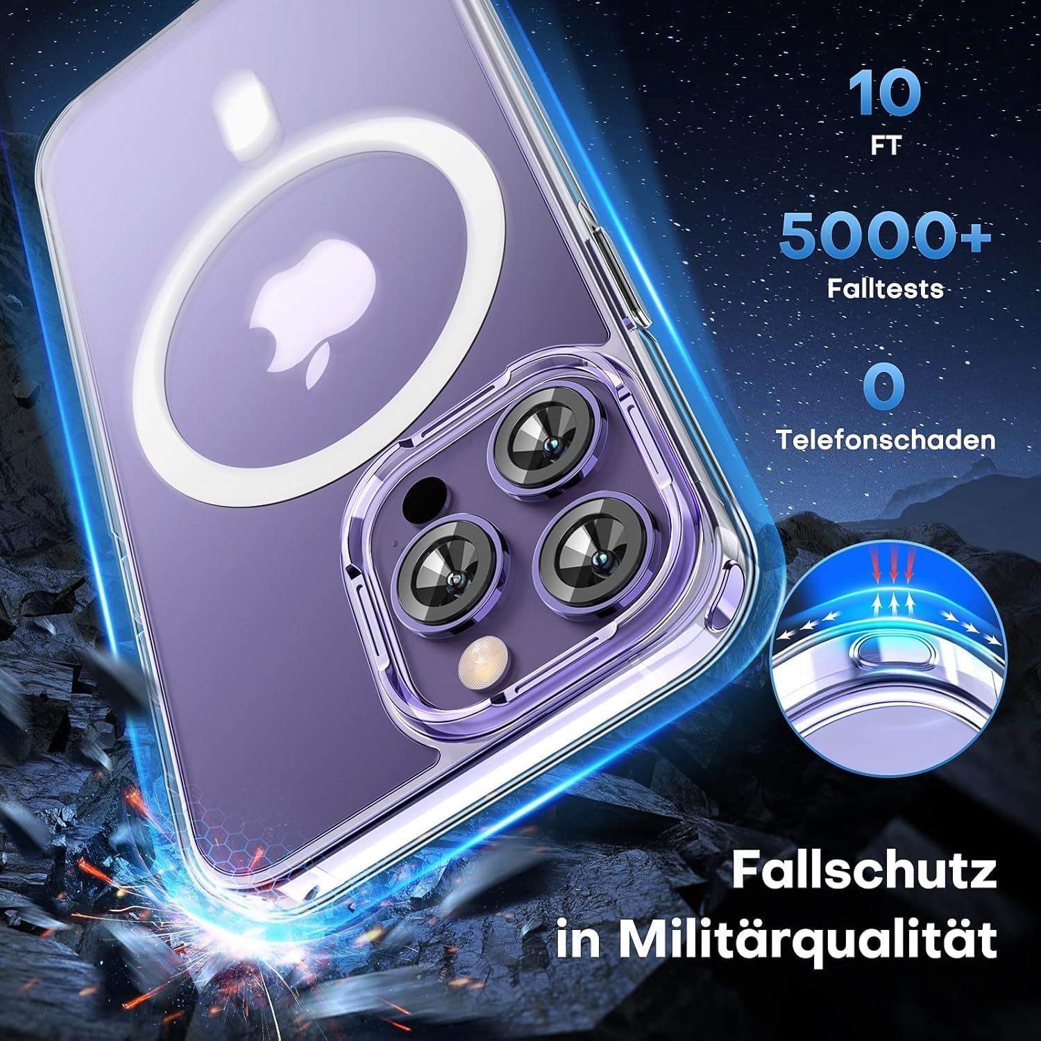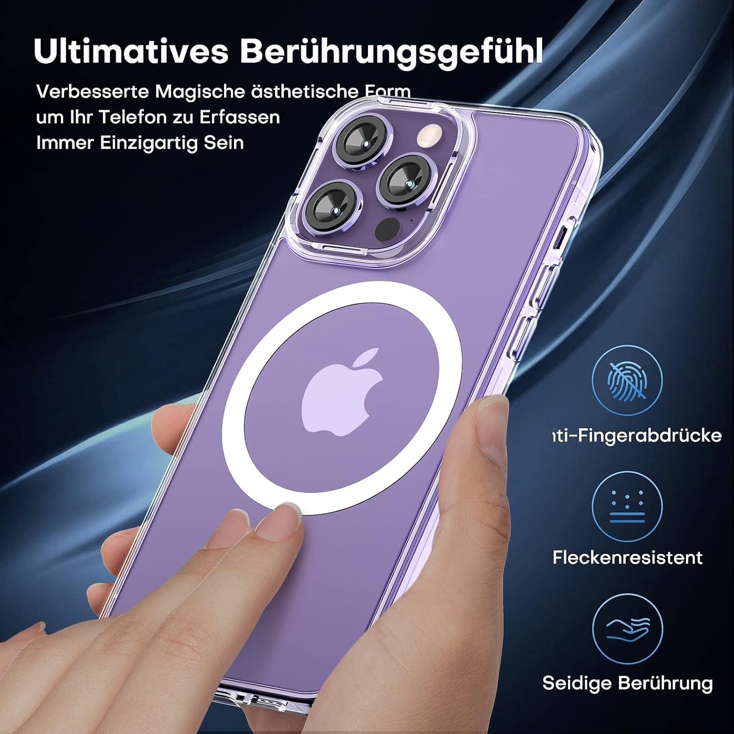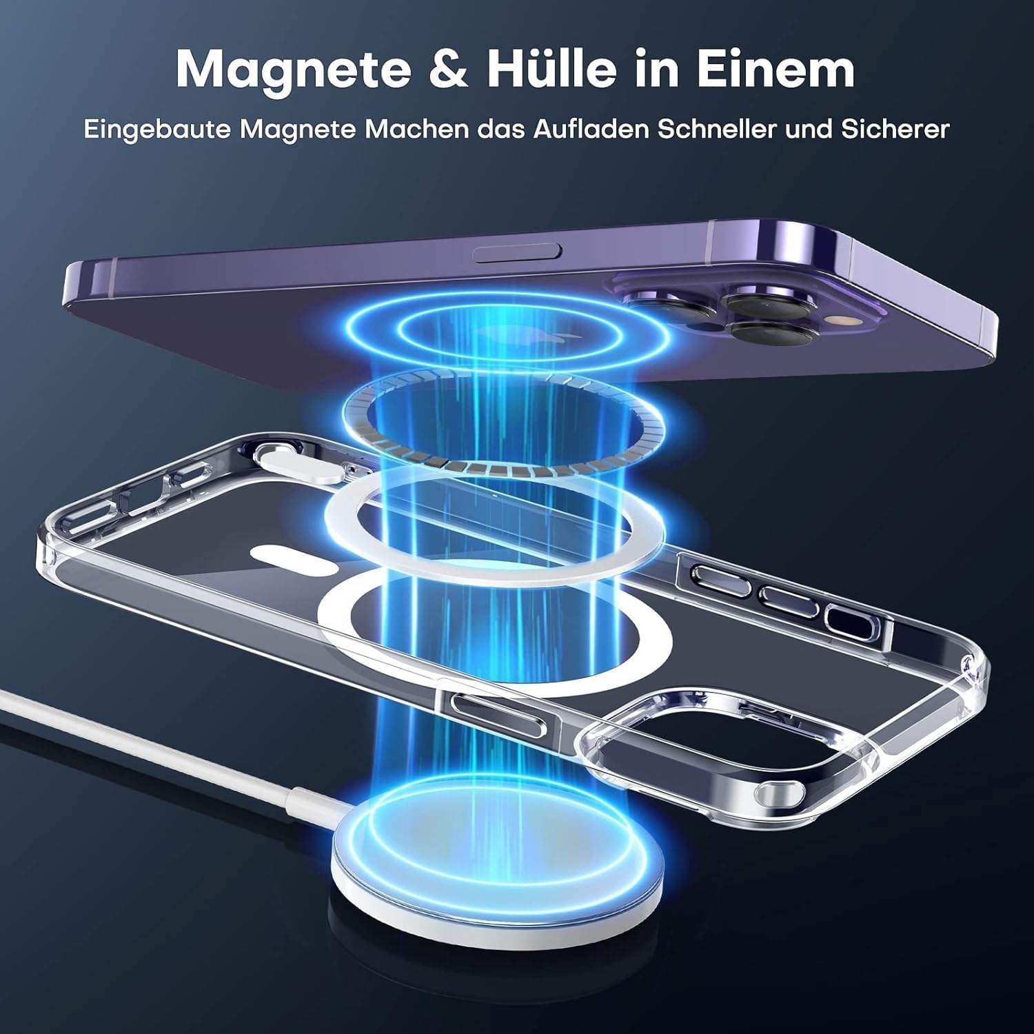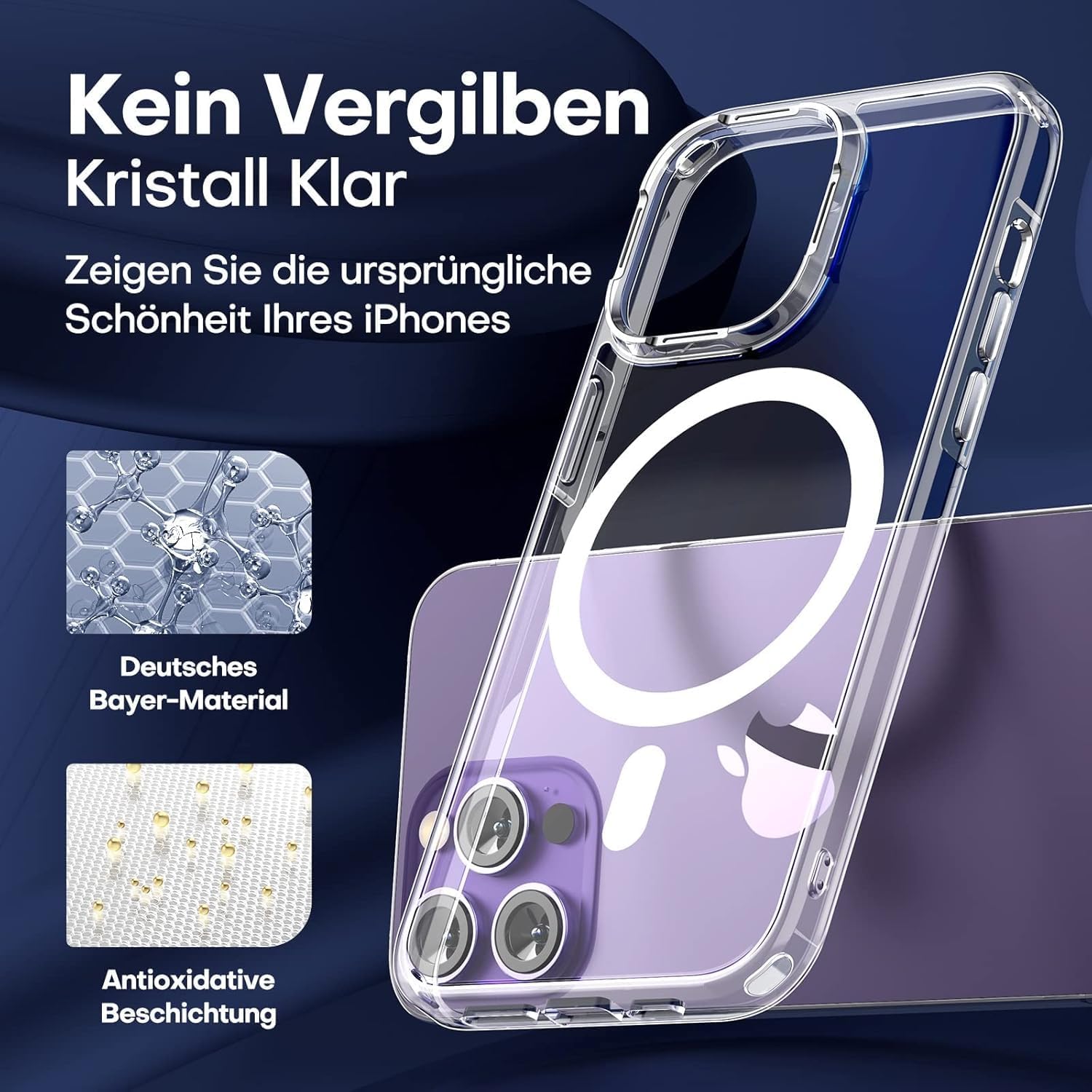 Кейс TAURI за iPhone 14 Pro Max 6.7 инча със закалено стъклено фолио и защита на камерата, съвместим с MagSafe, [против пожълтяване] удароустойчив магнитен кейс за мобилен телефон - прозрачен