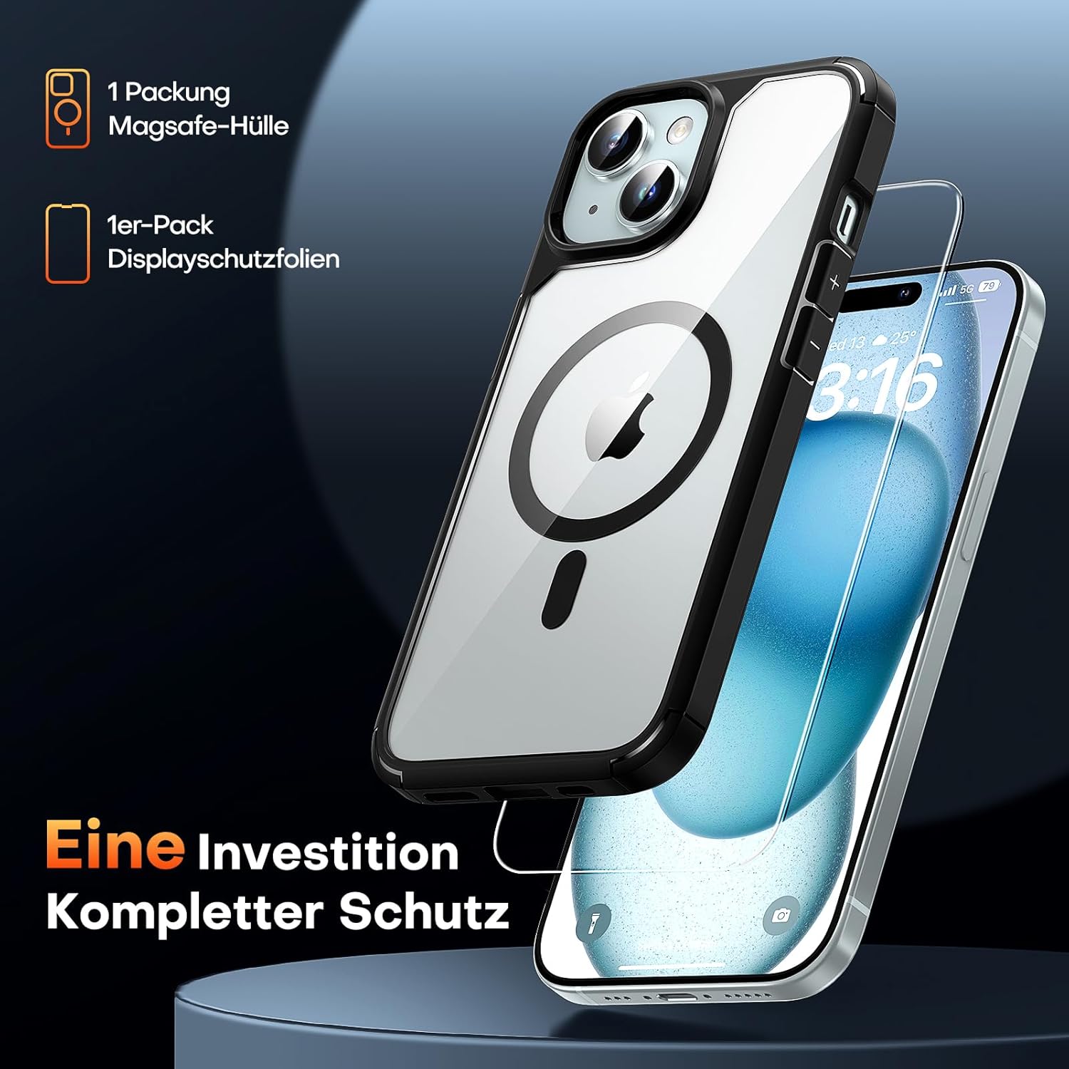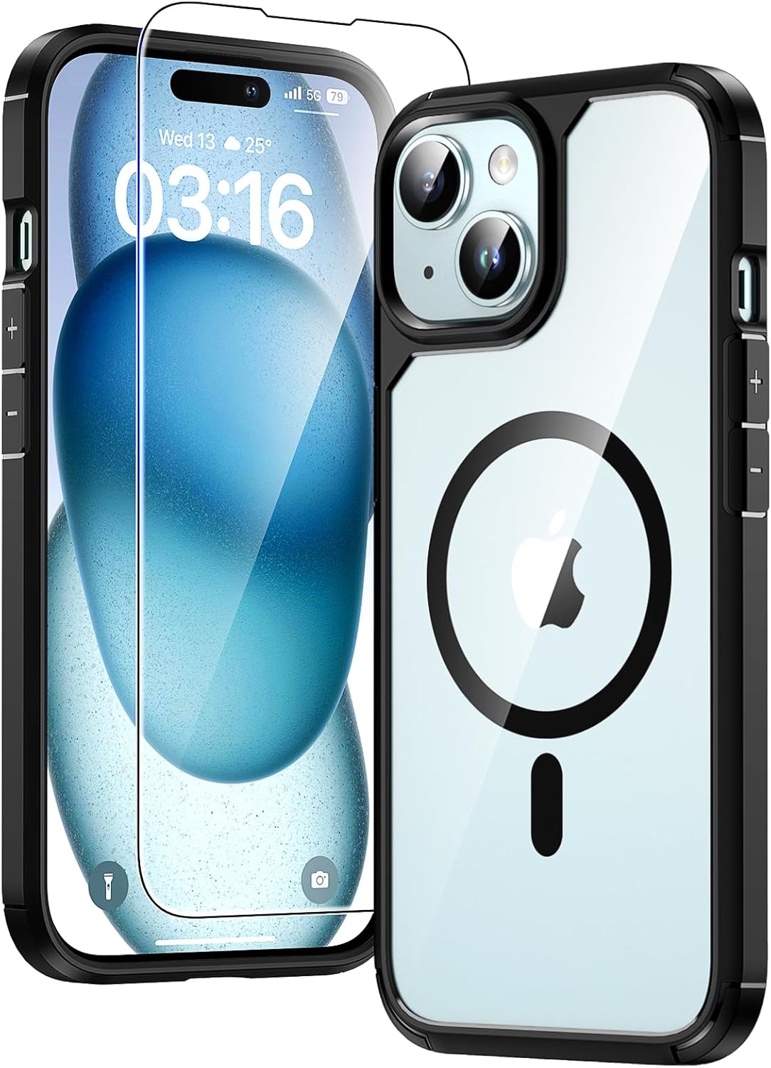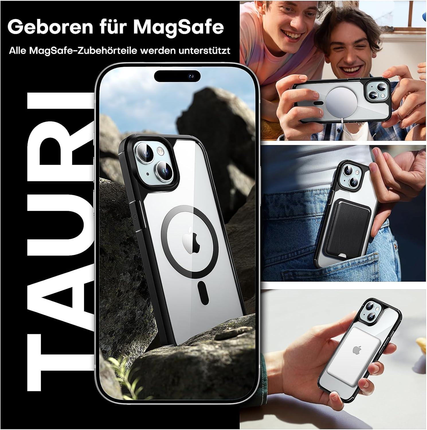Кейс TAURI за iPhone 15 6.1 инча със закалено стъклено фолио, съвместим с MagSafe, военна стандартна защита, [против пожълтяване] удароустойчив магнитен кейс за мобилен телефон - черен
