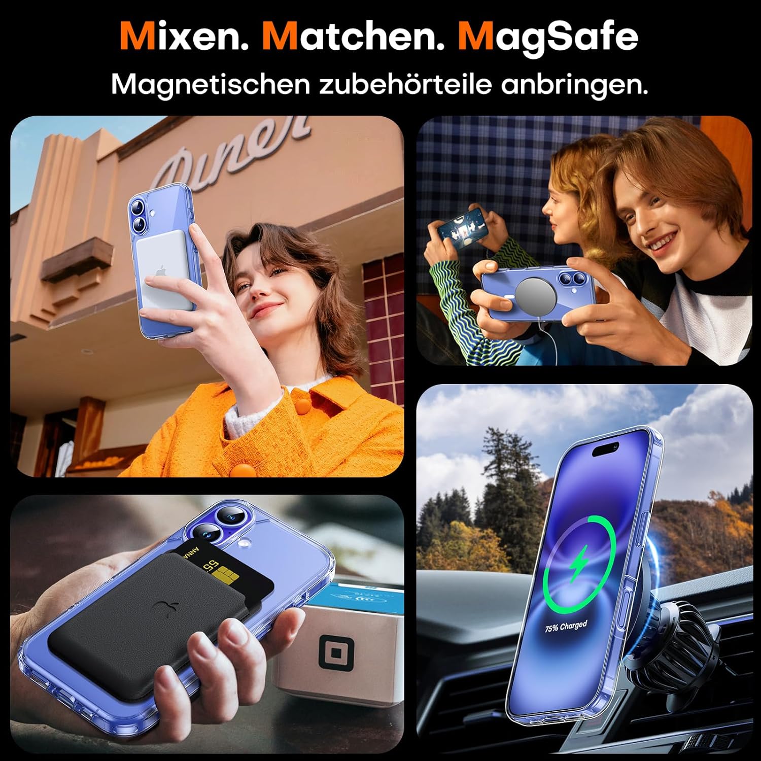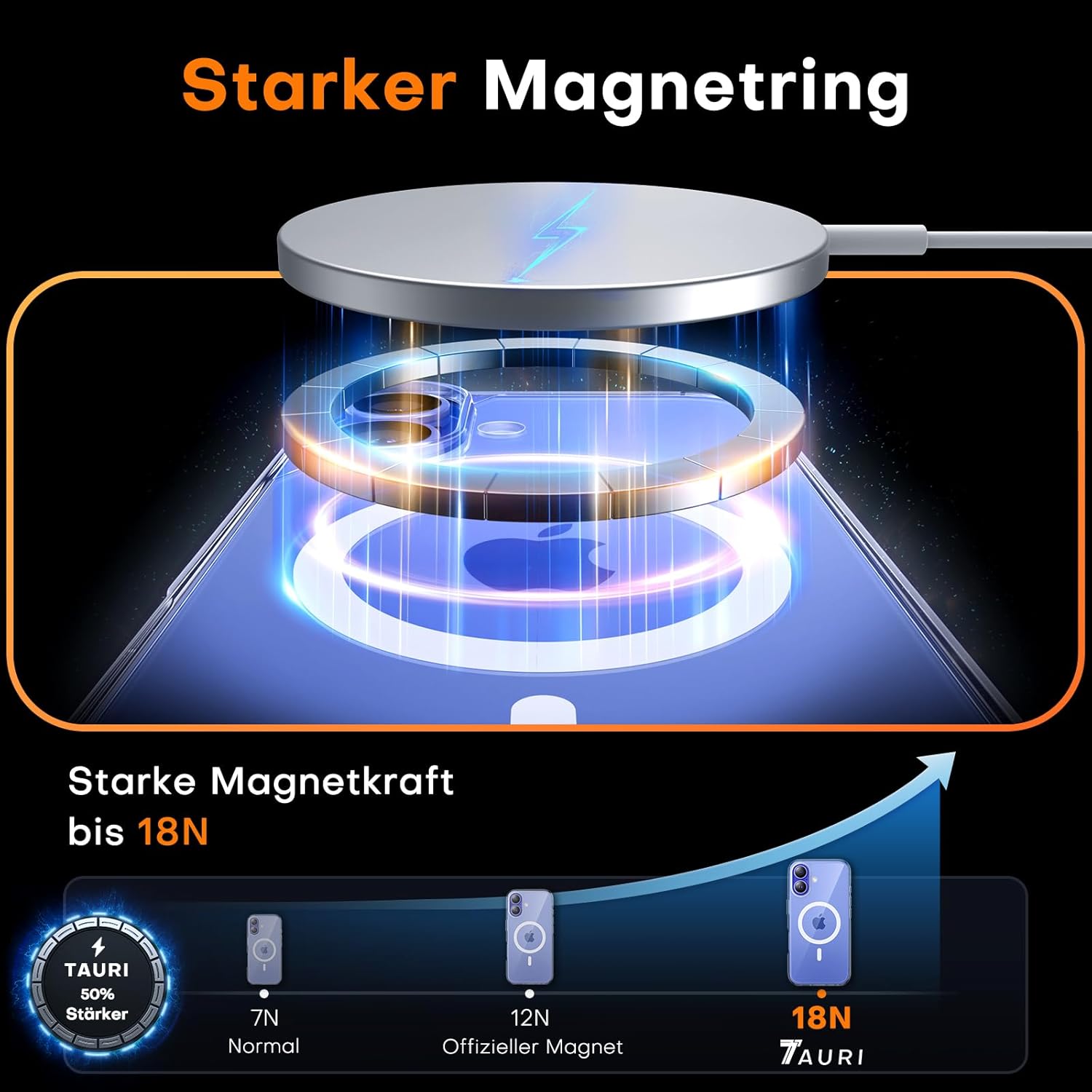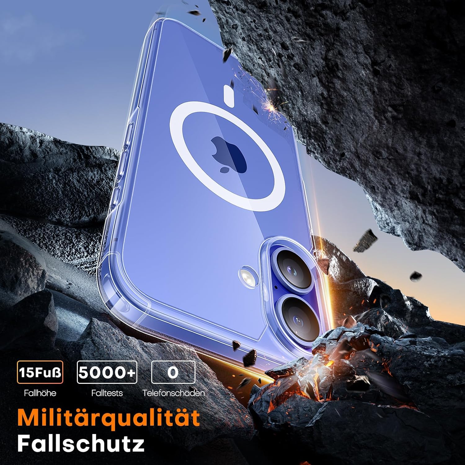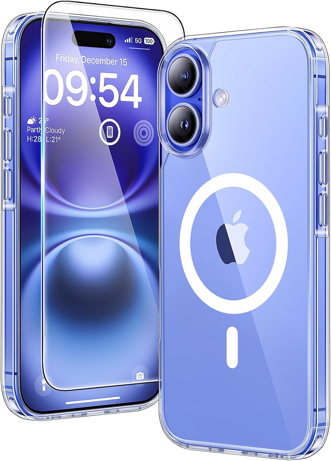 Кейс TAURI за iPhone 16 Plus 6.7 инча със закалено стъклено фолио, съвместим с MagSafe, военна стандартна защита, [против пожълтяване] удароустойчив магнитен кейс за мобилен телефон - прозрачен