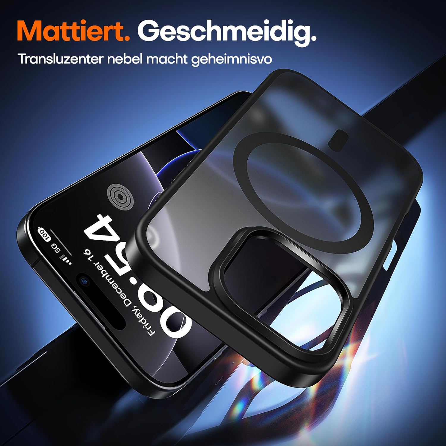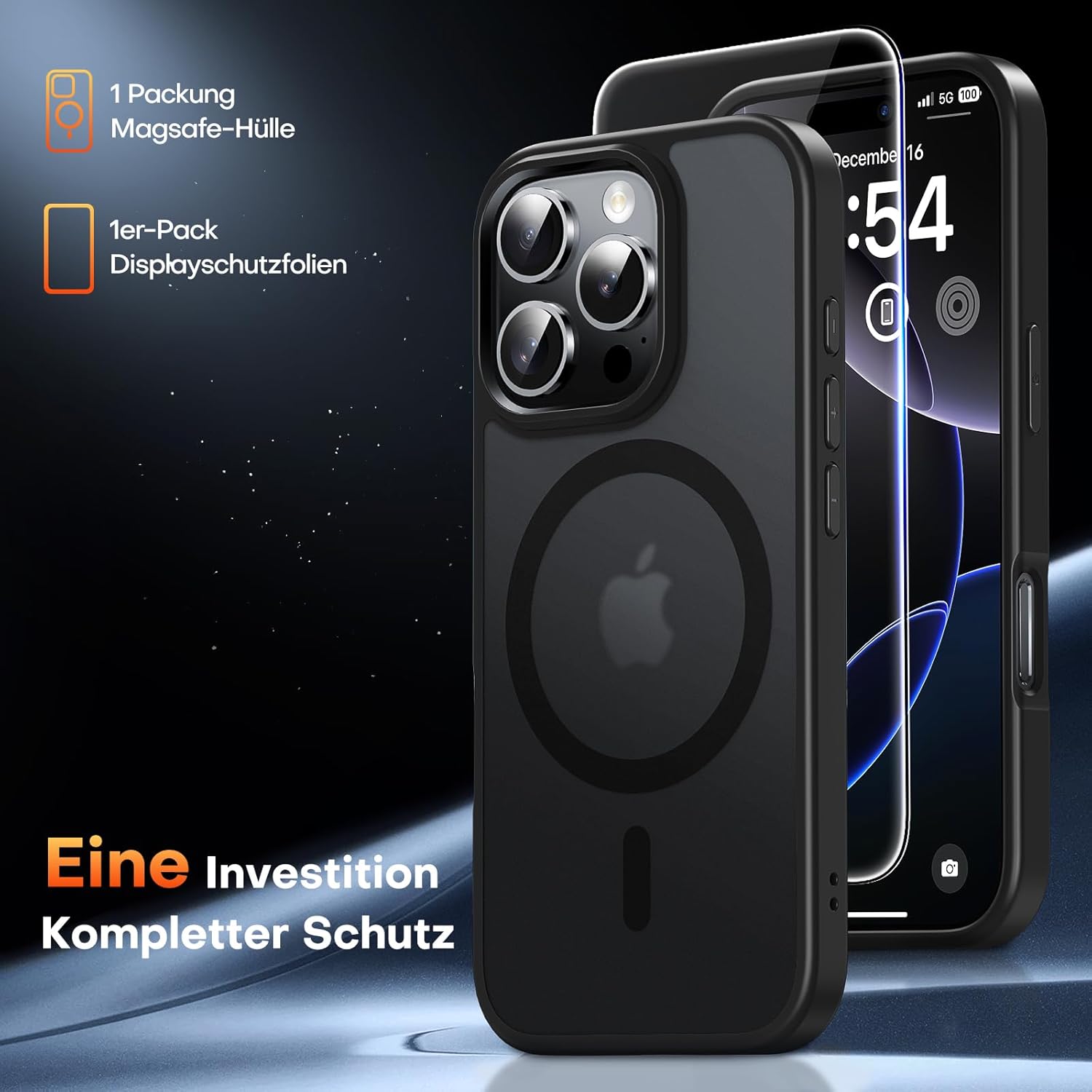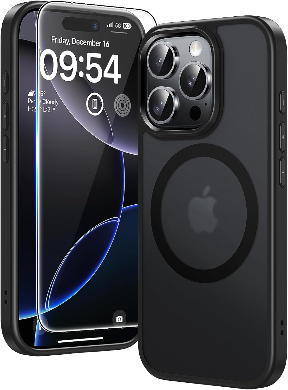 Кейс TAURI за iPhone 16 Pro Max 6.9 инча със закалено стъклено фолио, съвместим с MagSafe, военна стандартна защита, [против пожълтяване] удароустойчив магнитен кейс за мобилен телефон - матово черно