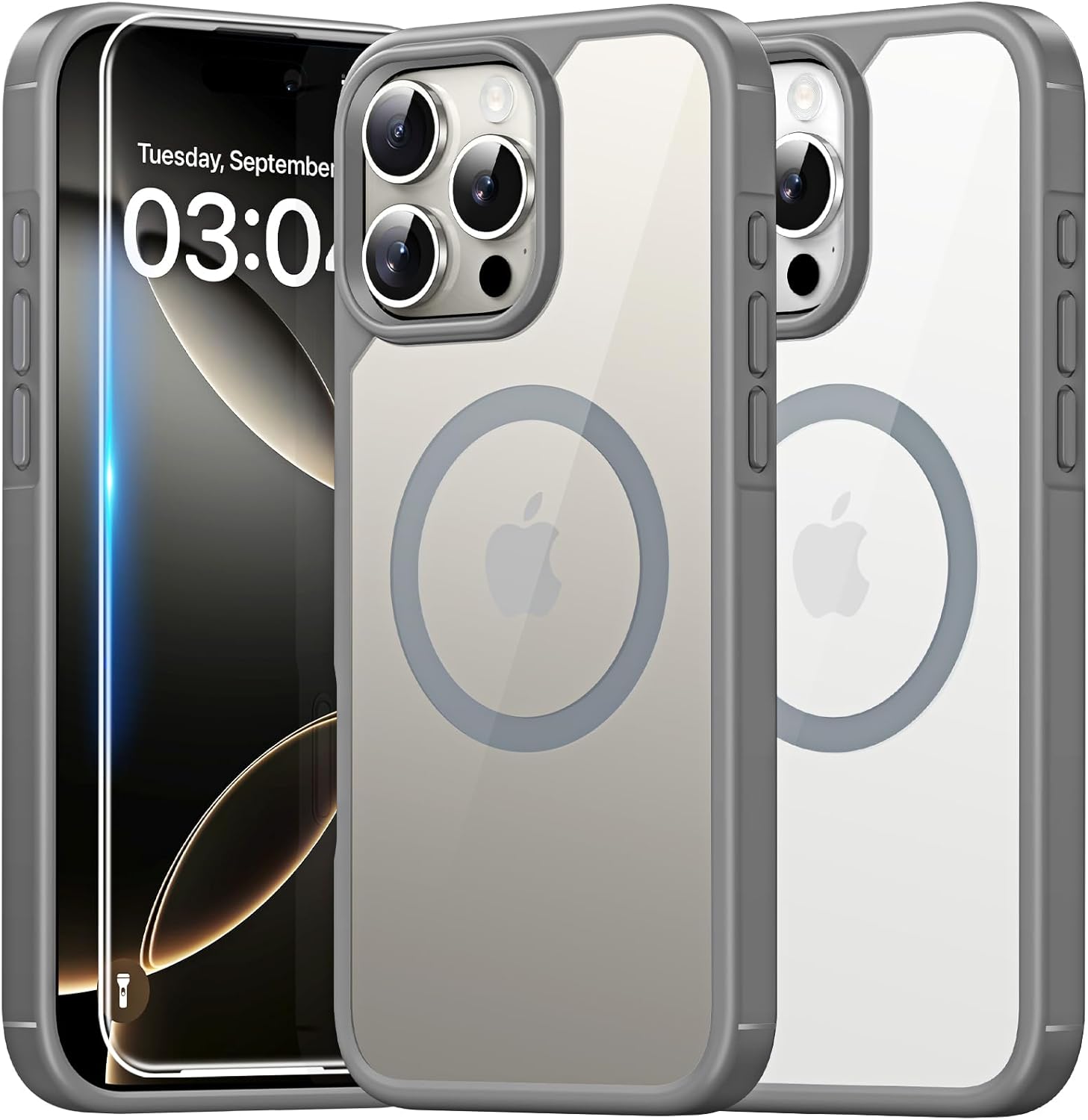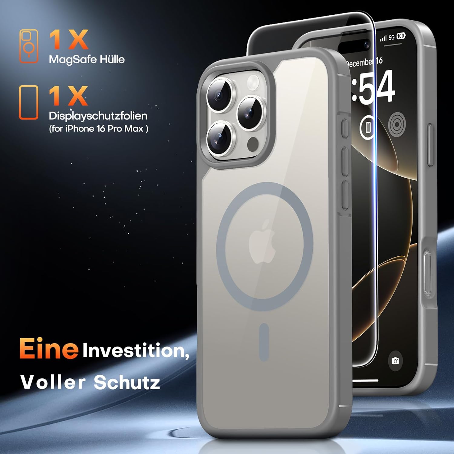 Кейс TAURI за iPhone 16 Pro Max 6.9 инча със закалено стъклено фолио, съвместим с MagSafe, военна стандартна защита, [против пожълтяване] удароустойчив магнитен кейс за мобилен телефон - натурален титаний