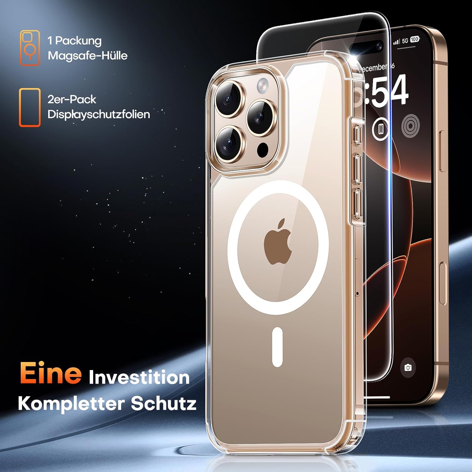 Кейс TAURI за iPhone 16 Pro Max 6.9 инча със закалено стъклено фолио, съвместим с MagSafe, военна стандартна защита, [против пожълтяване] удароустойчив магнитен кейс за мобилен телефон - прозрачен