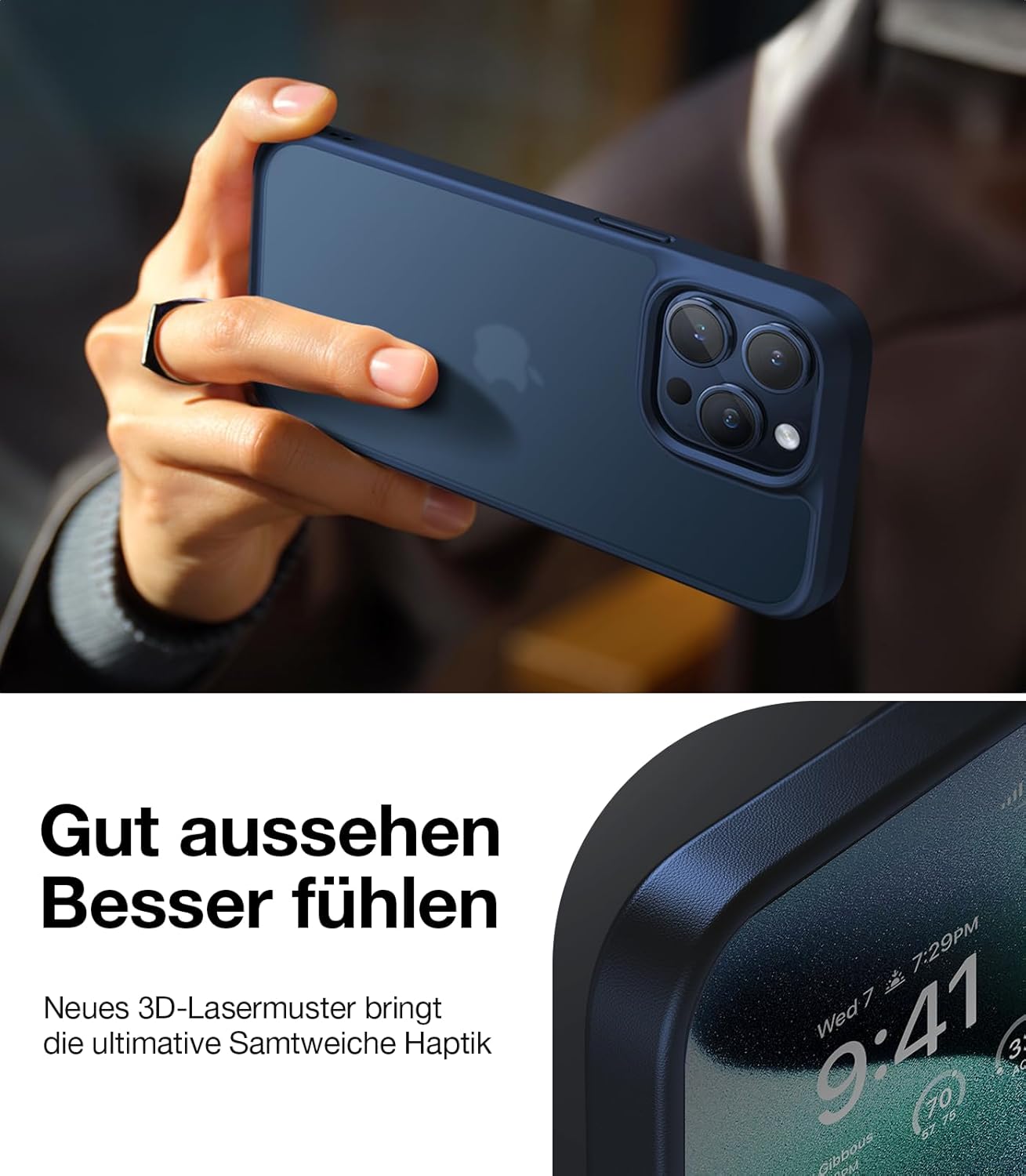 • Премиум допир, неплъзгащ се: Рамката на защитния калъф за iPhone 17 Pro е снабдена с 3D Nappa текстура, която осигурява фин, удобен захват и същевременно има неплъзгащ се ефект - за повече безопасност в ежедневието. Ергономичният дизайн на извивката G4 приляга особено добре в ръката. Повърхността е завършена и с олеофобно и хидрофобно нанопокритие за ефективно намаляване на пръстовите отпечатъци.