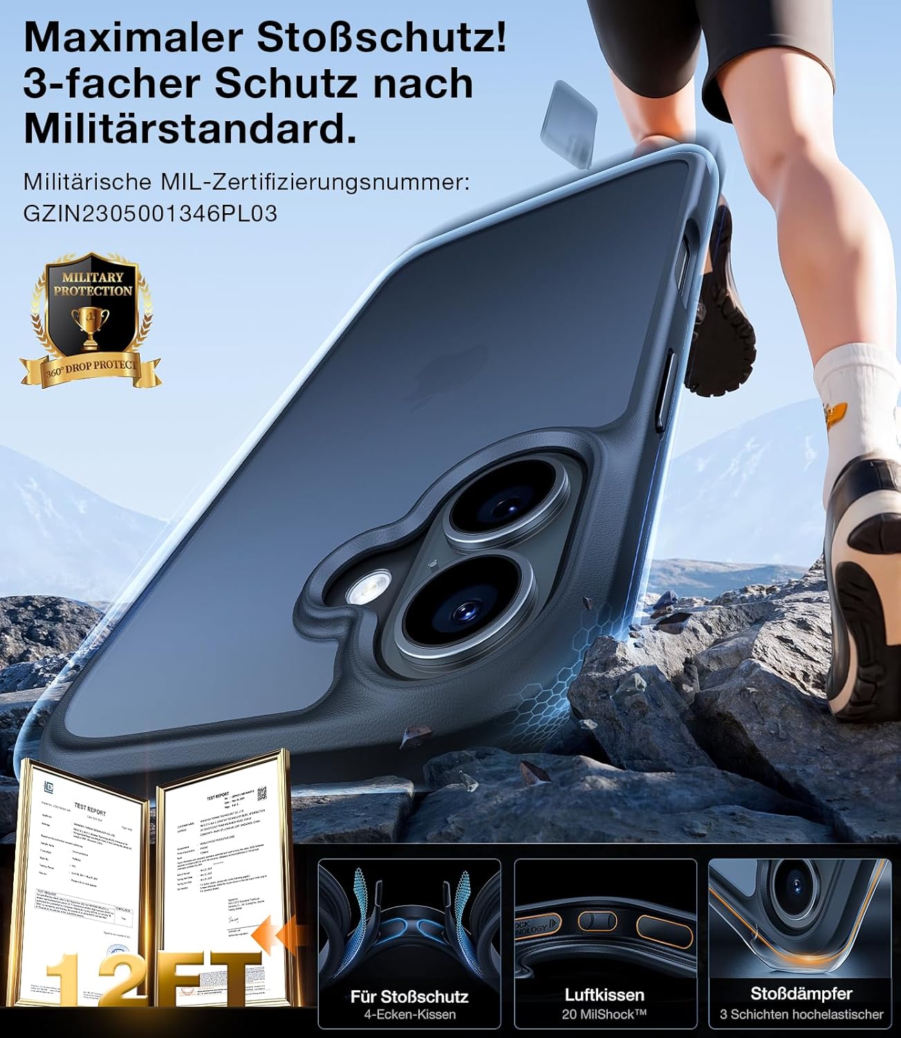 • Цялостна защита на най-високо ниво: TORRAS Guardian защитава вашия iPhone от повреди в случай на падане от всички посоки - дори при екстремни условия. Кейсът за iPhone 17 Pro е преминал теста за падане SGS и с височина на падане от 3,66 м счупи предишния рекорд от 2,44 м. Над 4000 теста за падане от 26 различни ъгъла - устройството е останало непокътнато. Изработен от материали за екипировка за защита на ски, с вградена 360° въздушна възглавница, той предлага цялостна защита.