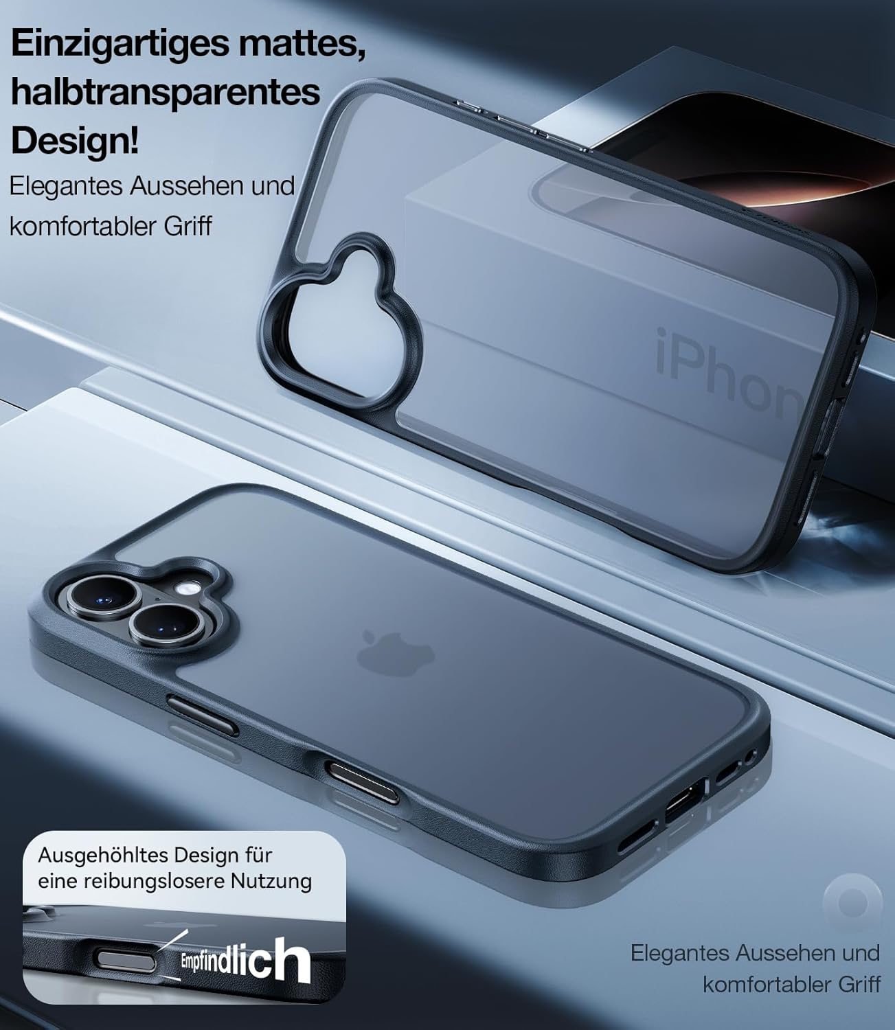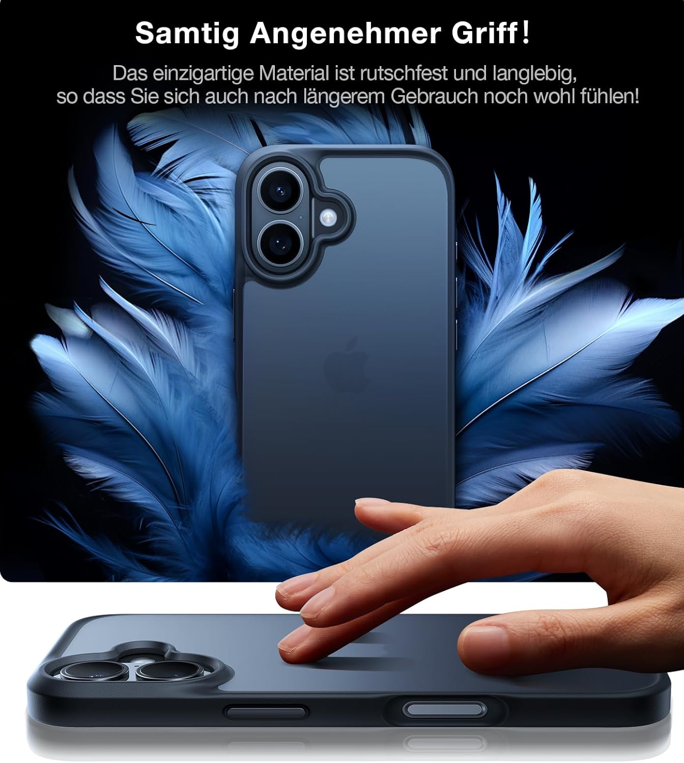• Премиум допир, неплъзгащ се: Рамката на защитния калъф за iPhone 17 Pro е снабдена с 3D Nappa текстура, която осигурява фин, удобен захват и същевременно има неплъзгащ се ефект - за повече безопасност в ежедневието. Ергономичният дизайн на извивката G4 приляга особено добре в ръката. Повърхността е завършена и с олеофобно и хидрофобно нанопокритие за ефективно намаляване на пръстовите отпечатъци.