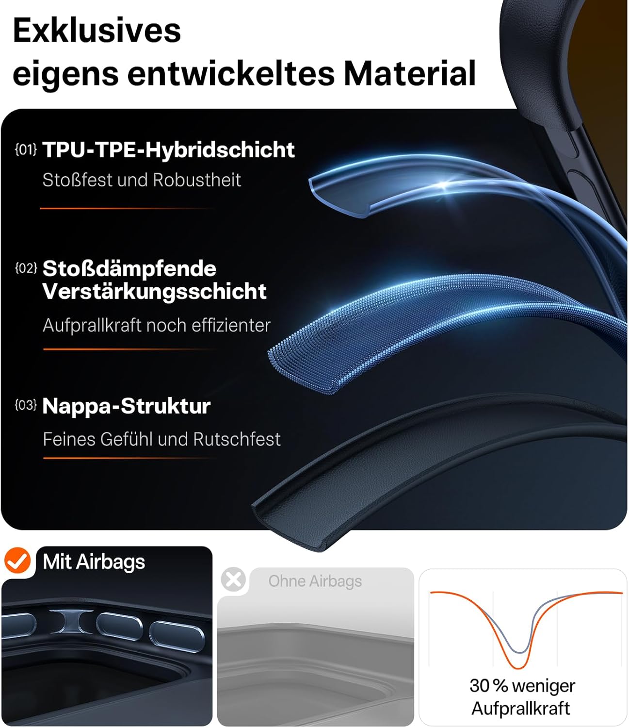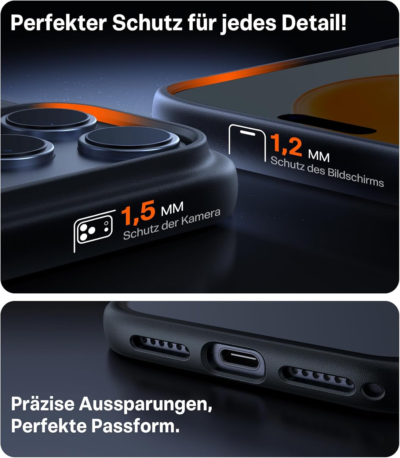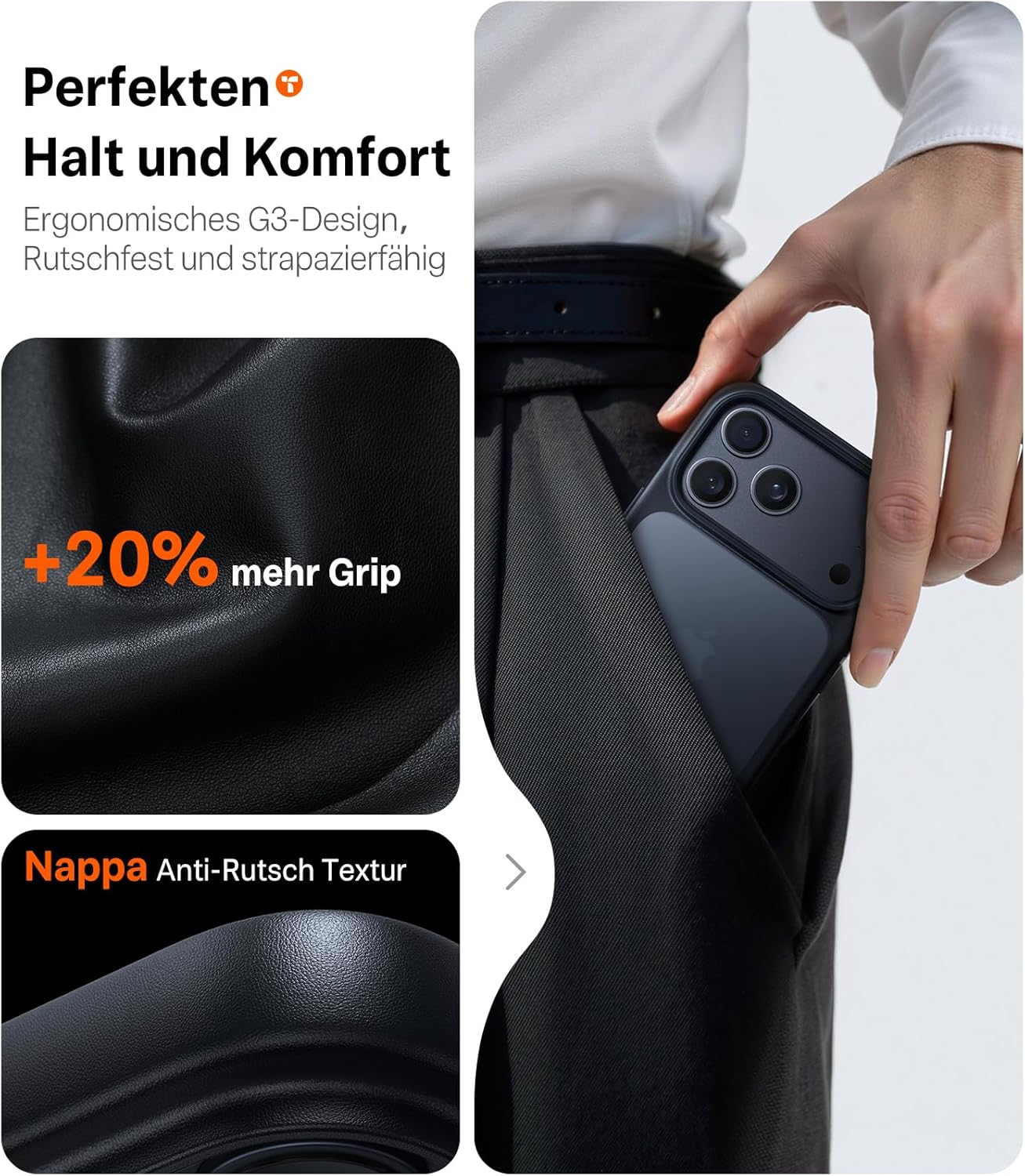 • Премиум допир, неплъзгащ се: Рамката на защитния калъф за iPhone 17 Pro е снабдена с 3D Nappa текстура, която осигурява фин, удобен захват и същевременно има неплъзгащ се ефект - за повече безопасност в ежедневието. Ергономичният дизайн на извивката G4 приляга особено добре в ръката. Повърхността е завършена и с олеофобно и хидрофобно нанопокритие за ефективно намаляване на пръстовите отпечатъци.