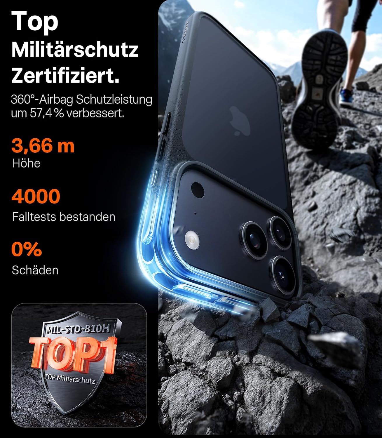 • Цялостна защита на най-високо ниво: TORRAS Guardian защитава вашия iPhone от повреди в случай на падане от всички посоки - дори при екстремни условия. Кейсът за iPhone 17 Pro е преминал теста за падане SGS и с височина на падане от 3,66 м счупи предишния рекорд от 2,44 м. Над 4000 теста за падане от 26 различни ъгъла - устройството е останало непокътнато. Изработен от материали за екипировка за защита на ски, с вградена 360° въздушна възглавница, той предлага цялостна защита.