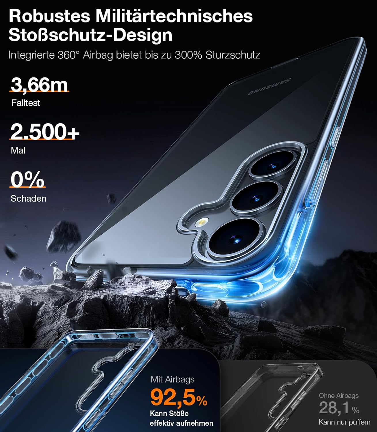 • [№ 1 Военна защита, предпазва при всяко падане] Все още ли се притеснявате, че телефонът ви ще се счупи в случай на падане? Не се притеснявайте! Този калъф за Samsung S25 Ultra използва ексклузивна технология X-Shock 3.0 и професионално защитава четирите ъгъла. С вградена 360° възглавница за абсорбиране на удара, той абсорбира 92,5% от силата на удара. След над 2500 падания от височина 3,66 м, той остава непокътнат - за максимална защита и безпроблемни падания.
