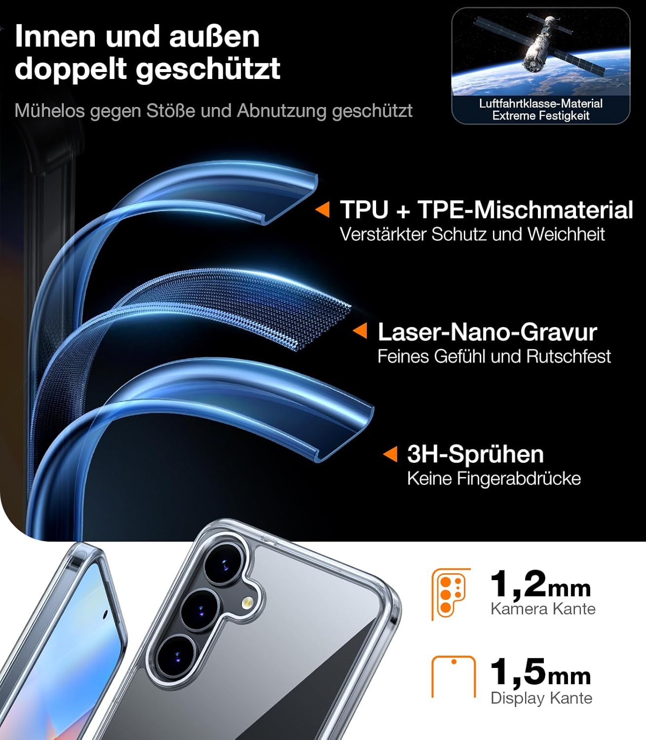 • [Тройна защита, устойчивост на надраскване и удароустойчивост] Калъфът TORRAS Guardian за Samsung S25 Ultra използва комбинация от TPU и TPE материали, допълнени от технология за лазерно гравиране и 3H покритие за подобряване на устойчивостта на надраскване и удароустойчивост. Със специално проектирани защитни ръбове на лещата, повдигнати с 0,8 мм, и повдигнати с 1,5 мм ръбове на дисплея, този калъф за Galaxy S25 Ultra осигурява цялостна защита в ежедневието и ефективно се съпротивлява на всички външни влияния.