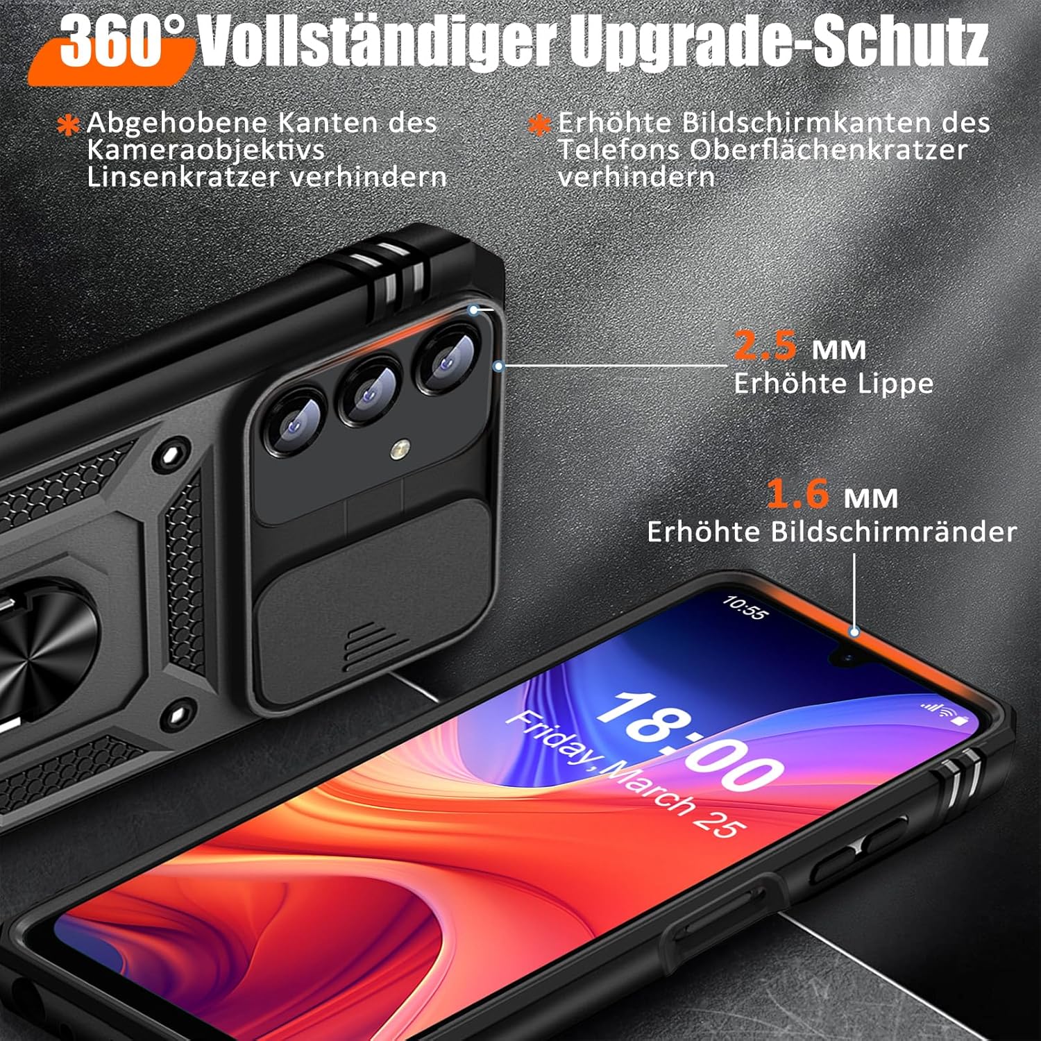 • Защита от военно ниво: калъфът за Galaxy A53 5G използва уникален TPU с ръбове в комбинация с вградени PC 2-в-1 затваряния, за да предпази телефона ви от падания, драскотини и удари. Защитата от военно ниво с технология с въздушна възглавница осигурява цялостна защита за вашето оборудване. Дизайн с плъзгач на обектива: Повдигната рамка за защита на камерата. Капачката покрива обектива и го предпазва от прах и драскотини.