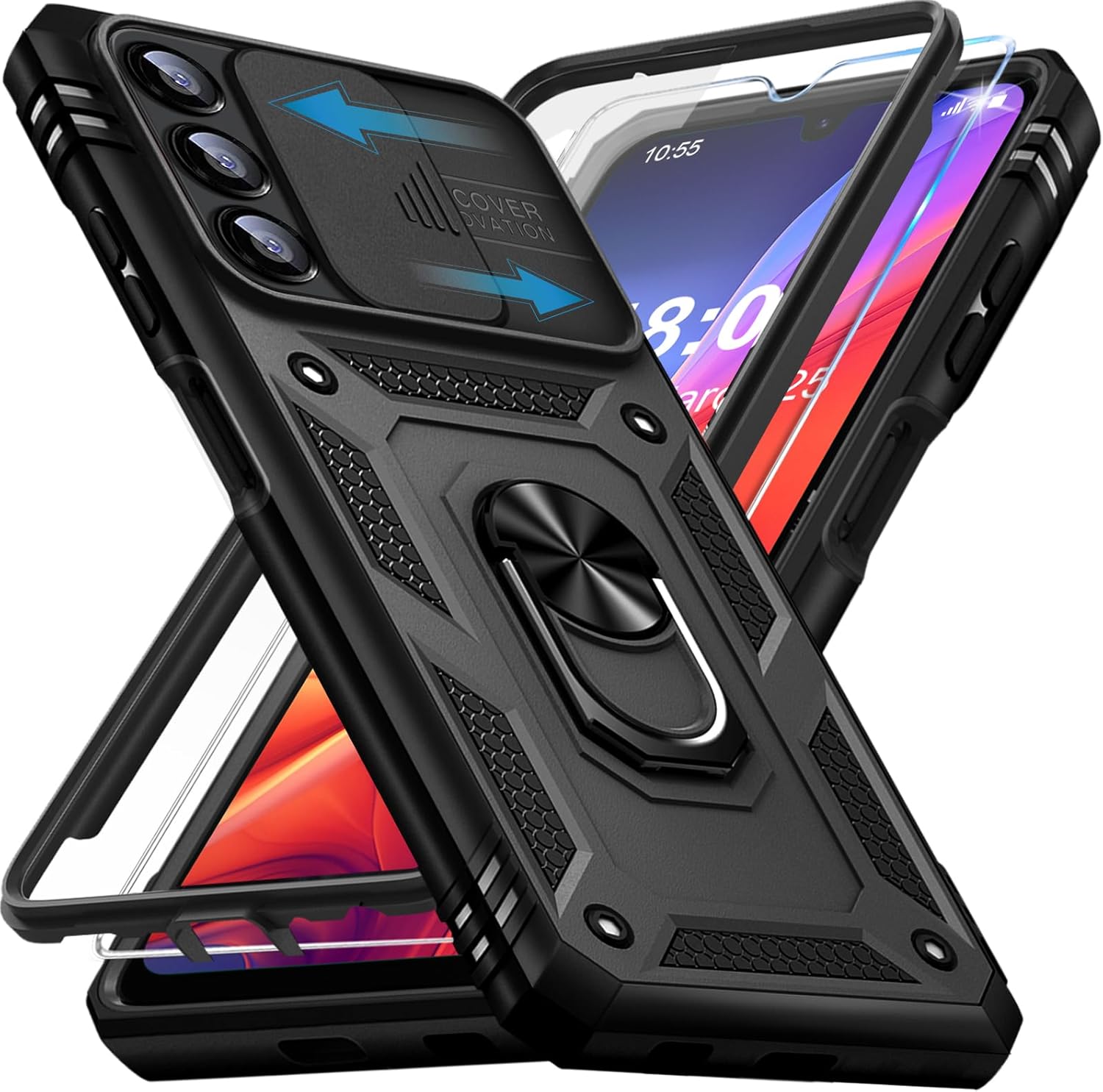 Кейс за мобилен телефон за Samsung Galaxy A13 5G/A04S с протектор за екрана, защитен калъф за Galaxy A13 5G със защита на камерата, въртяща се на 360° метална стойка с пръстен, удароустойчив калъф-буфер за A04S