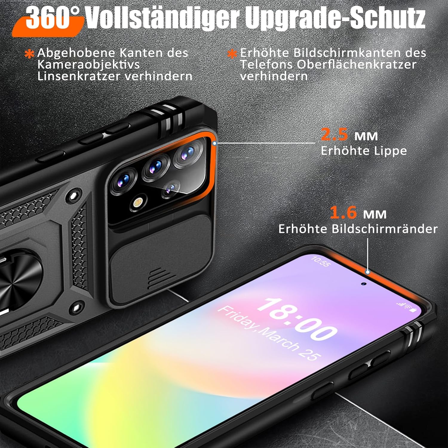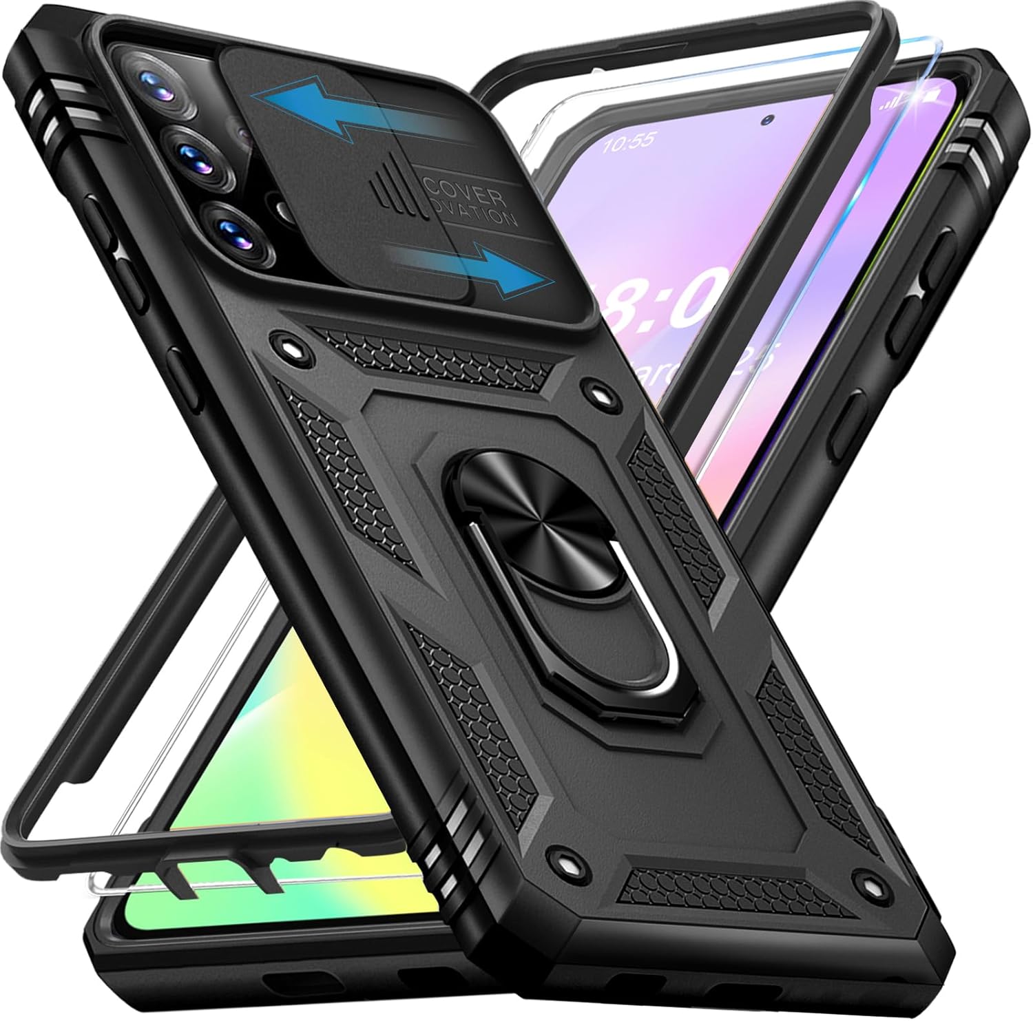 Кейс за мобилен телефон за Samsung Galaxy A53 5G с протектор за екран, защитен калъф със защита на камерата, въртяща се на 360° метална стойка с пръстен, удароустойчив калъф тип „bumper“ за 6.5 инча (черен)