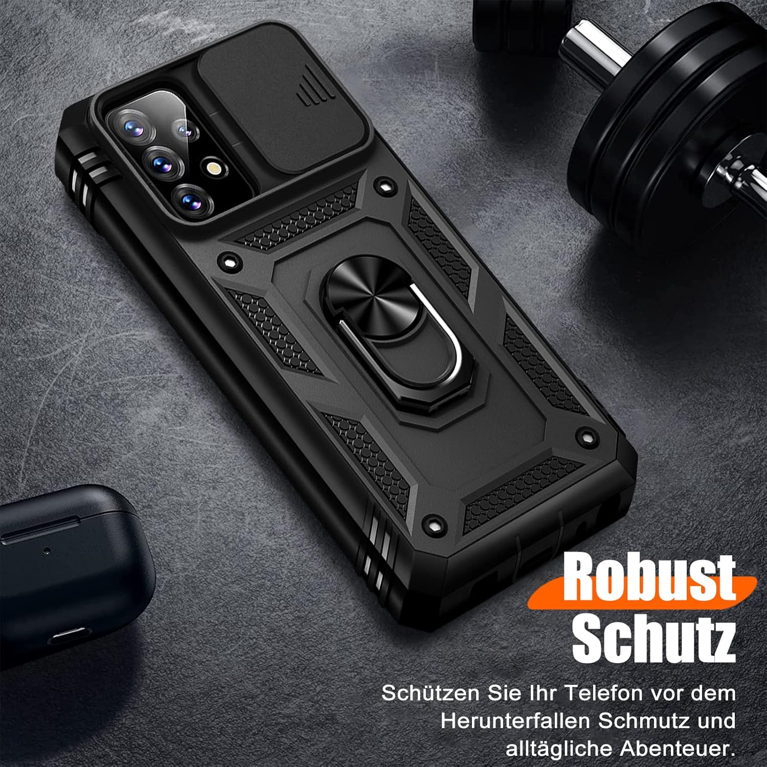 • Защита от военно ниво: калъфът за Galaxy A53 5G използва уникален TPU с ръбове в комбинация с вградени PC 2-в-1 затваряния, за да предпази телефона ви от падания, драскотини и удари. Защитата от военно ниво с технология с въздушна възглавница осигурява цялостна защита за вашето оборудване. Дизайн с плъзгач на обектива: Повдигната рамка за защита на камерата. Капачката покрива обектива и го предпазва от прах и драскотини.