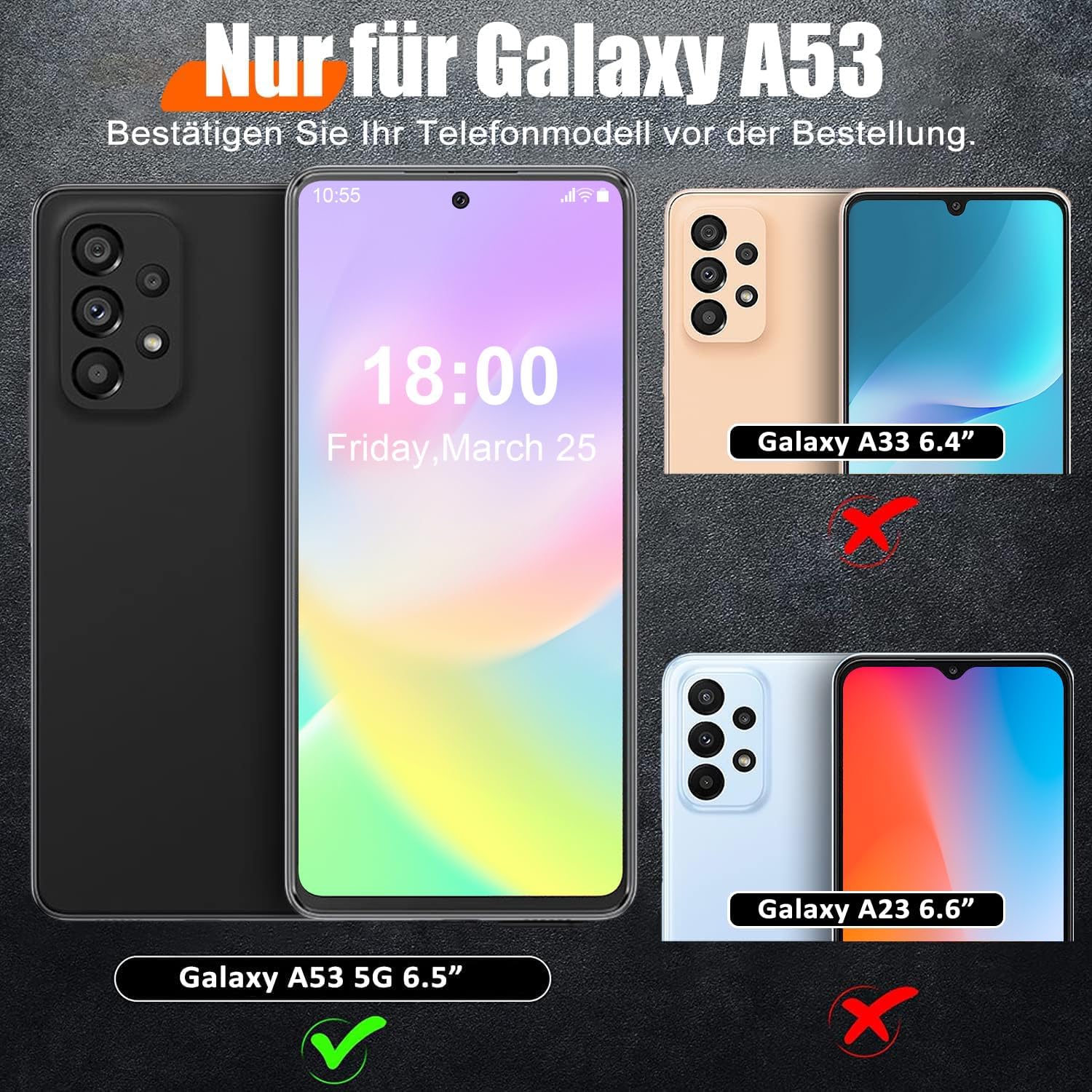• Съвместимост: Кейс Giyer, съвместим със Samsung Galaxy A53 5G (не A52/A52S) и протектор за екран от закалено стъкло, 1 брой. Моля, свалете калъфа на телефона по време на безжично зареждане. Удароустойчива защита. Кейс за мобилен телефон, незалепващ, с пръстови отпечатъци, абсорбиращ удари, предпазващ от падане ръб, с функция за стойка, устойчив на надраскване.