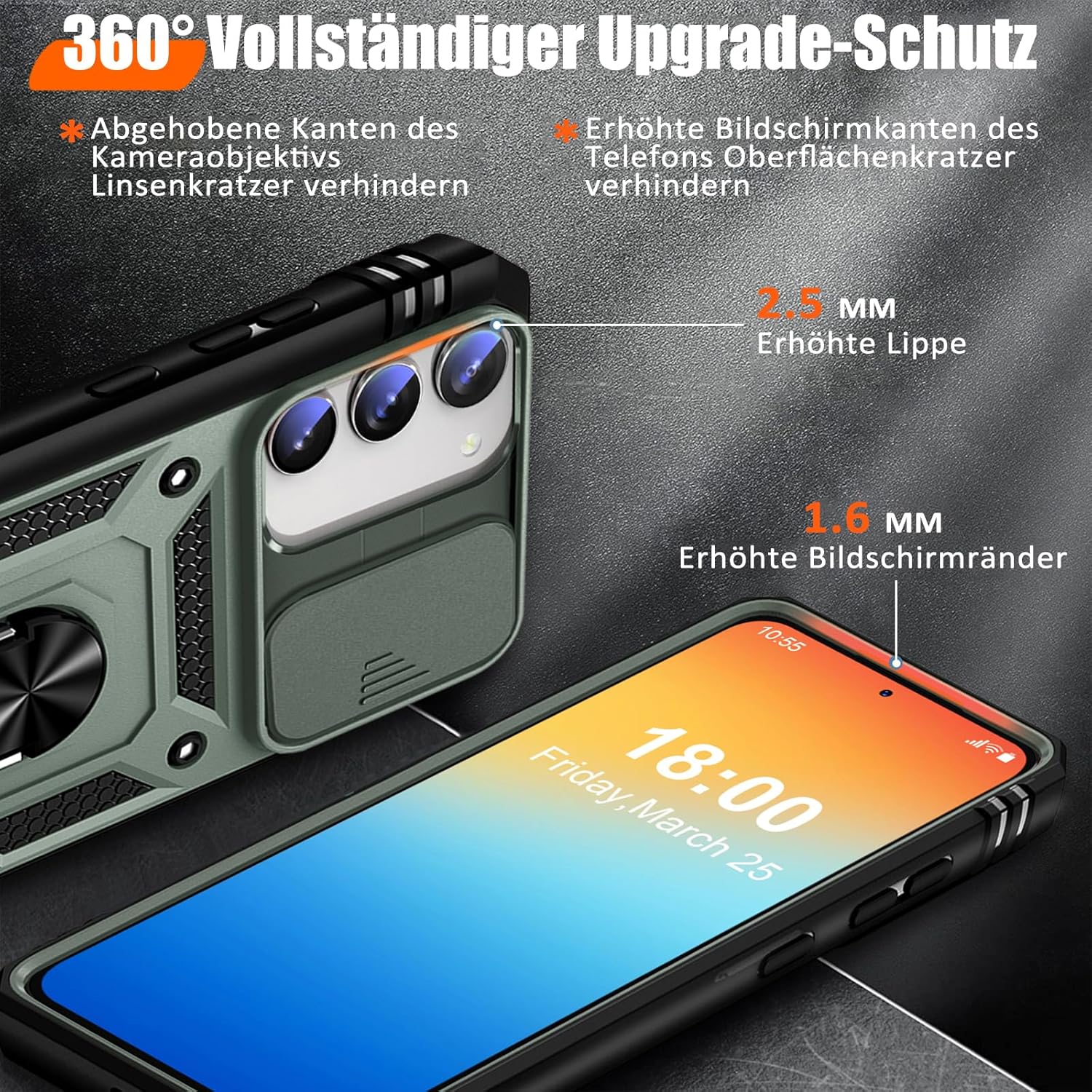 • Защита от военен клас: калъфът за Galaxy S25 използва уникален TPU с ръбове в комбинация с вградени PC 2-в-1 затваряния, за да предпази телефона ви от падания, драскотини и удари. Защитата от военен клас с технология с въздушна възглавница осигурява цялостна защита за вашето оборудване. Дизайн с плъзгач на обектива: Повдигната рамка за защита на камерата. Капачката покрива обектива и го предпазва от прах и драскотини.