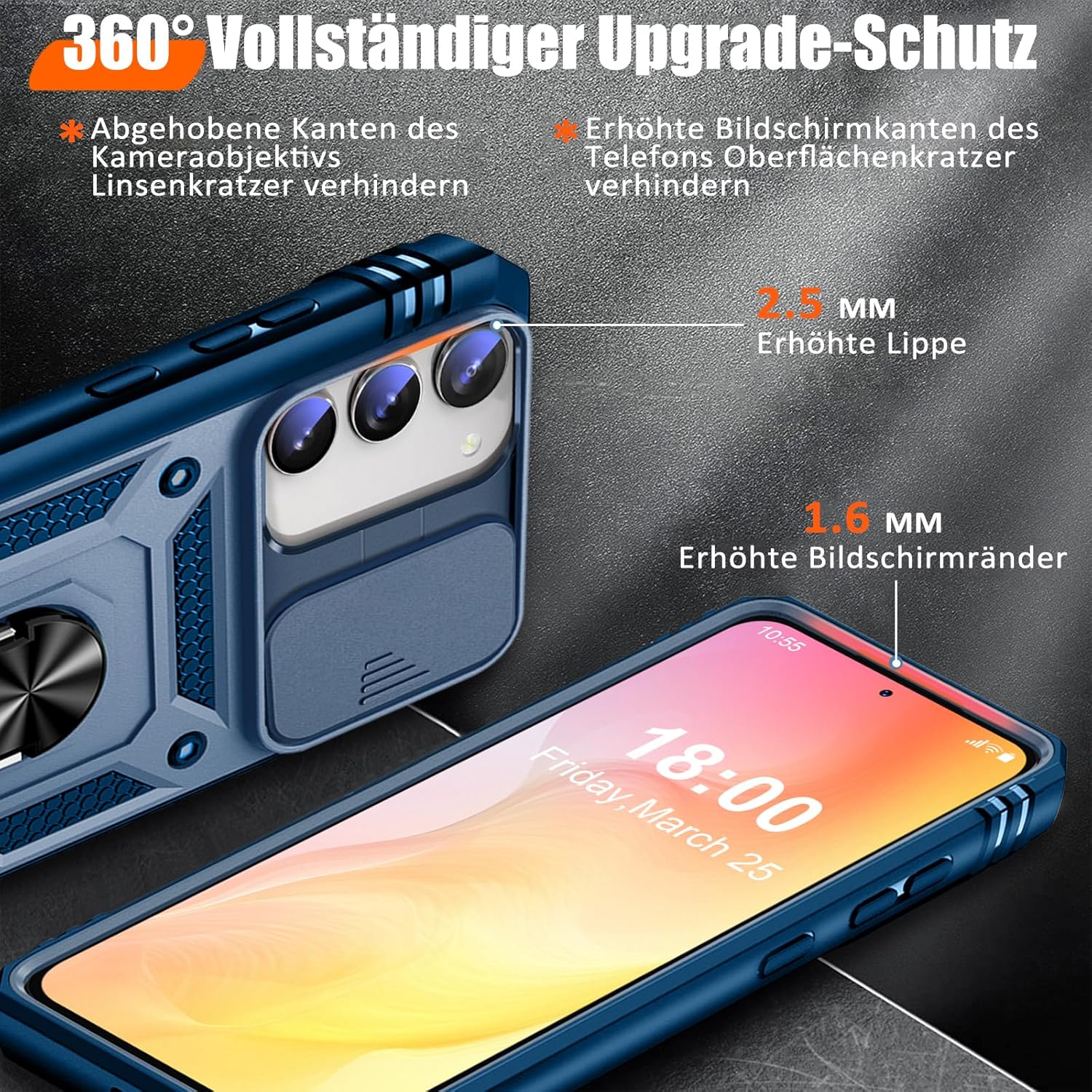 • Защита от военен клас: калъфът за Galaxy S25 използва уникален TPU с ръбове в комбинация с вградени PC 2-в-1 затваряния, за да предпази телефона ви от падания, драскотини и удари. Защитата от военен клас с технология с въздушна възглавница осигурява цялостна защита за вашето оборудване. Дизайн с плъзгач на обектива: Повдигната рамка за защита на камерата. Капачката покрива обектива и го предпазва от прах и драскотини.