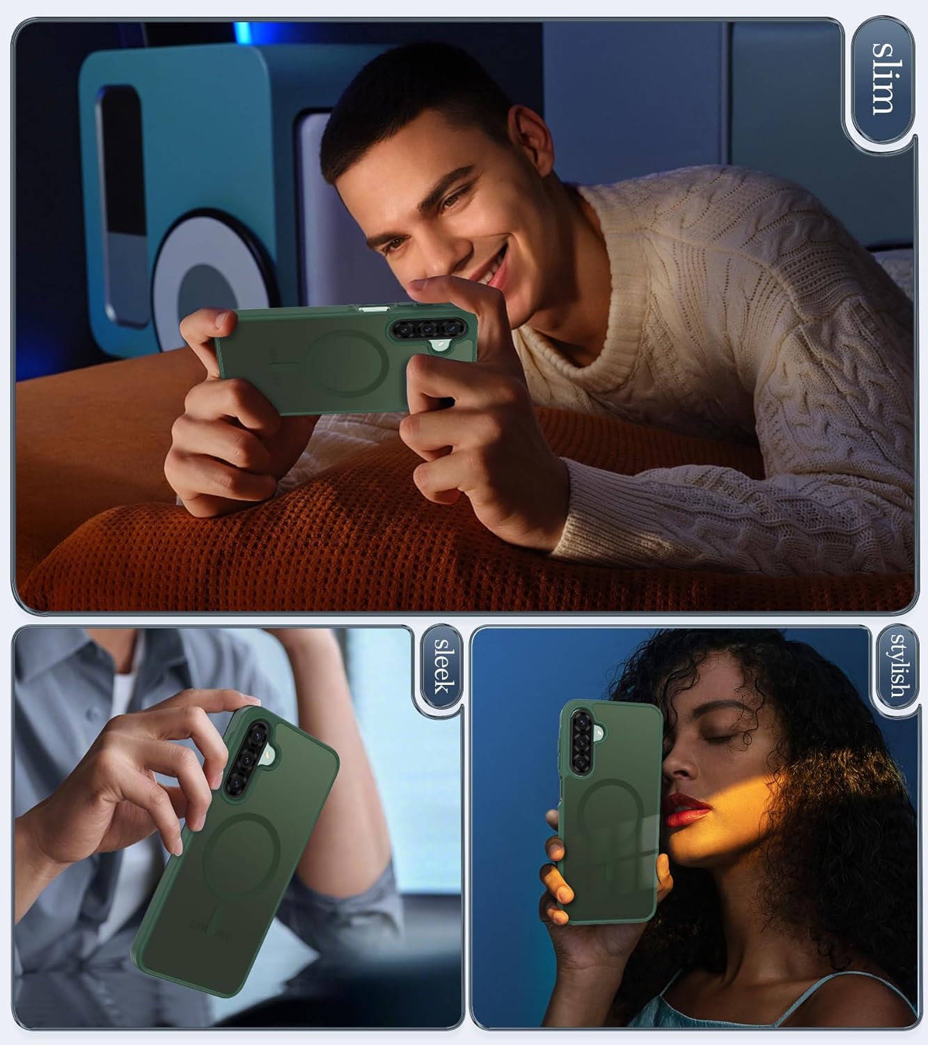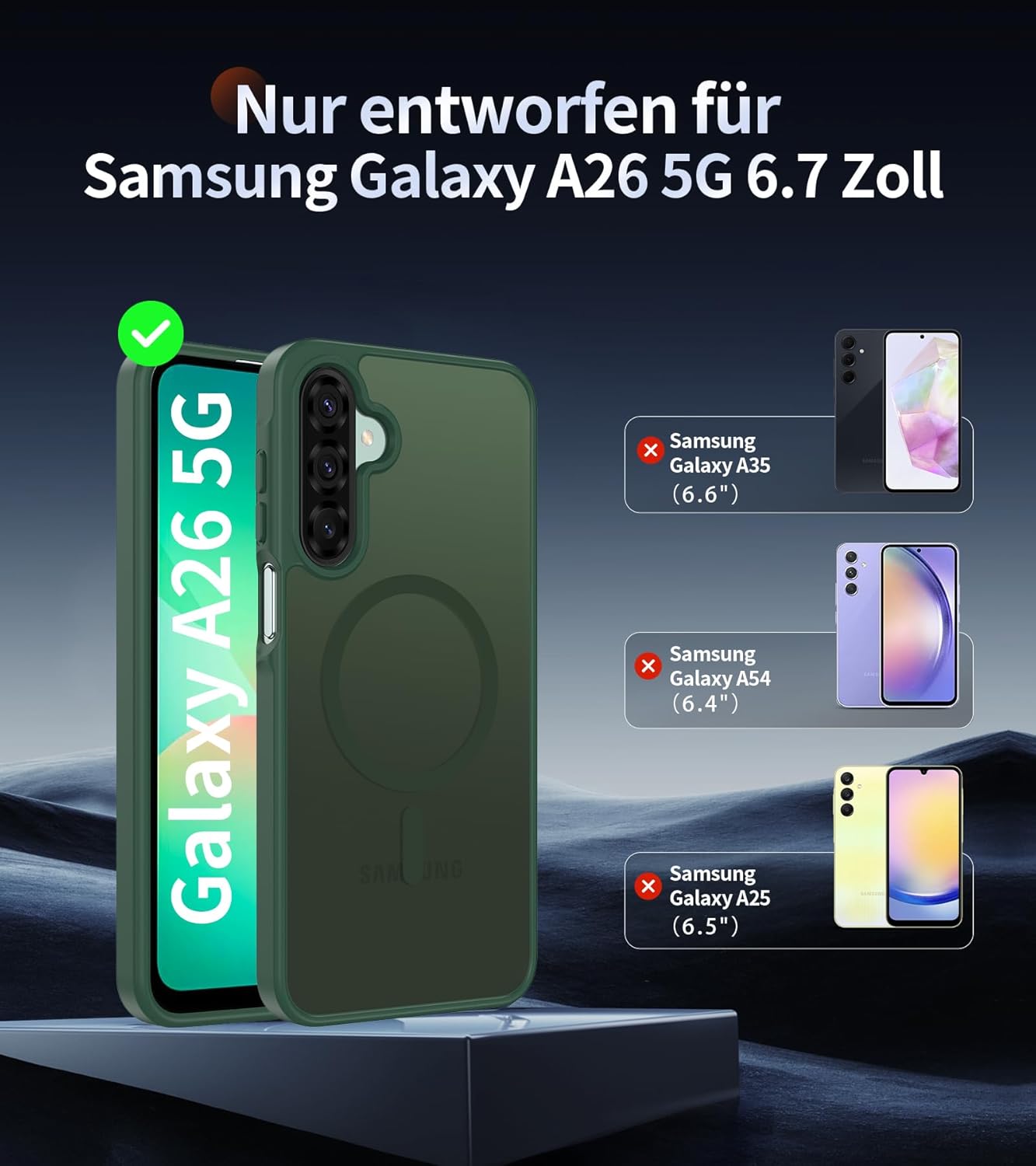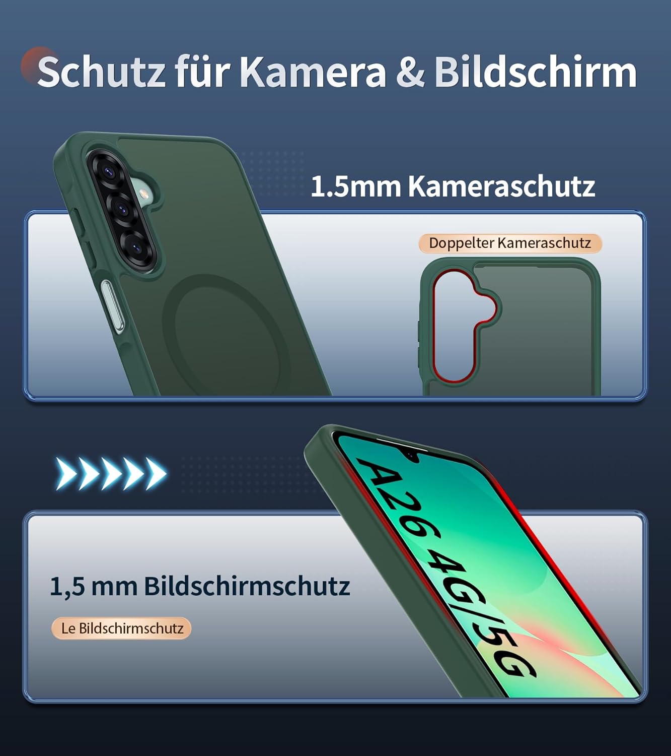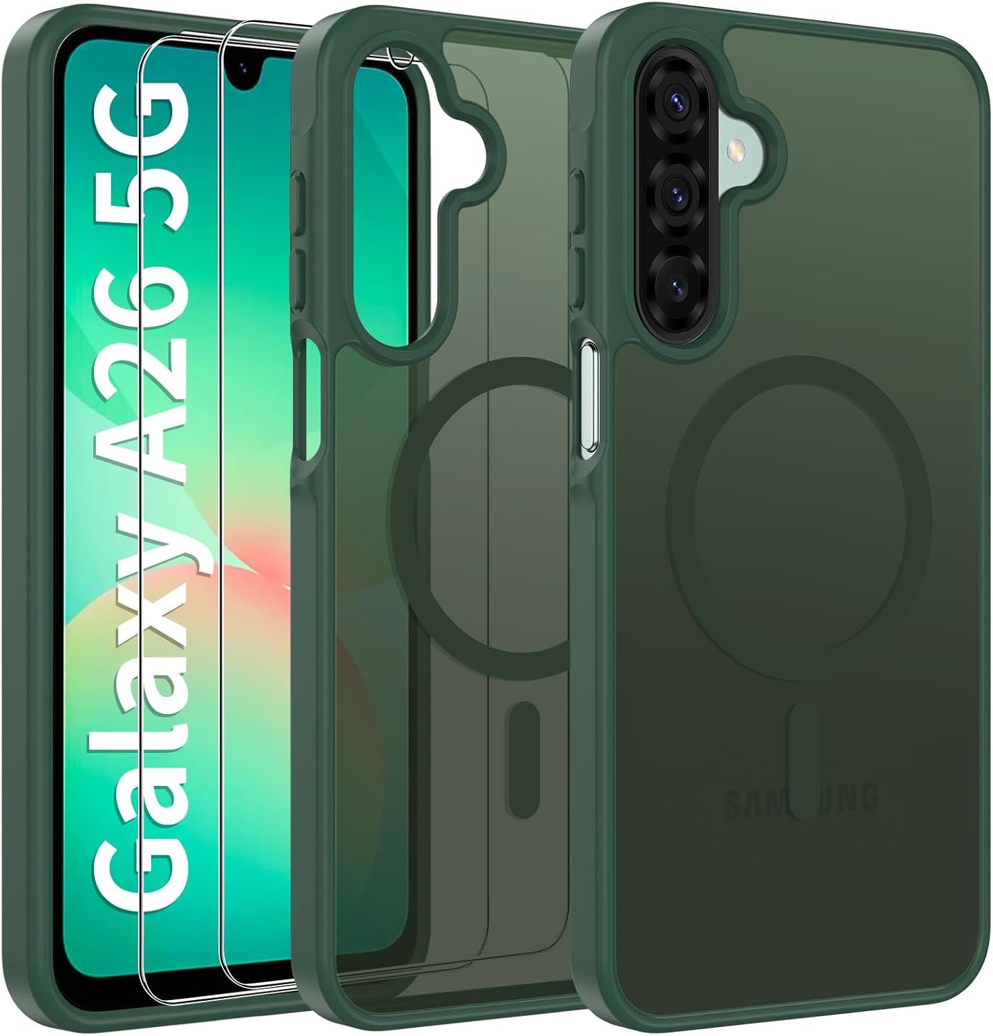 Кейс за Samsung Galaxy A26 5G, съвместим с MagSafe с 2 протектора за екран, военна стандартна защита, калъф за мобилен телефон, удароустойчив, прозрачен матов защитен калъф, тъмнозелен
