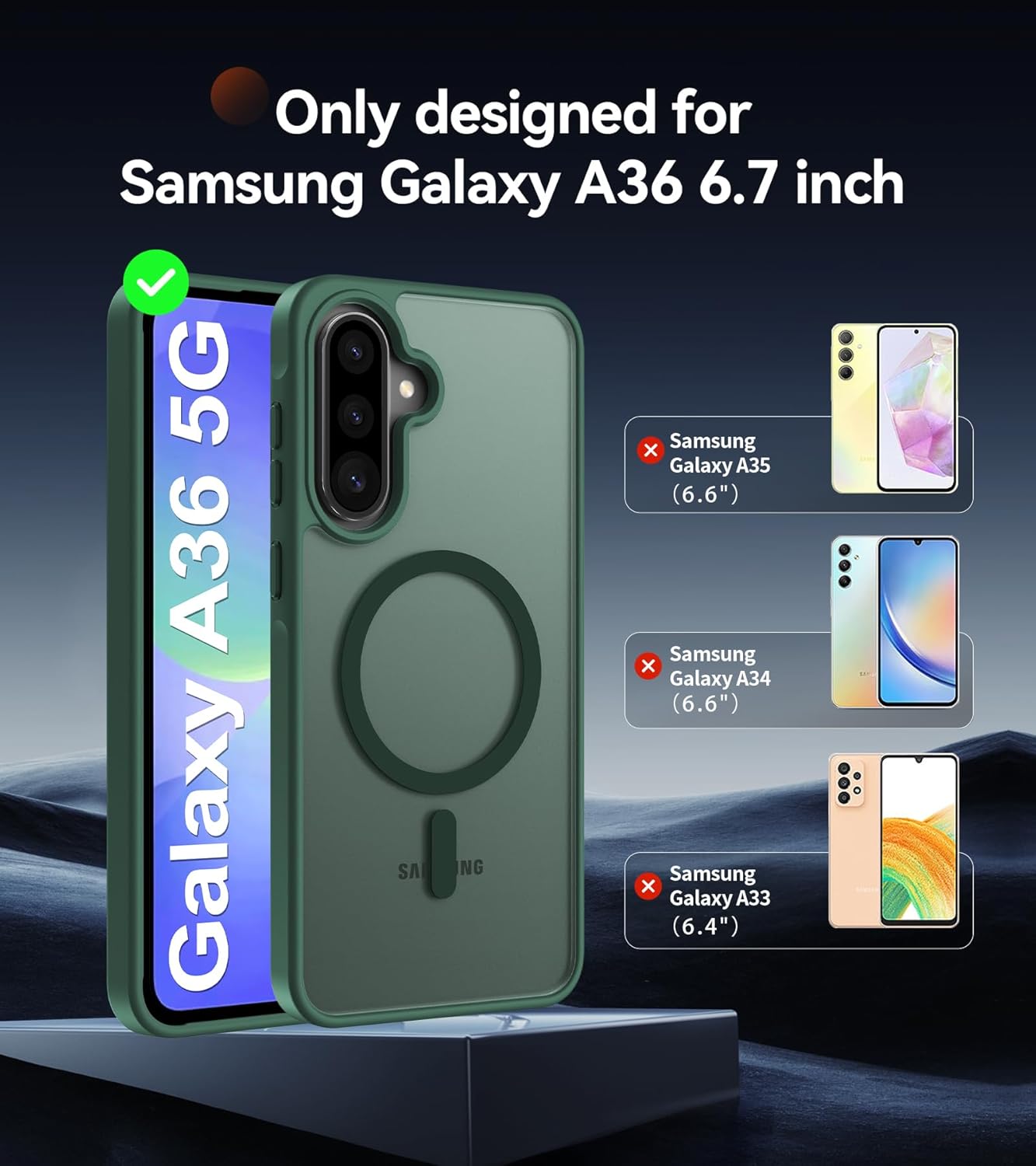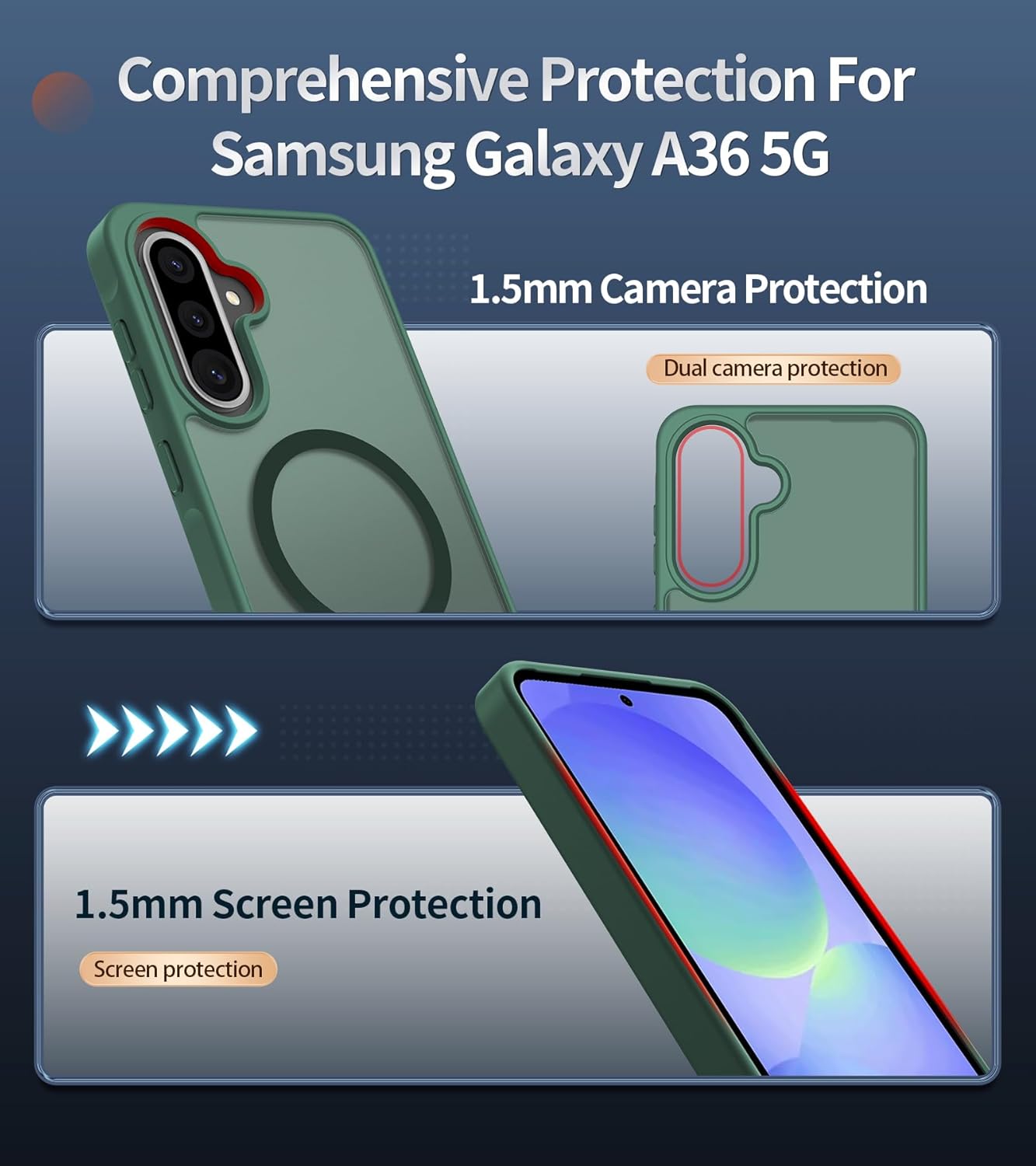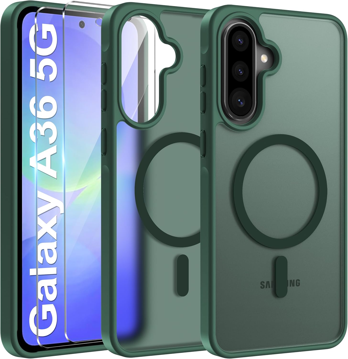 Кейс за Samsung Galaxy A36 5G, съвместим с MagSafe с 2 протектора за екран, военен стандарт за защита, калъф за мобилен телефон, удароустойчив, прозрачен матов защитен калъф, зелен