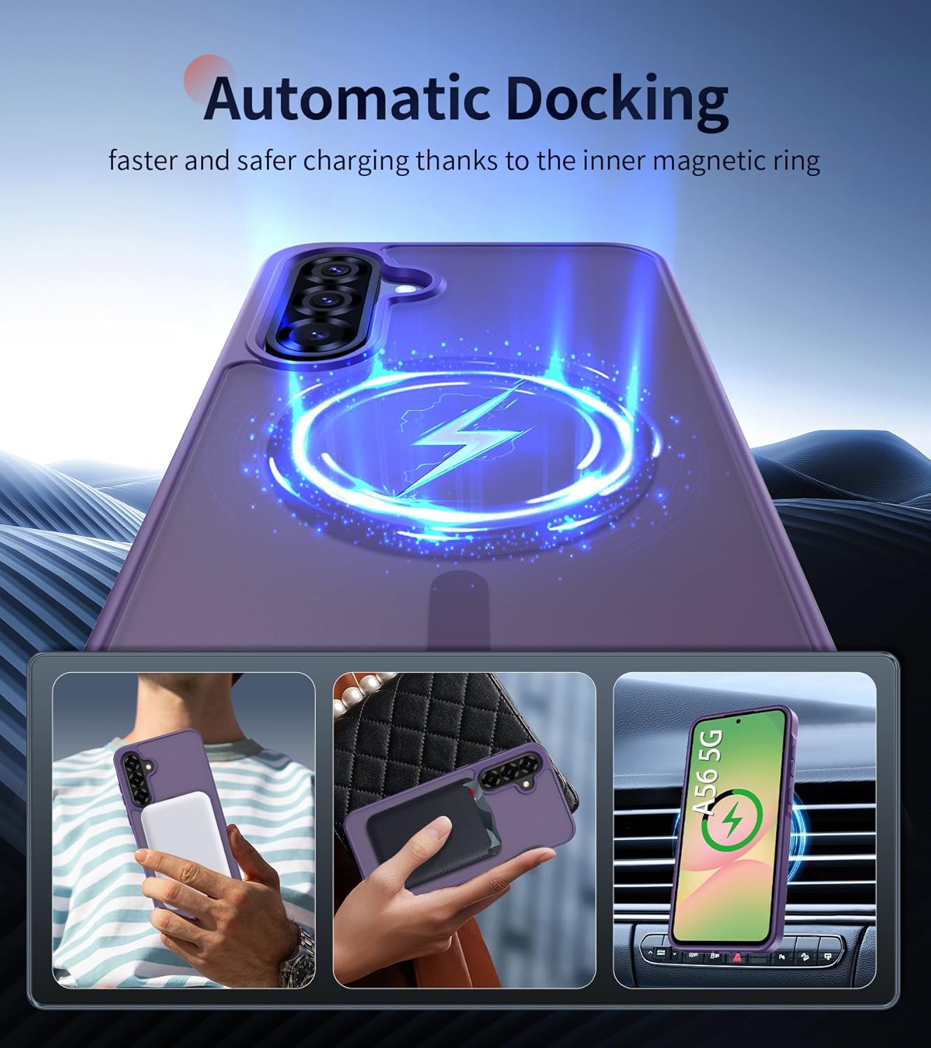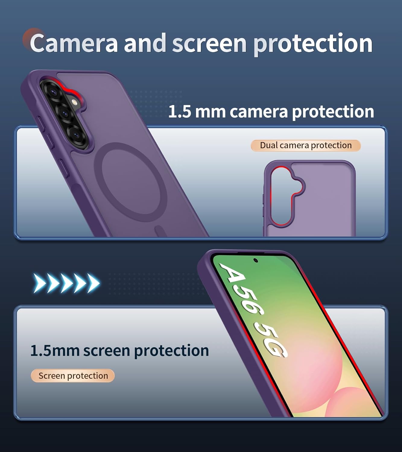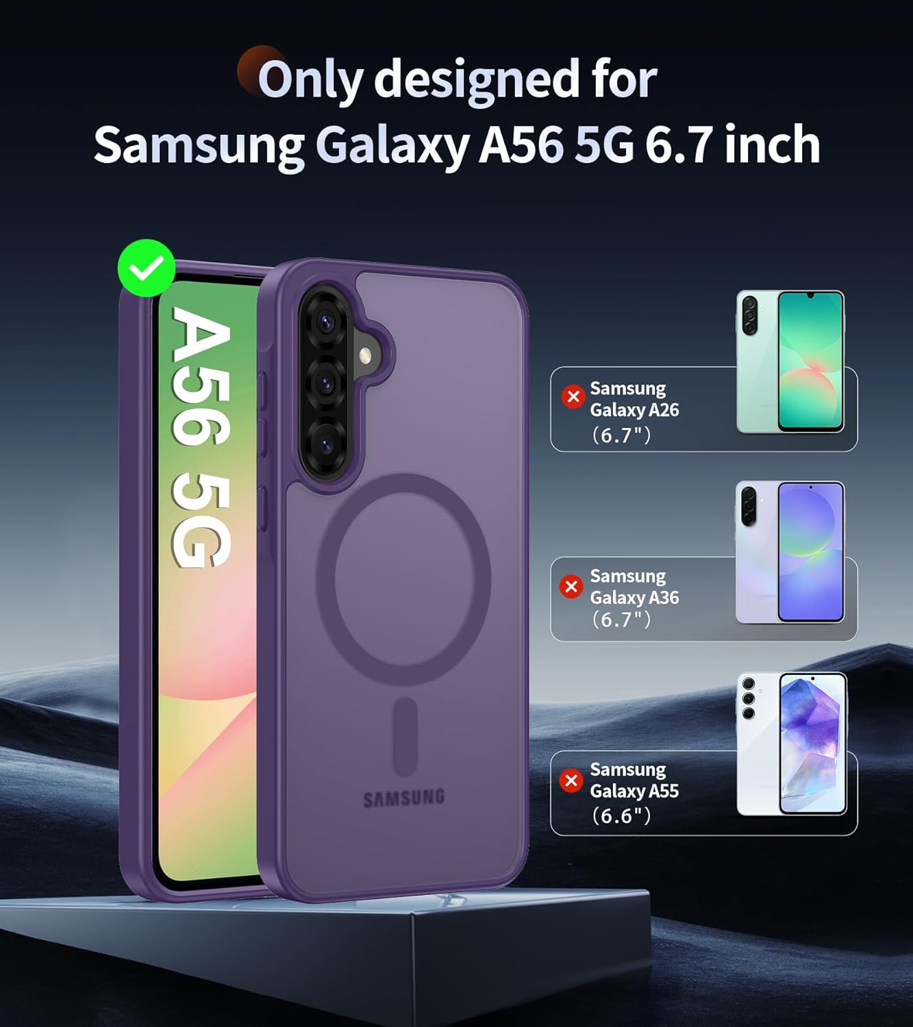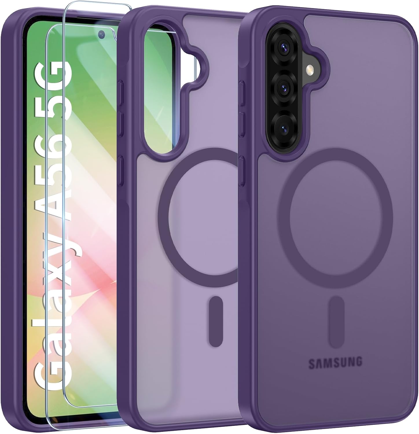 Кейс за Samsung Galaxy A56 5G, съвместим с MagSafe с 2 протектора за екран, военен стандарт за защита, калъф за мобилен телефон, удароустойчив, прозрачен матов защитен калъф, тъмно лилав