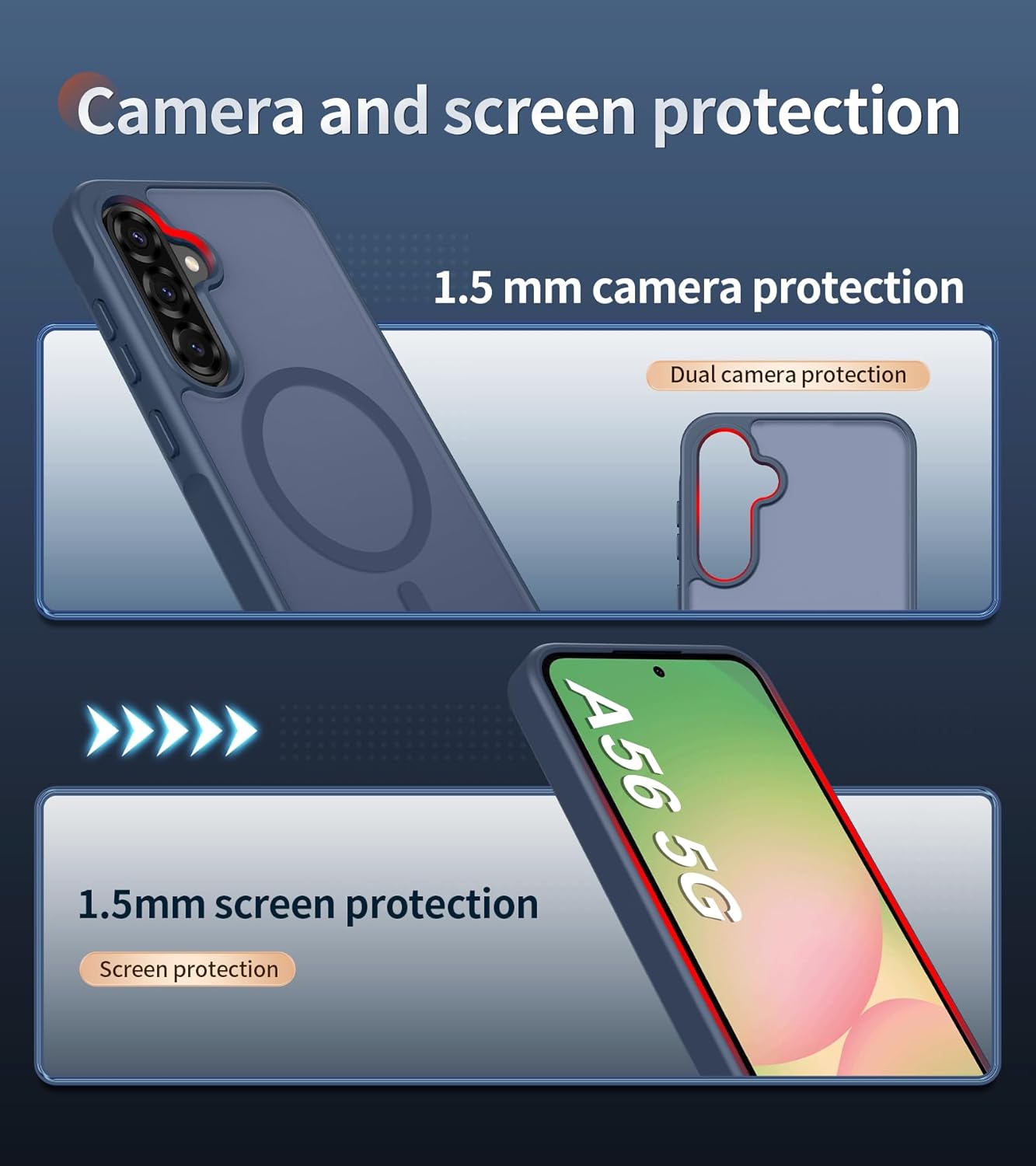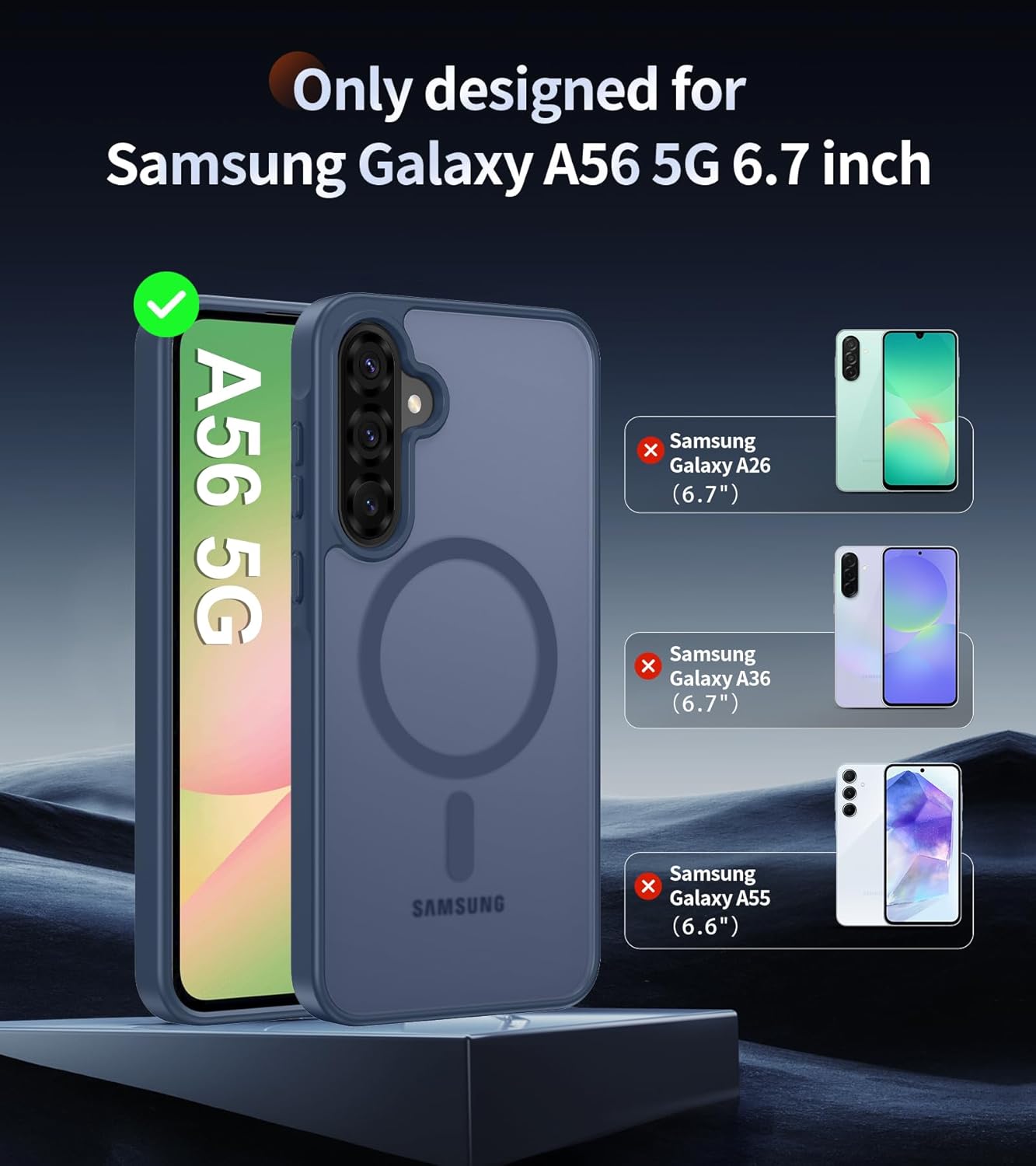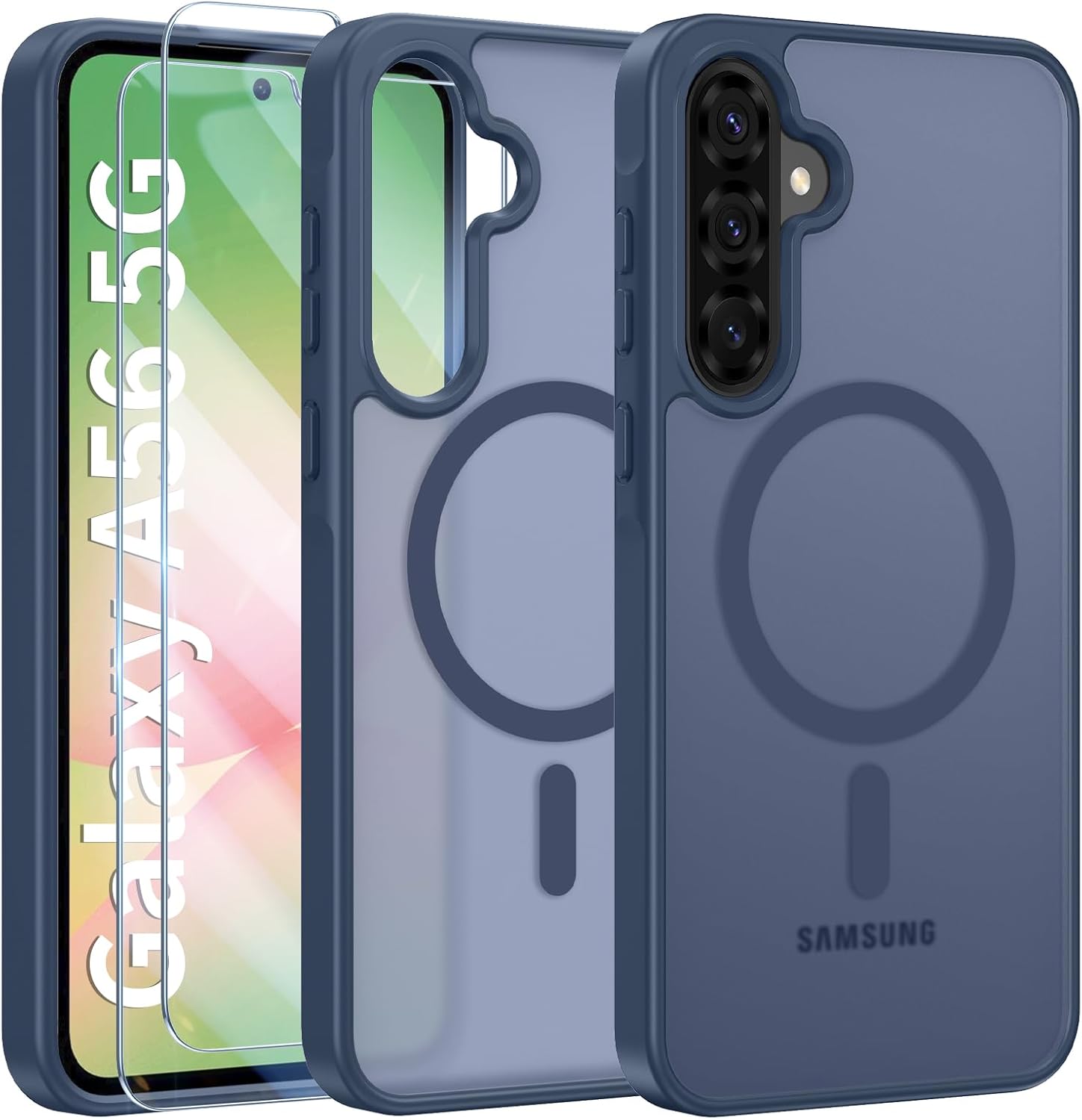 Кейс за Samsung Galaxy A56 5G, съвместим с MagSafe с 2 протектора за екран, военна стандартна защита, калъф за мобилен телефон, удароустойчив, прозрачен матов защитен калъф, тъмносин