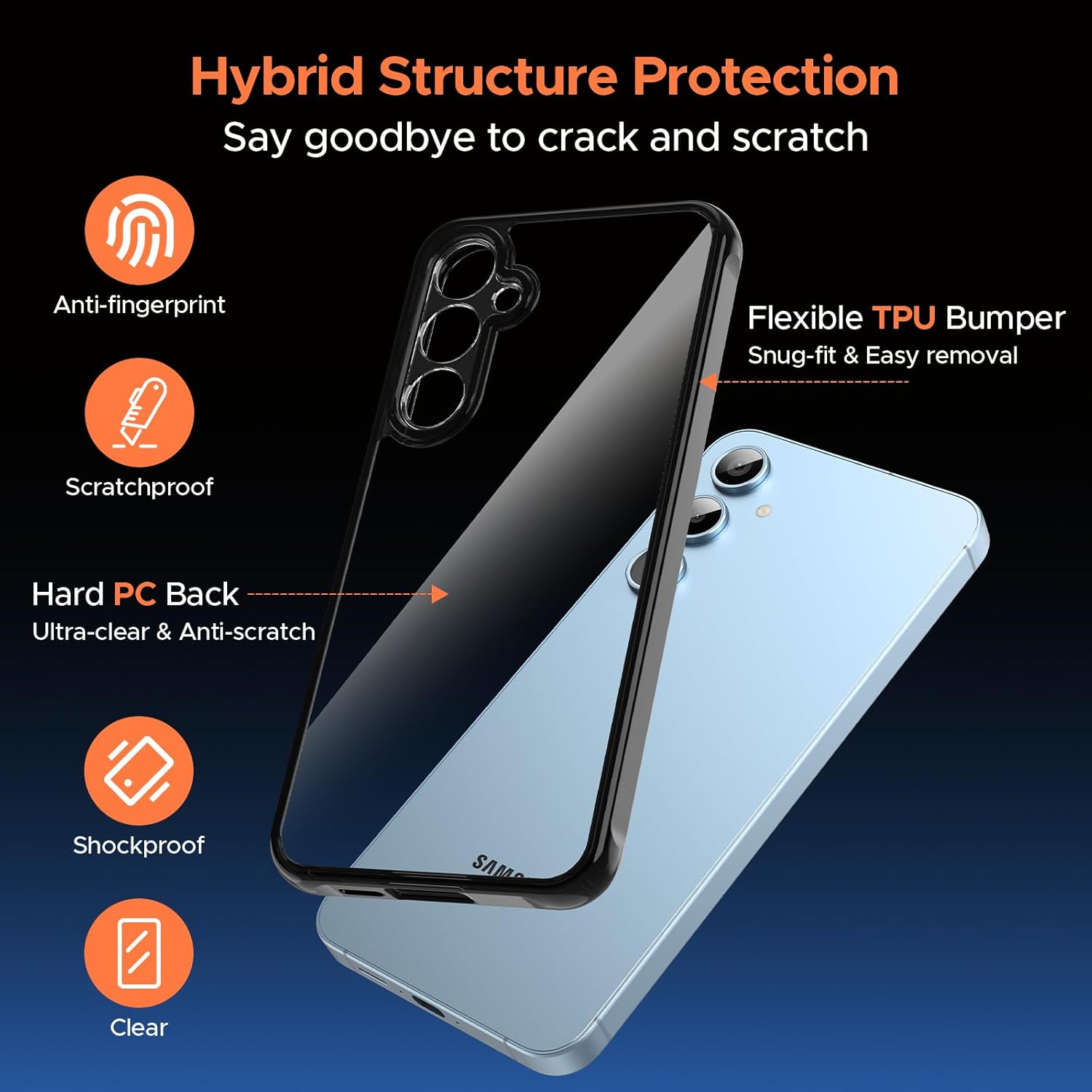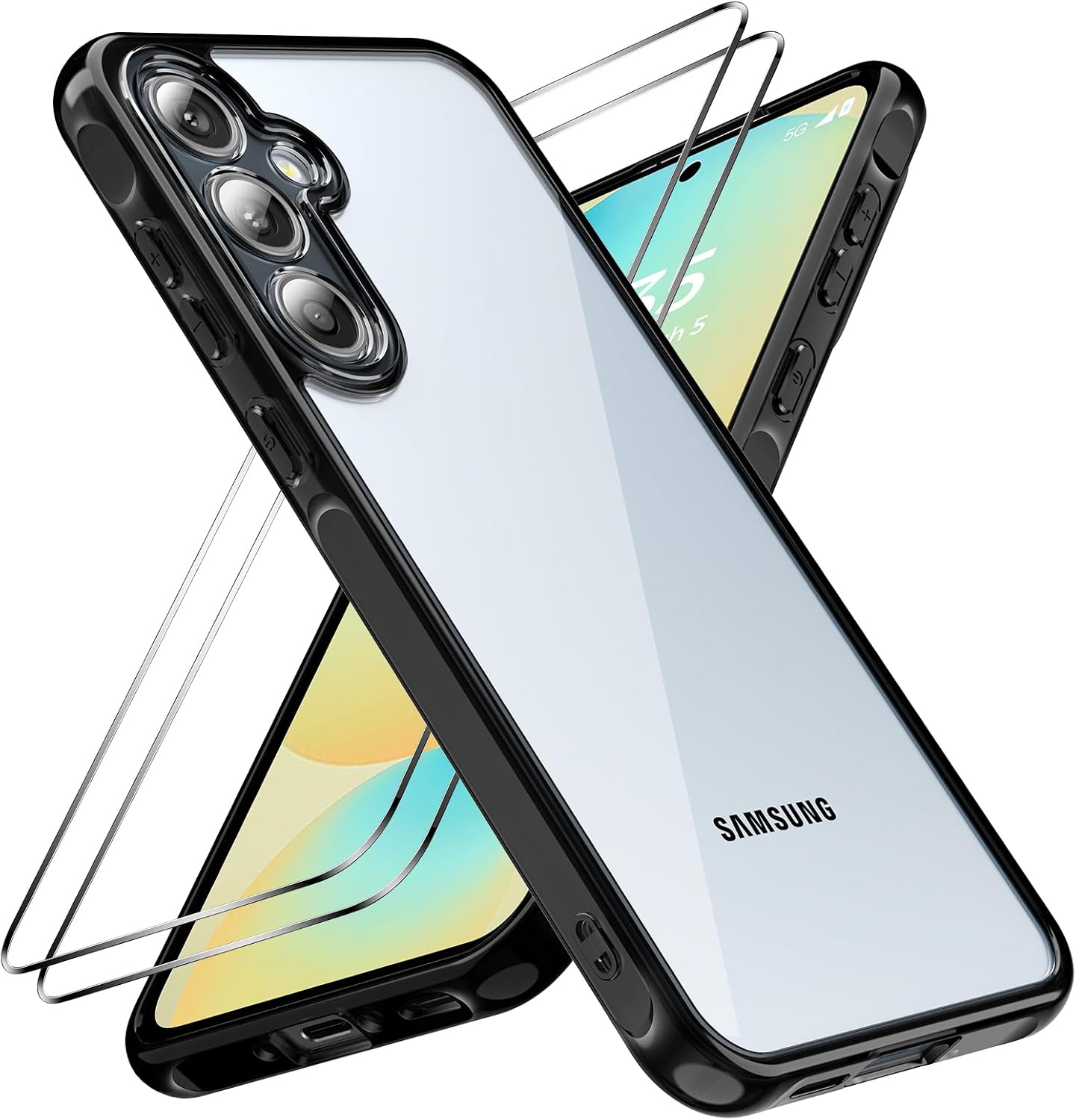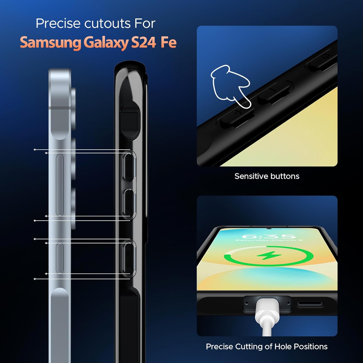 Кейс за Samsung Galaxy S24 FE 5G с 2 части защитно стъкло от закалено стъкло, [Защита на камерата] [Удароустойчив] Кейс за мобилен телефон, Черна TPU рамка + Прозрачен PC гръб, Против пръстови отпечатъци