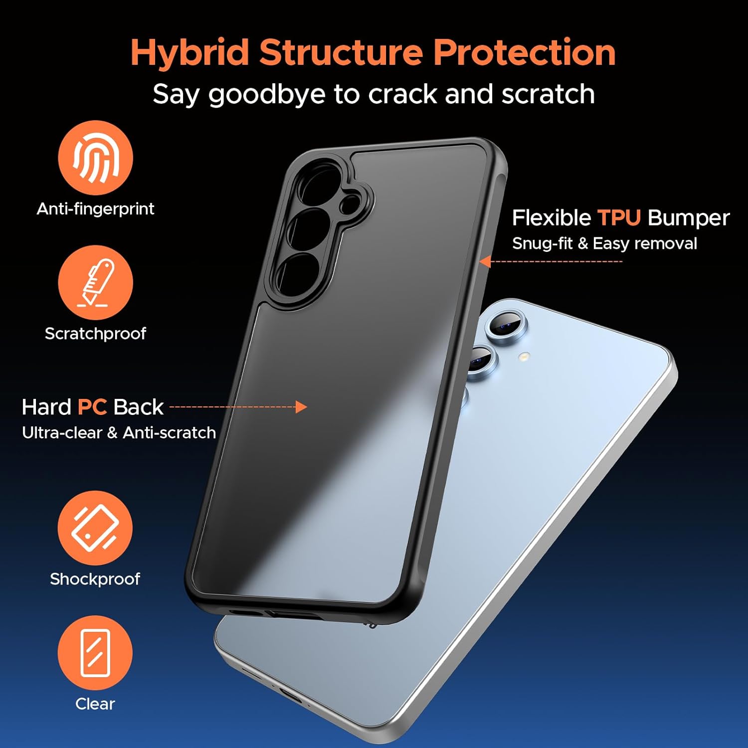 Кейс за Samsung Galaxy S24 FE 5G с 3 части закалено стъкло [Защита на камерата] [Удароустойчив] Калъф за мобилен телефон, Матов прозрачен гръб, Защитен калъф против пръстови отпечатъци, Черен