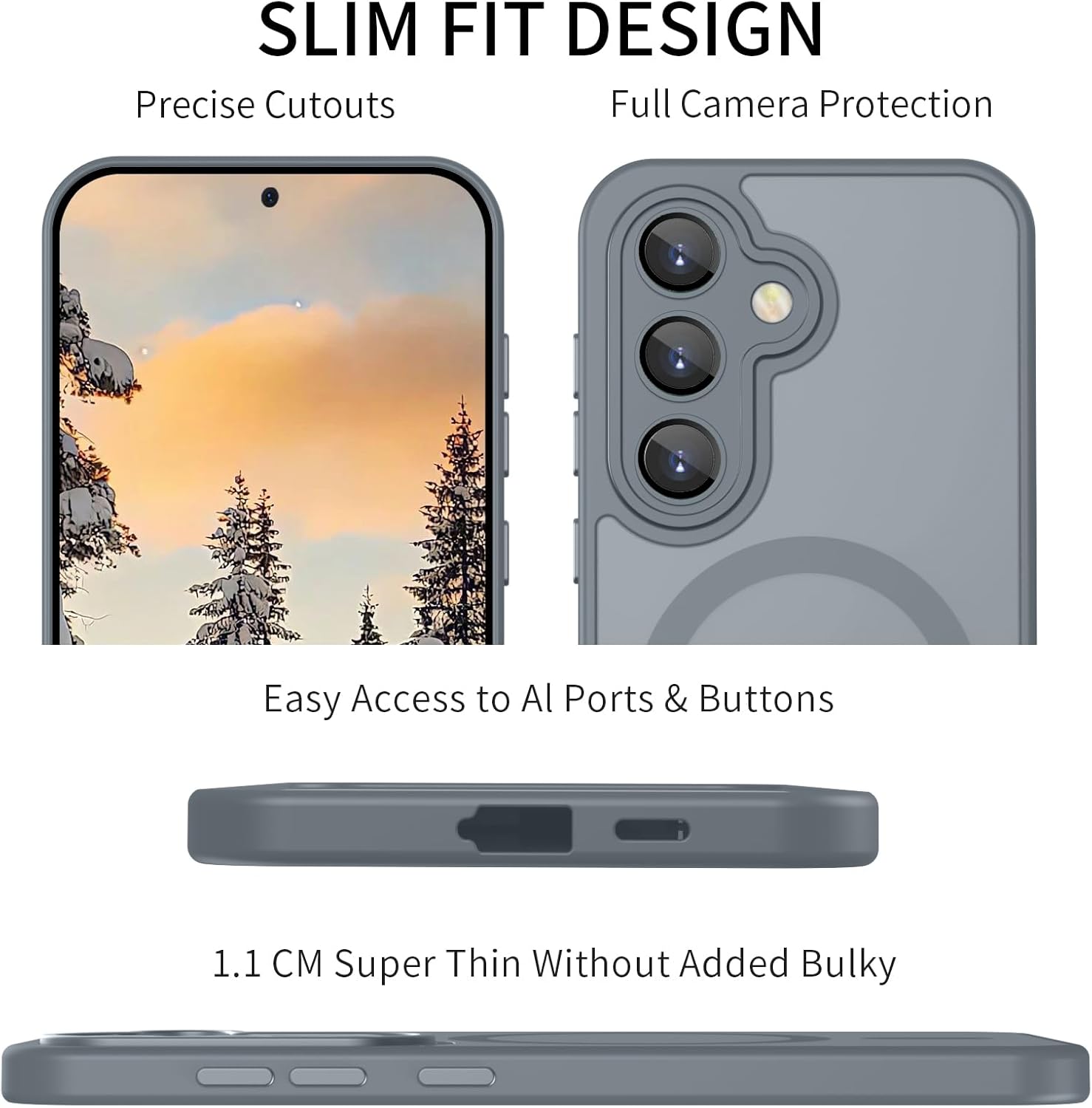 • Slim fit дизайн: стилният, тънък дизайн и мекият защитен материал осигуряват адекватна защита за вашия Samsung Galaxy S24 от драскотини, удари, пръстови отпечатъци и замърсявания. Вграденият мощен магнит позволява по-бързо и лесно безжично зареждане и сигурно закрепване към магнитни аксесоари. Също така перфектно се съчетава с други магнитни аксесоари.