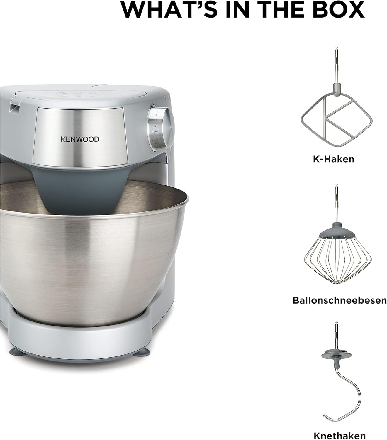Kenwood KHC29.A0SI Планетария машина за месене Prospero + 1.5 галона стоманена купа с 3 инструмента за смесване, мощност 1000 вата, система за безопасност, неплъзгащи се крачета, сребриста