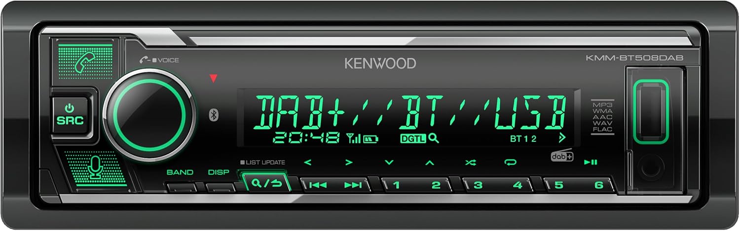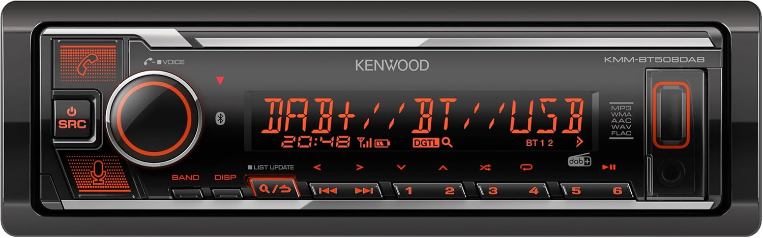 Kenwood KMM-BT508DAB USB автомобилно радио с DAB+ и Bluetooth комплект за свободни ръце (Amazon Alexa, звуков процесор, USB, AUX, 2 x Pre-Out 2.5 V, 4 x 50 Watt, VAR осветление, включва DAB+ антена)