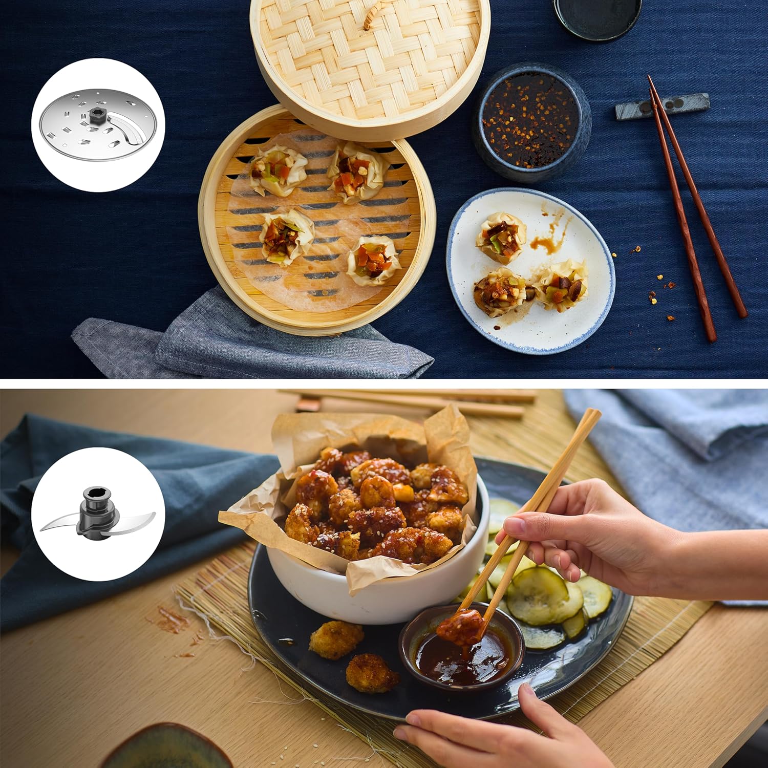 • Универсален: този компактен кухненски робот е вашата дясна ръка при готвене, подходящ е за рязане, настъргване, пюриране и дори месене на тесто